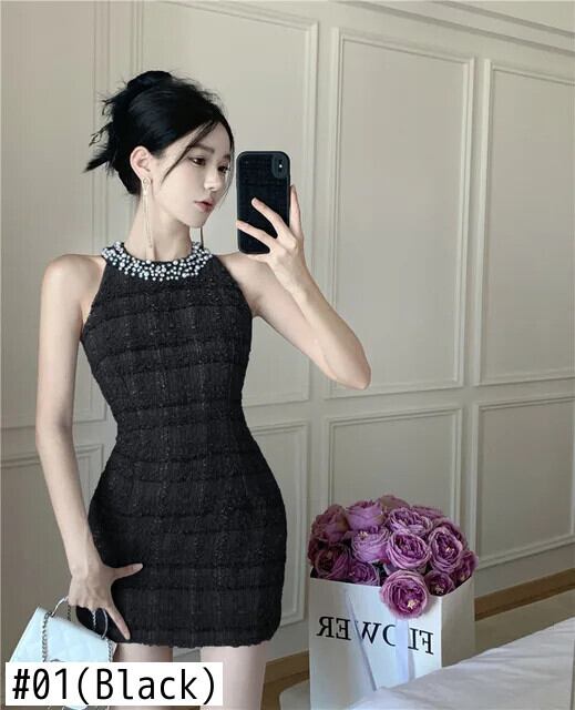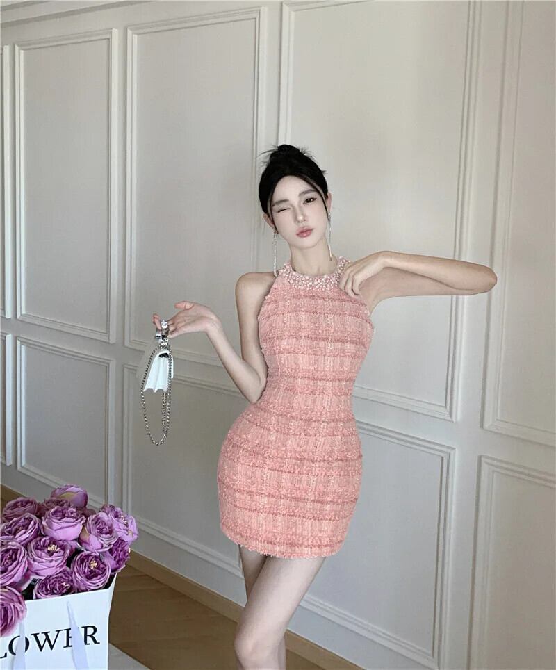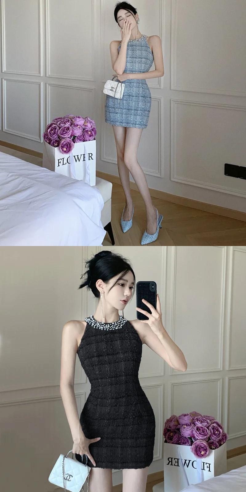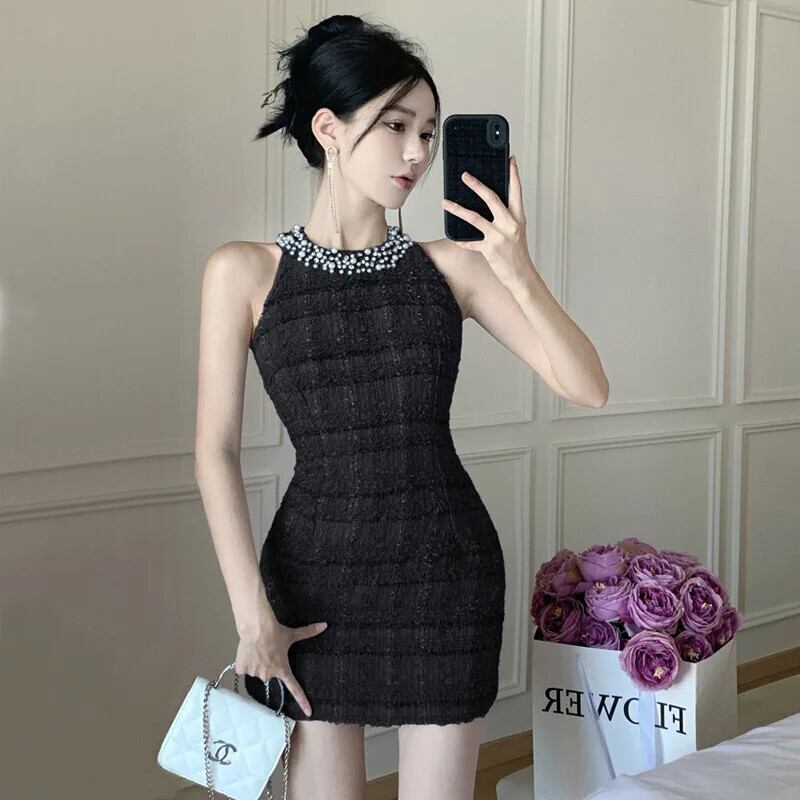 夏セクシー香りノースリーブハンギングネックチェック柄ミニパーティービーズツイードドレス サマー 夏物