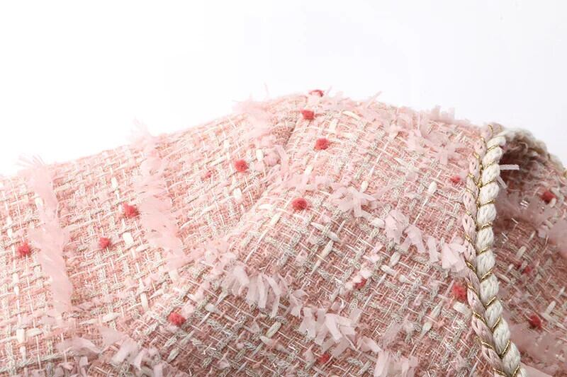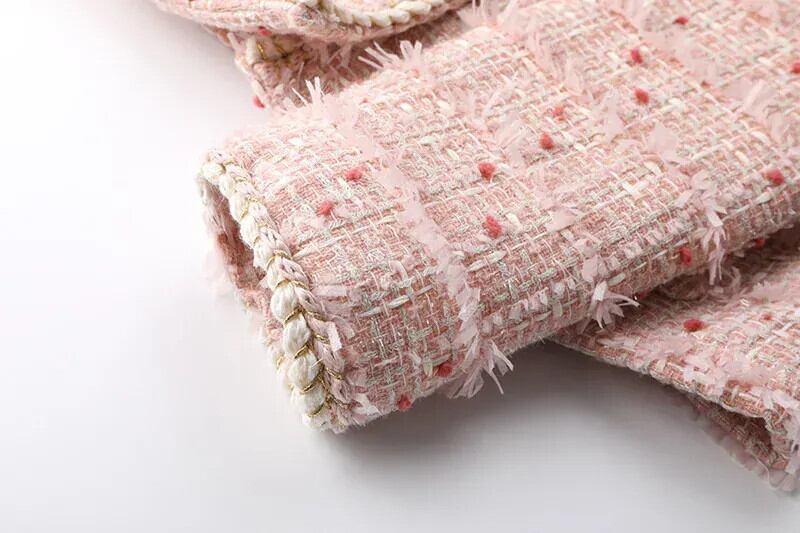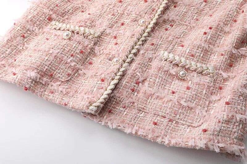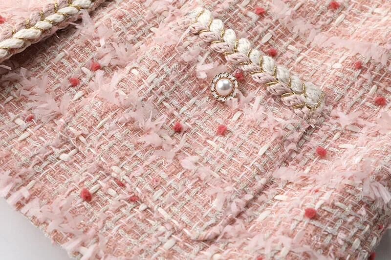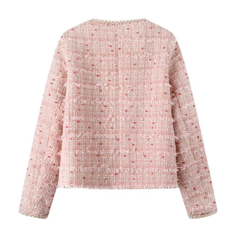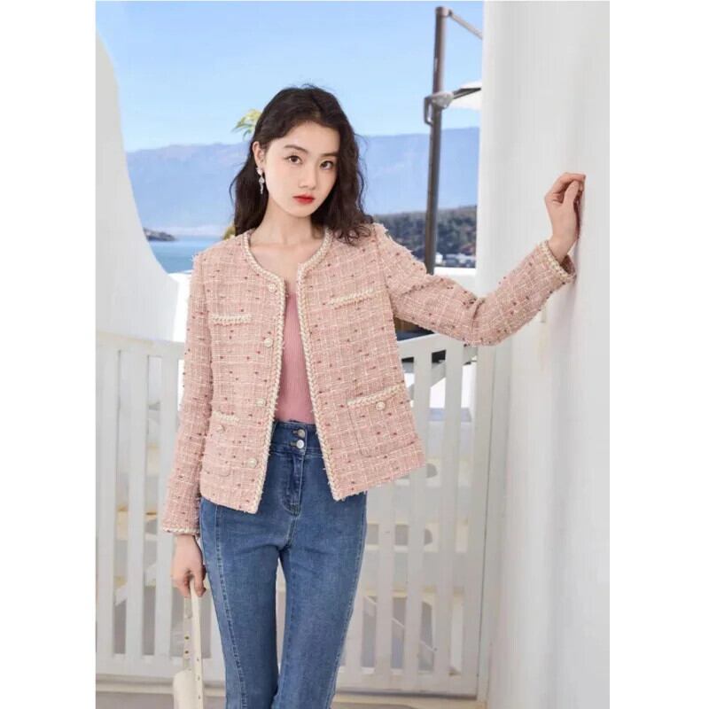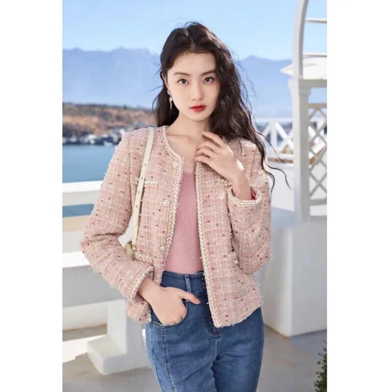 O ネック ポケット クロップド ジャケット ビジネス ランウェイ レディース ピンク フレグランス ショート ツイード コート Oネック