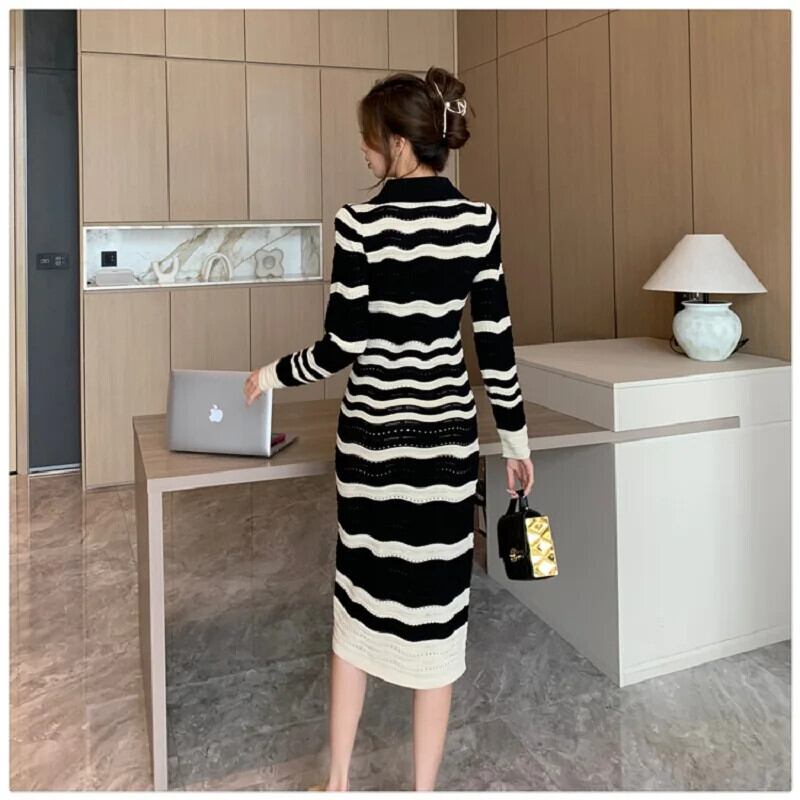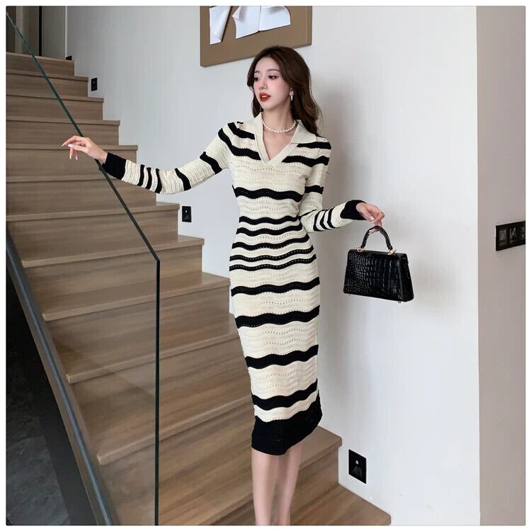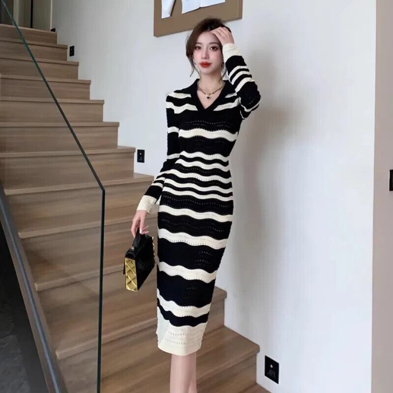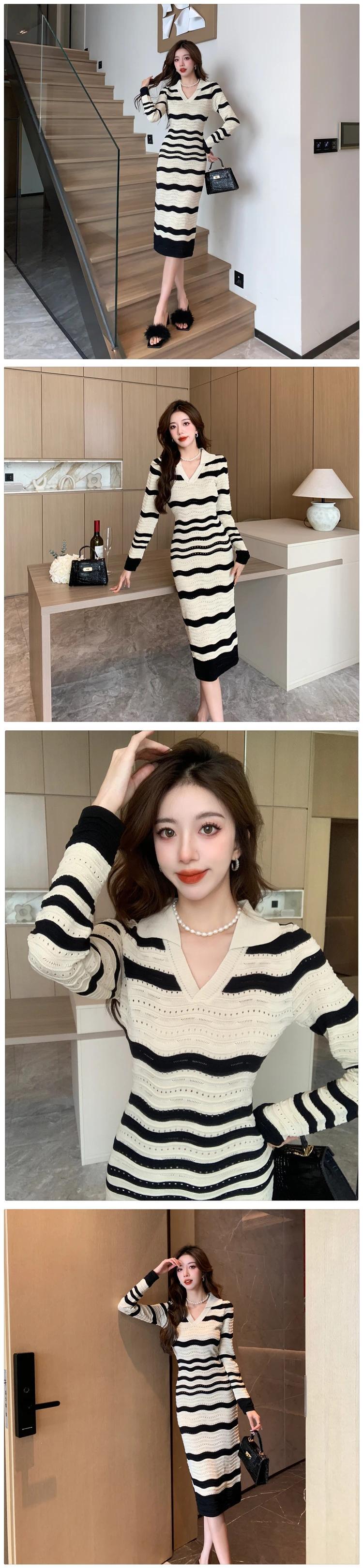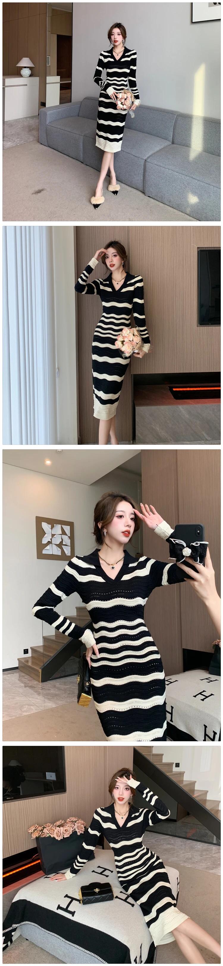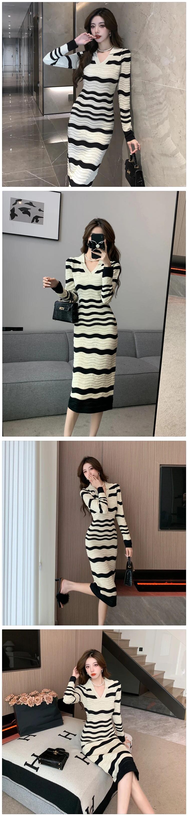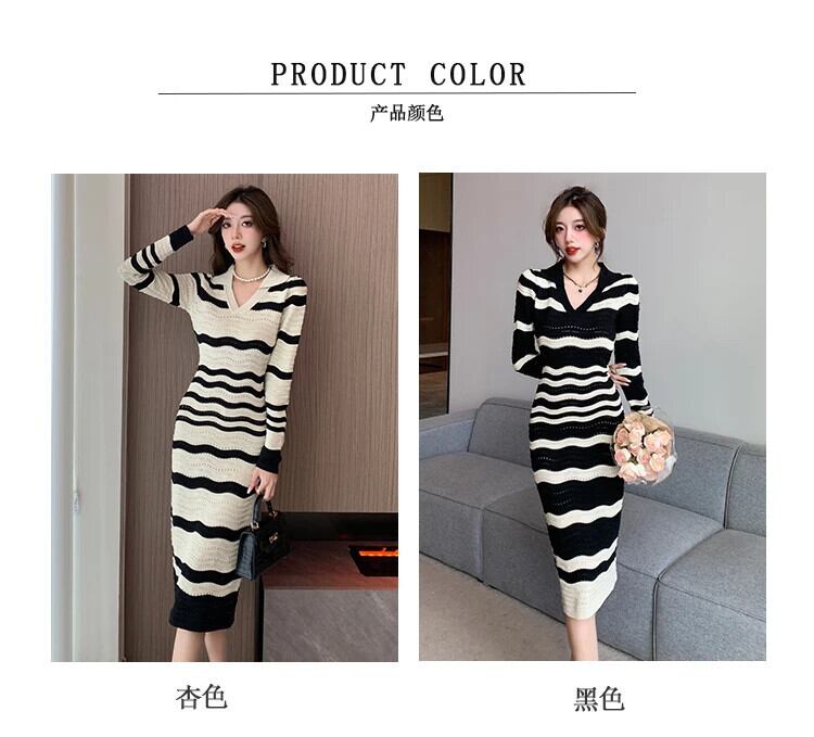 レディース秋冬スタイル V ネック長袖シック裏地ストライプ ニットワンピース ロング オータム 秋物 ウィンター 冬物 Vネック
