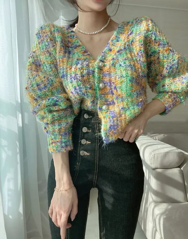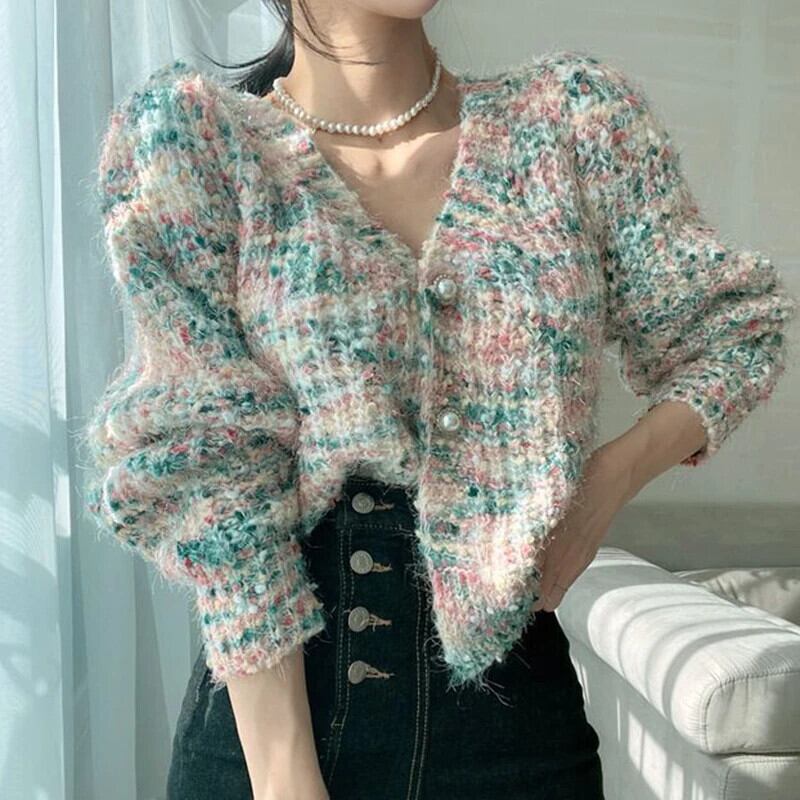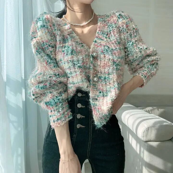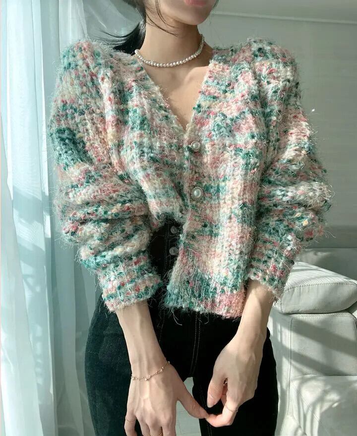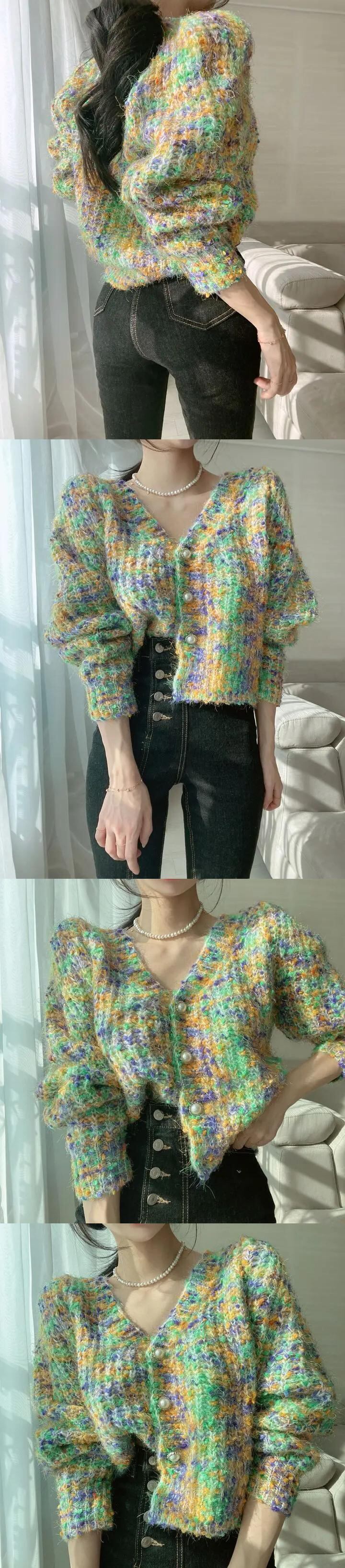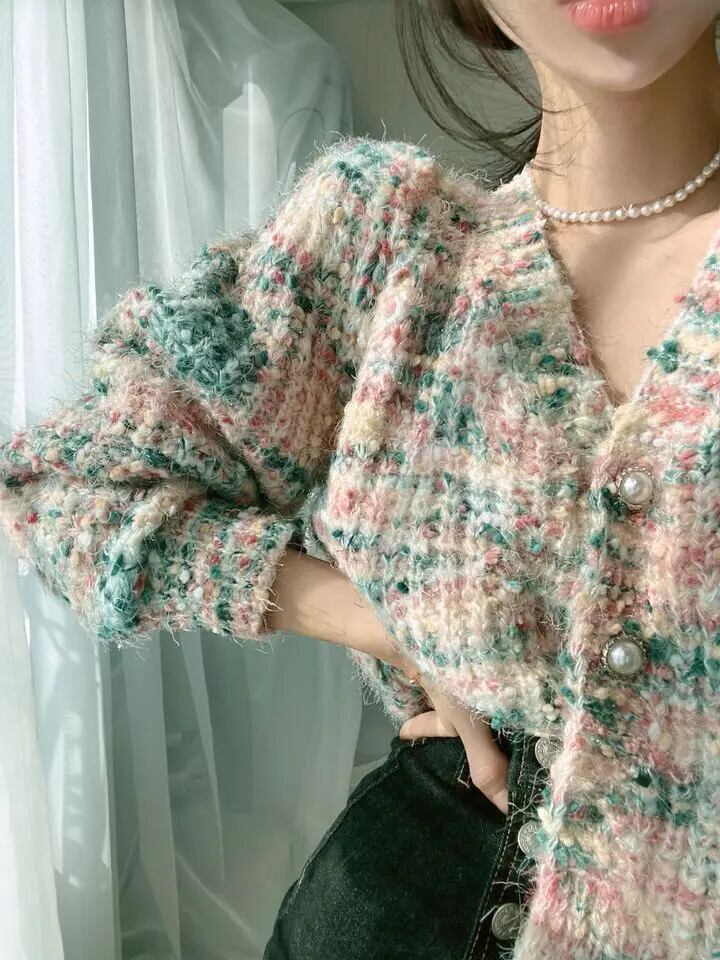 秋冬甘い V ネックユニークパールボタン長袖キャンディミックスカラーニットセーター ロング 大人ガーリー スウィート キュート カジュアル オータム 秋物 ウィンター 冬物 Vネック 真珠