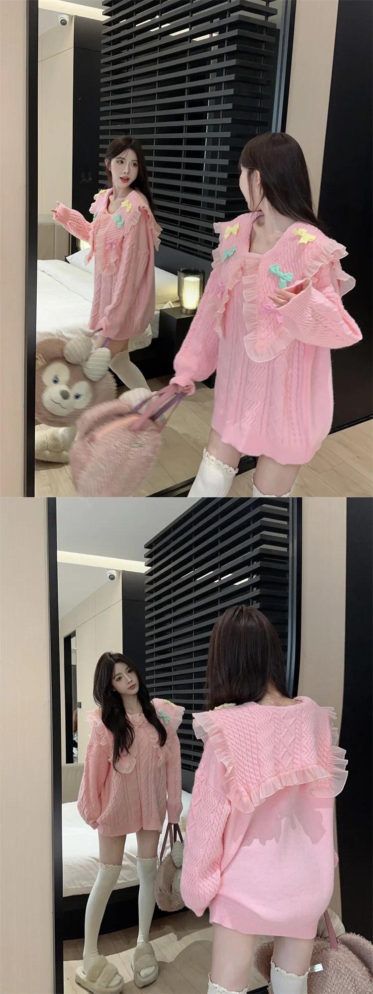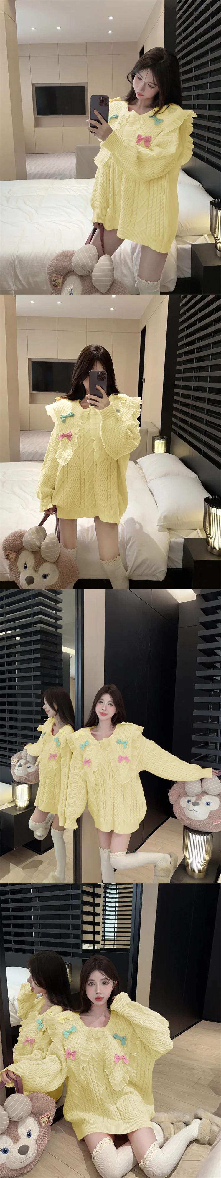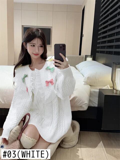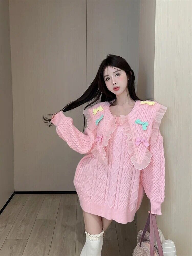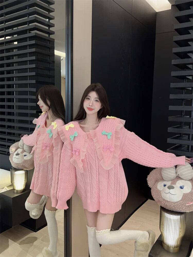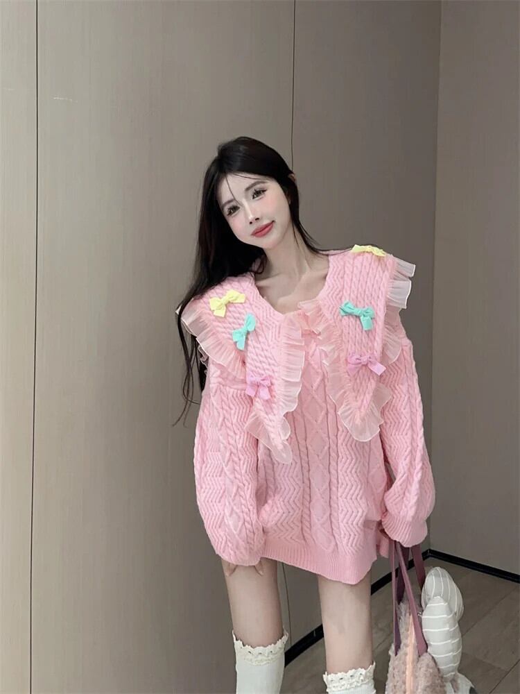 甘いネイビーカラーメッシュスプライスレースリボン女子秋/冬ルーズニットセーター 大人ガーリー スウィート キュート カジュアル オータム 秋物 ウィンター 冬物