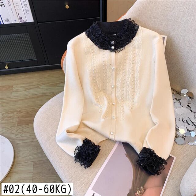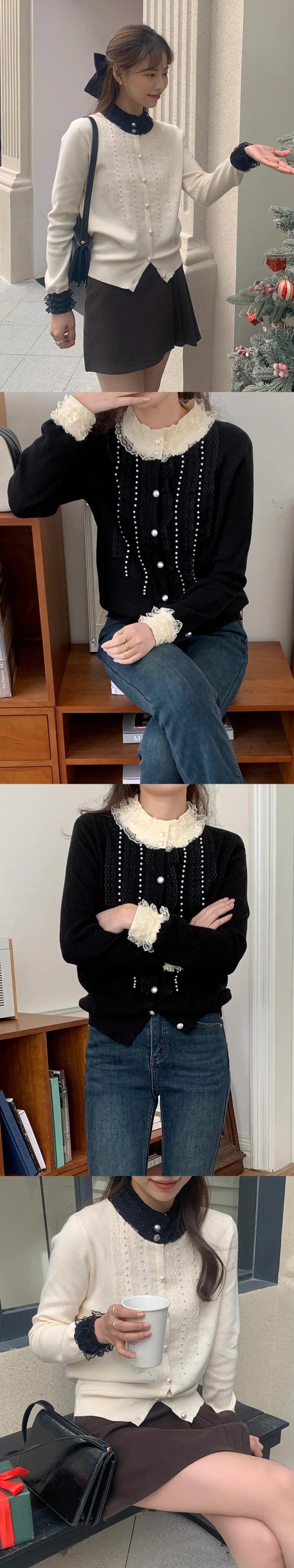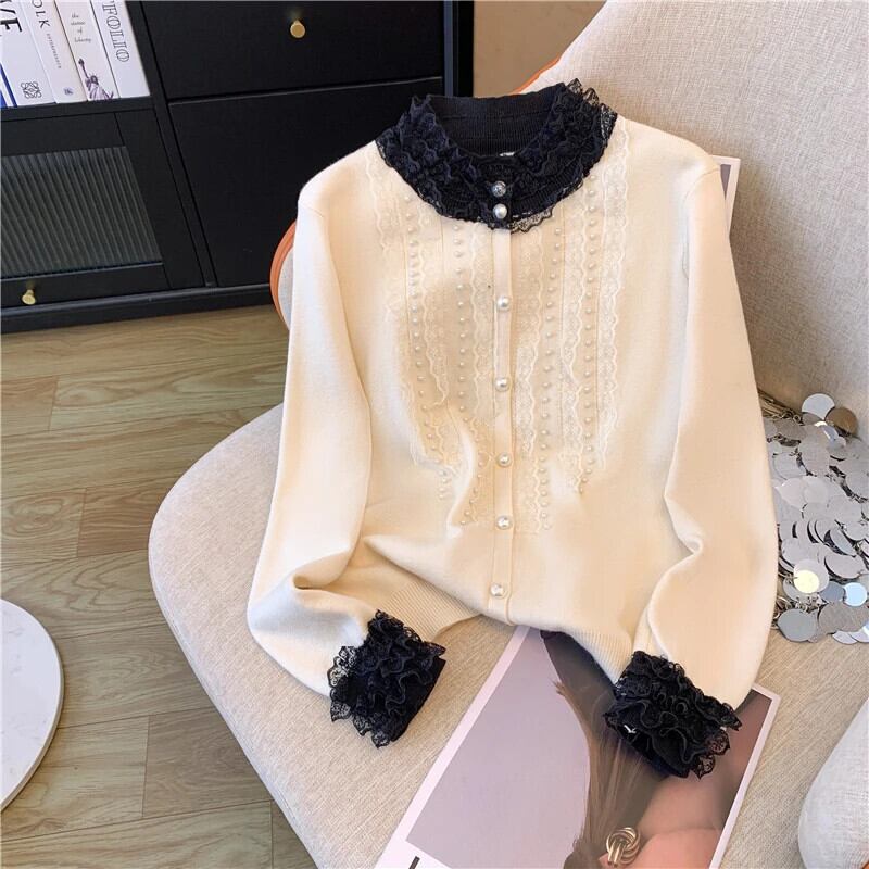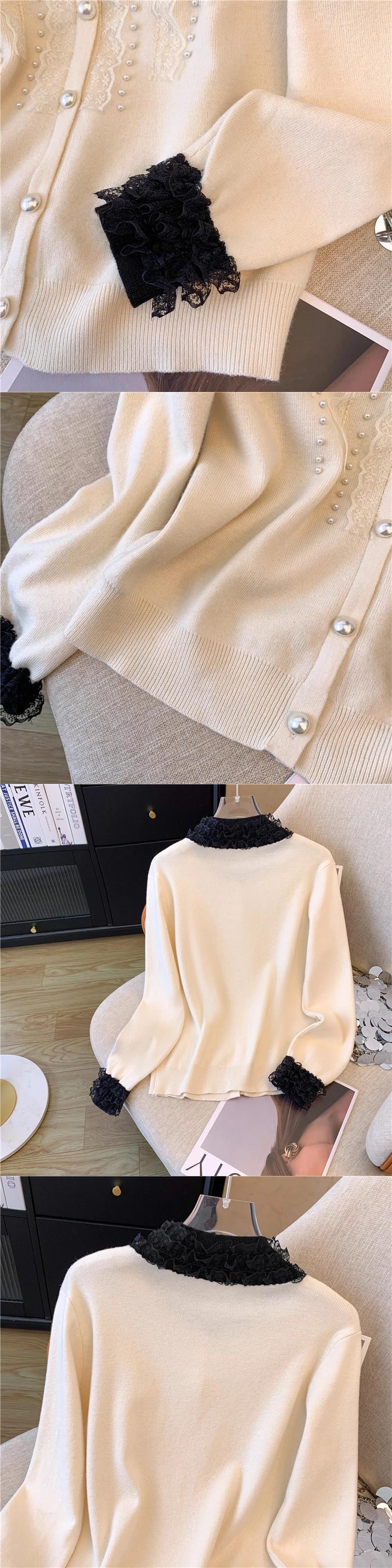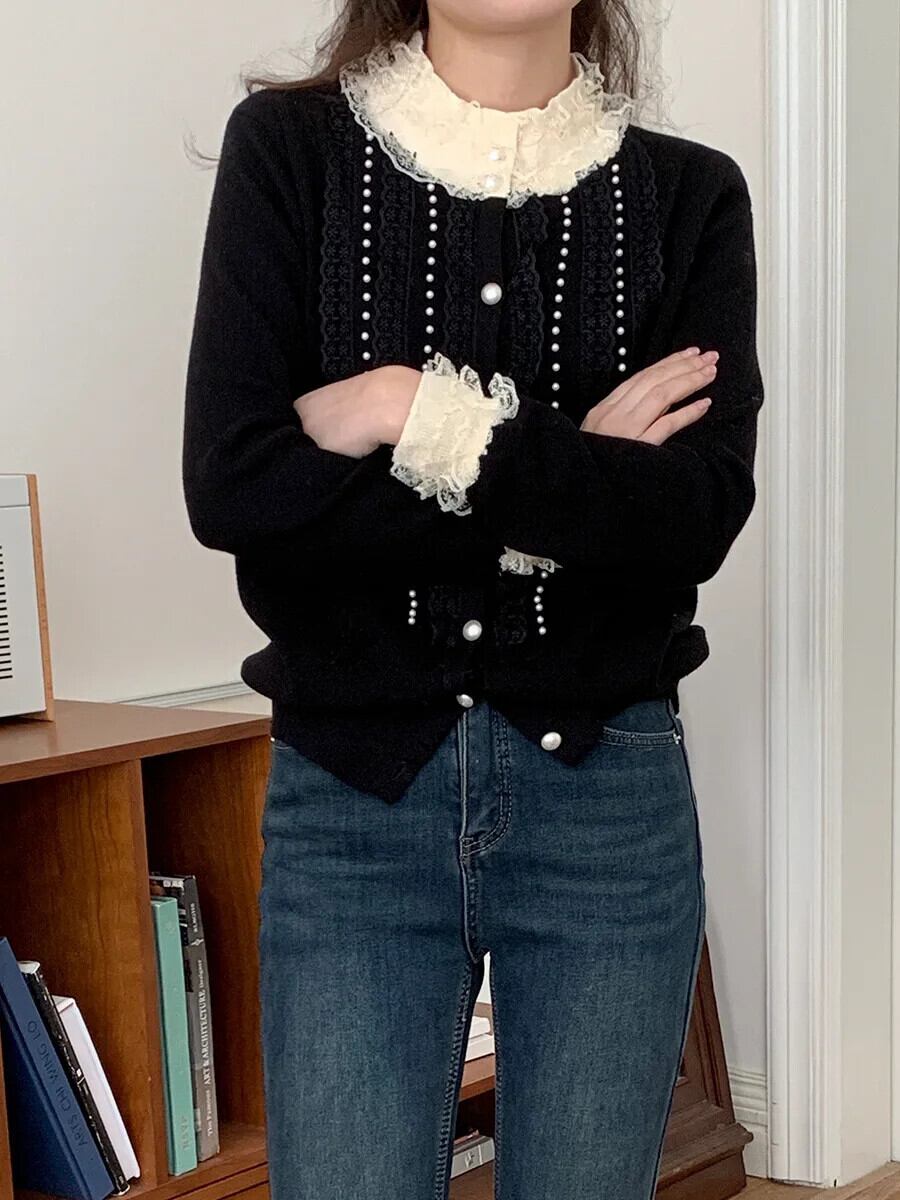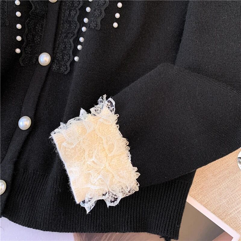 2024 春香り風重工業ネイルビーズシングルブレストレーススプライシングニットカーディガンセーターコート スプリング 春物