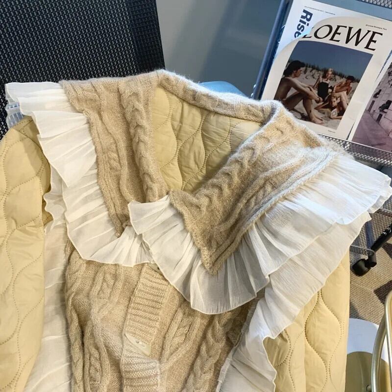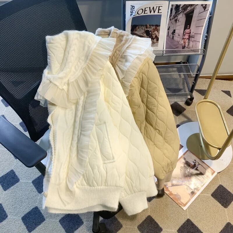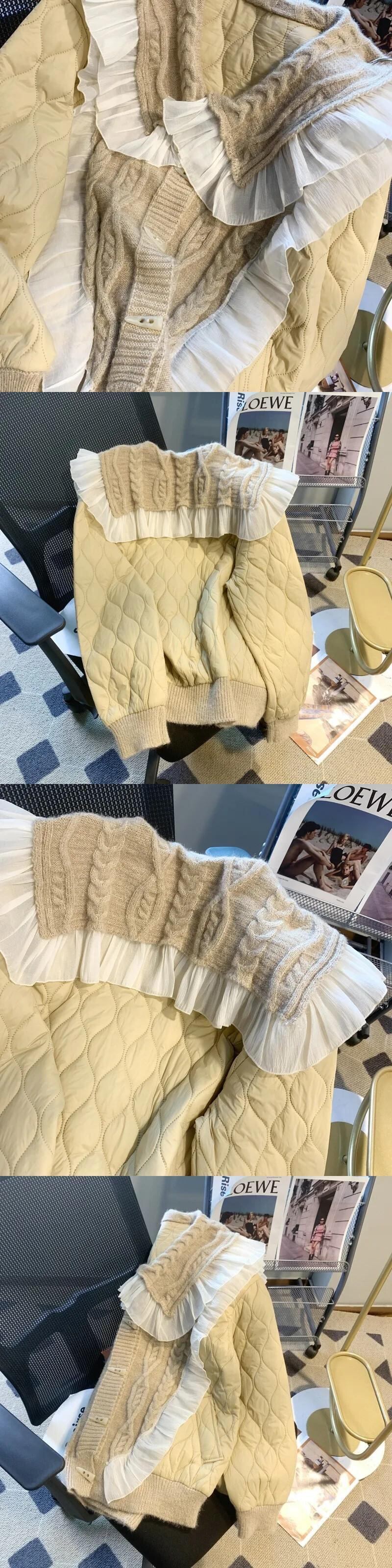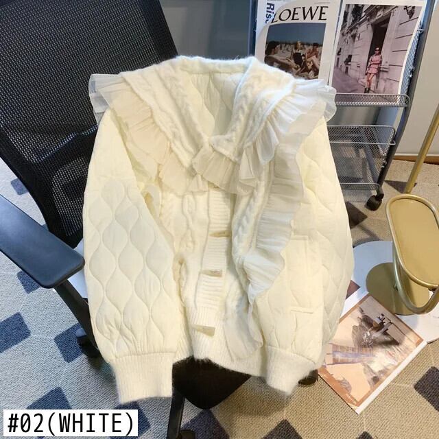 秋冬フリルドールカラーカウルボタンコートルーズニットパッチワークコットンスウィートパーカー 大人ガーリー キュート カジュアル オータム 秋物 ウィンター 冬物