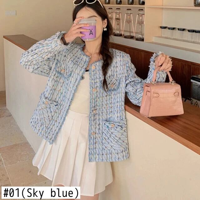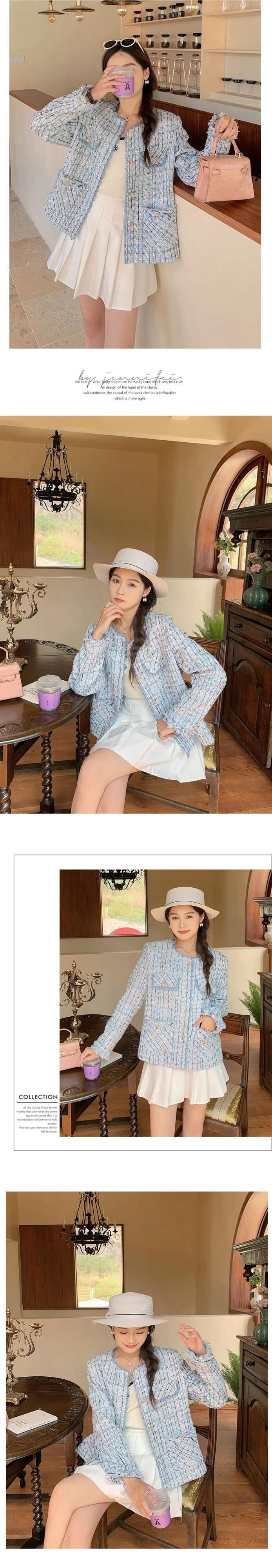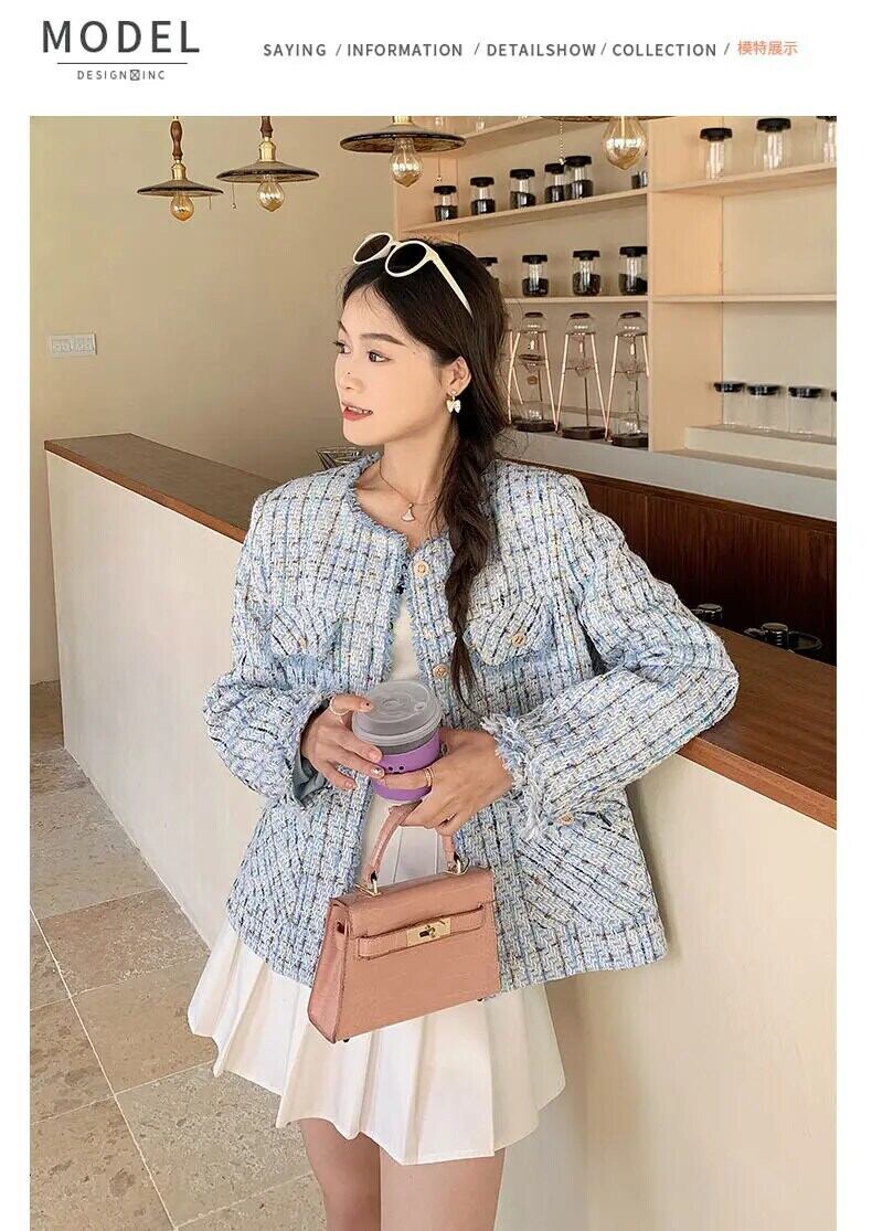 ストリート秋冬ブルー ツイード ジャケット Tel ショート コート Casaco Jaqueta ウィンター 冬物