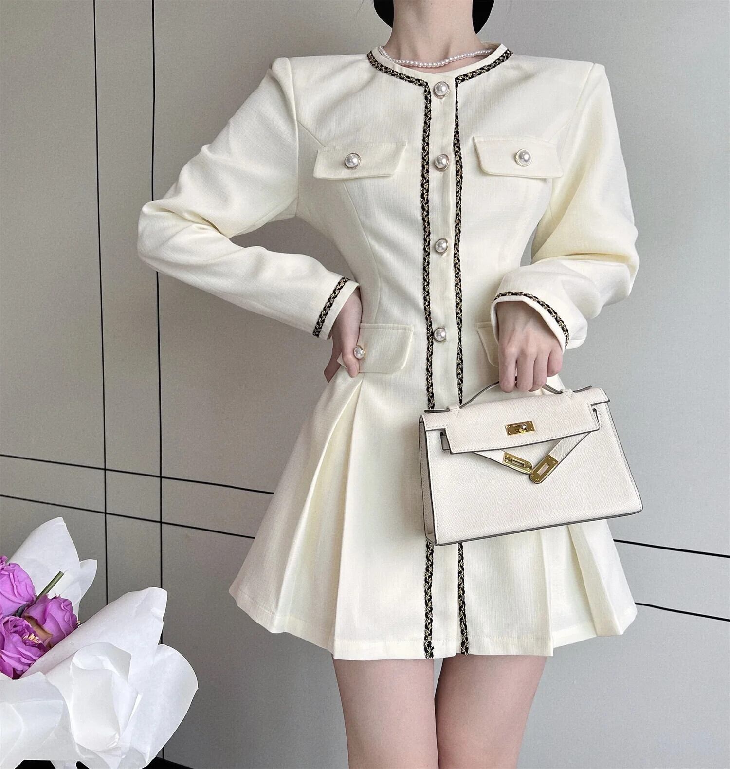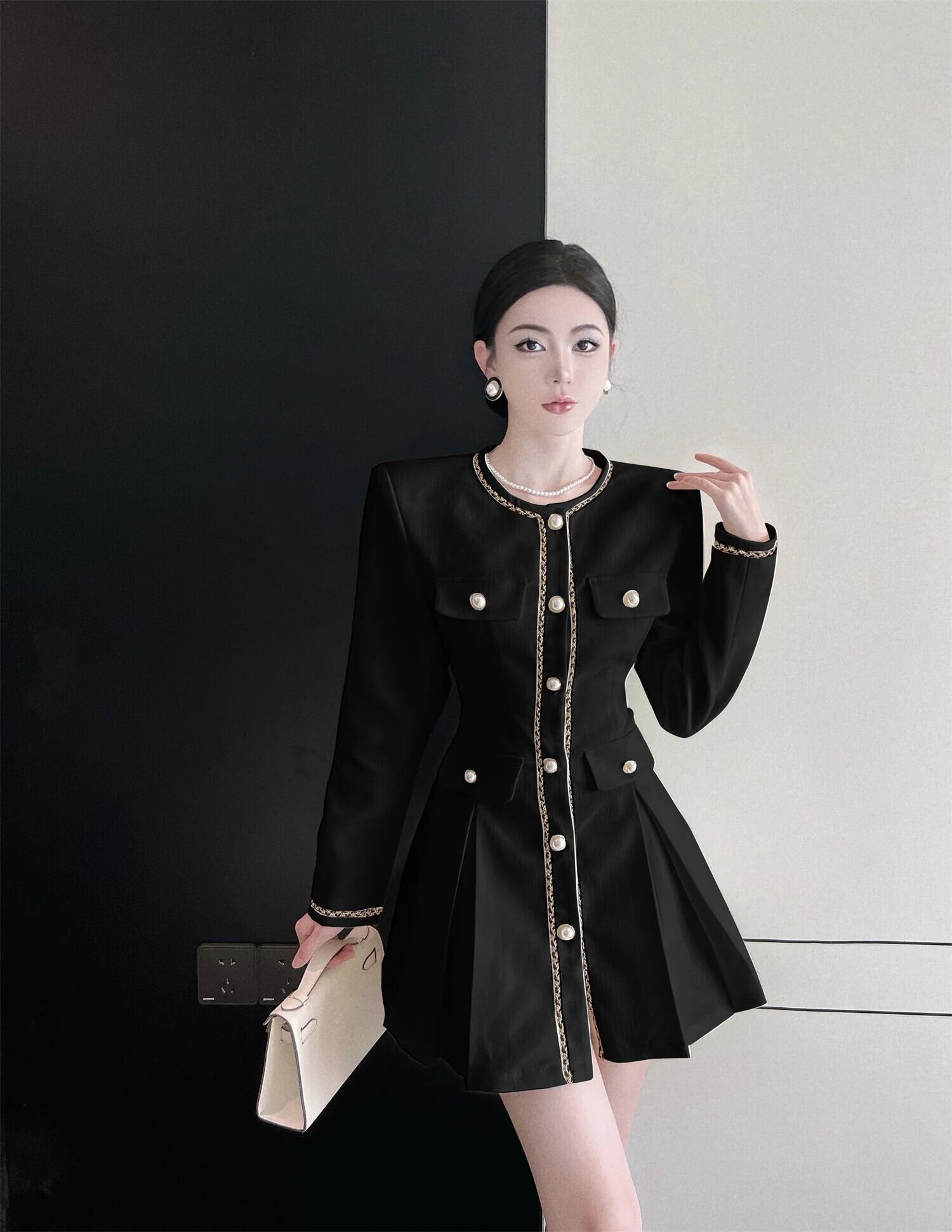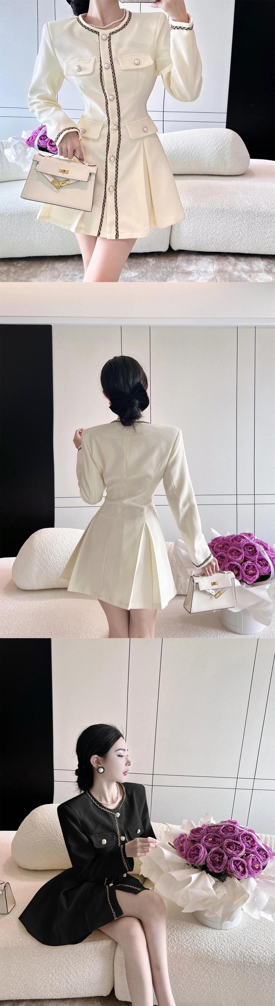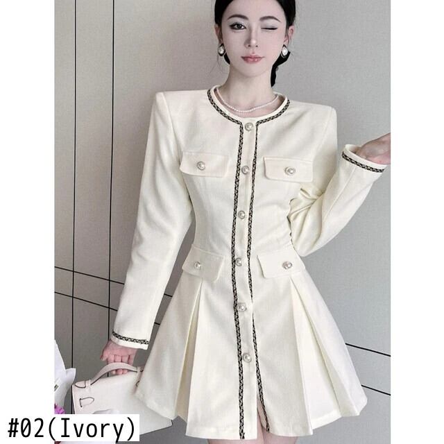 秋長袖スタイルスタイルスーツプリーツシングルブレストウエストドレス ロング オータム 秋物