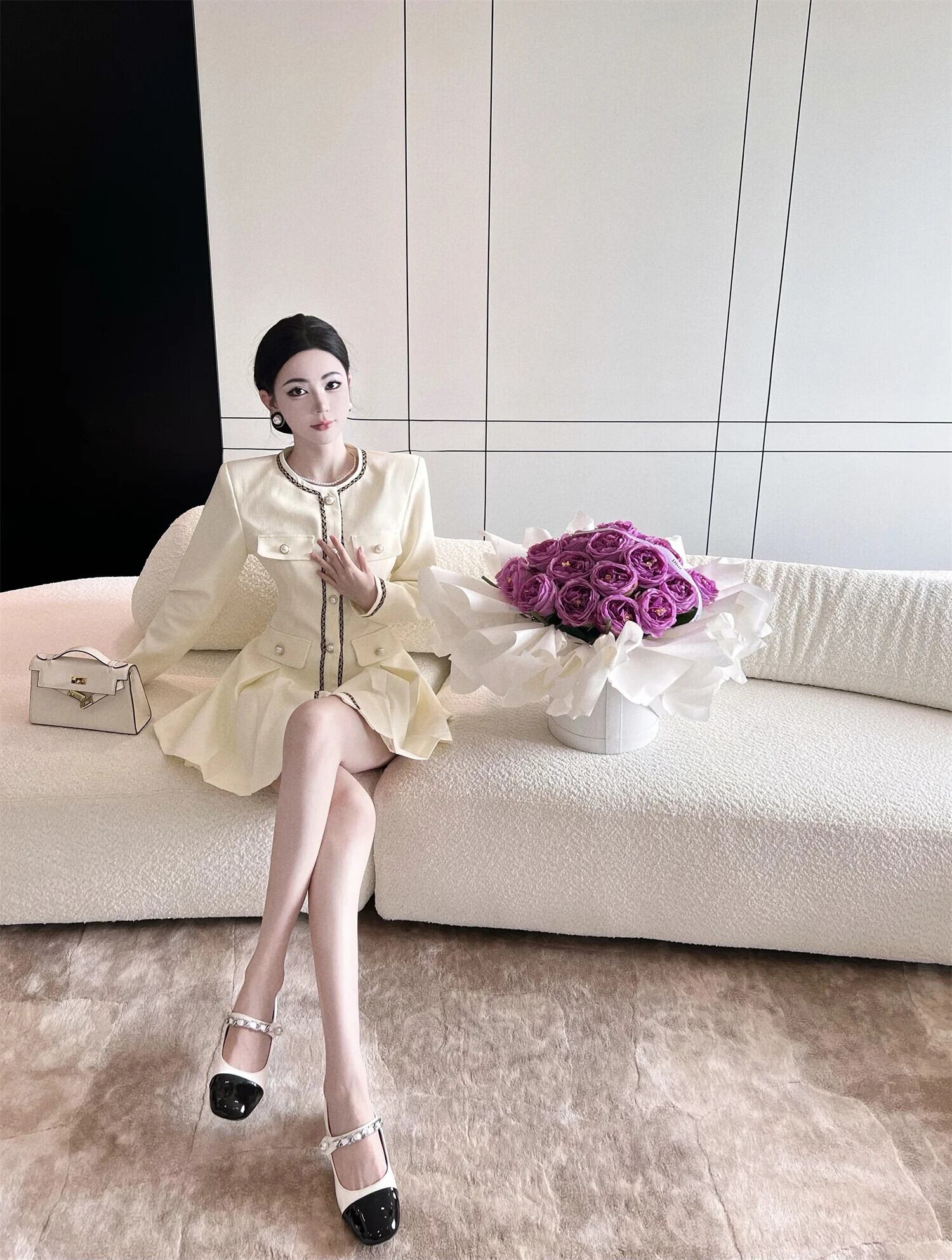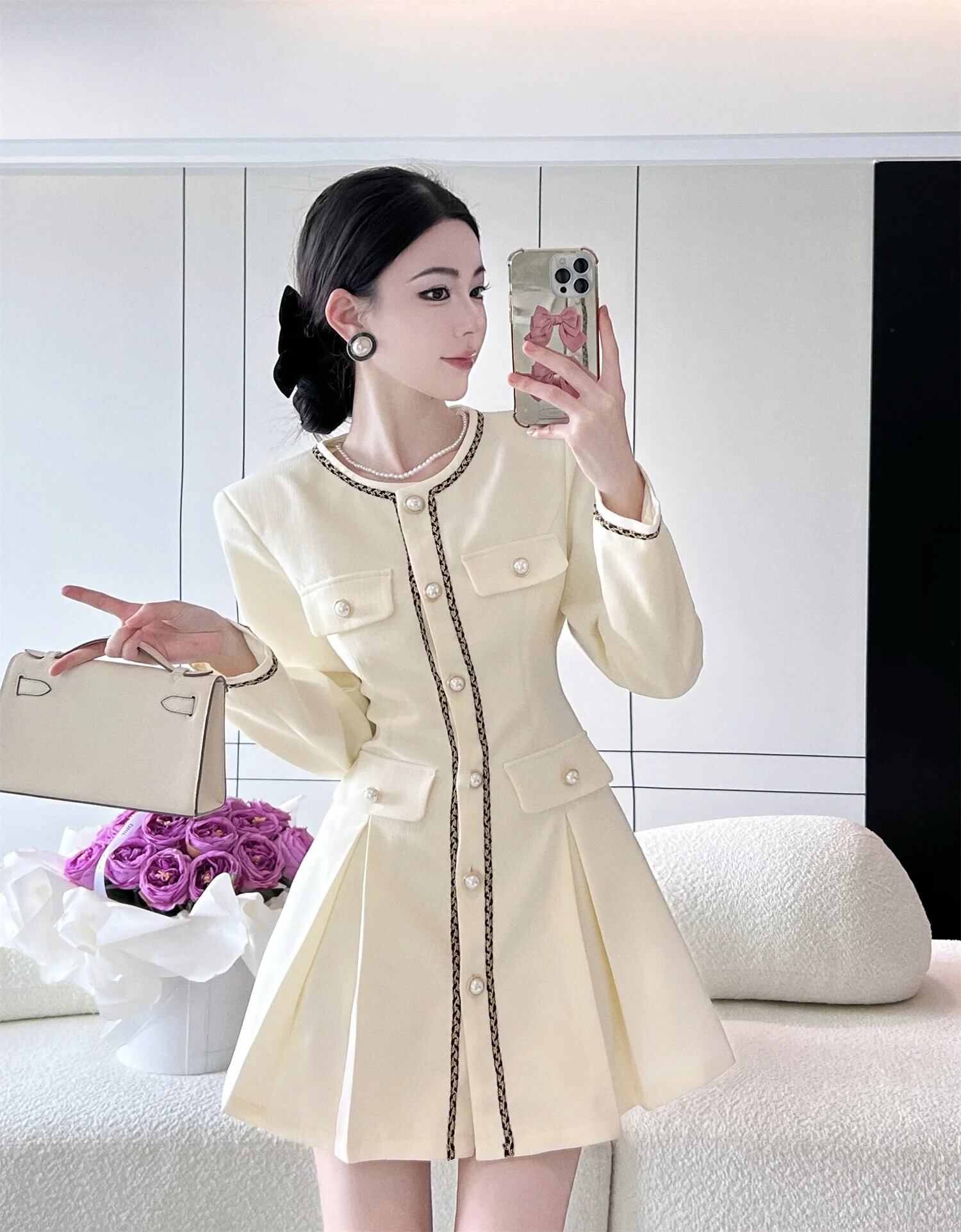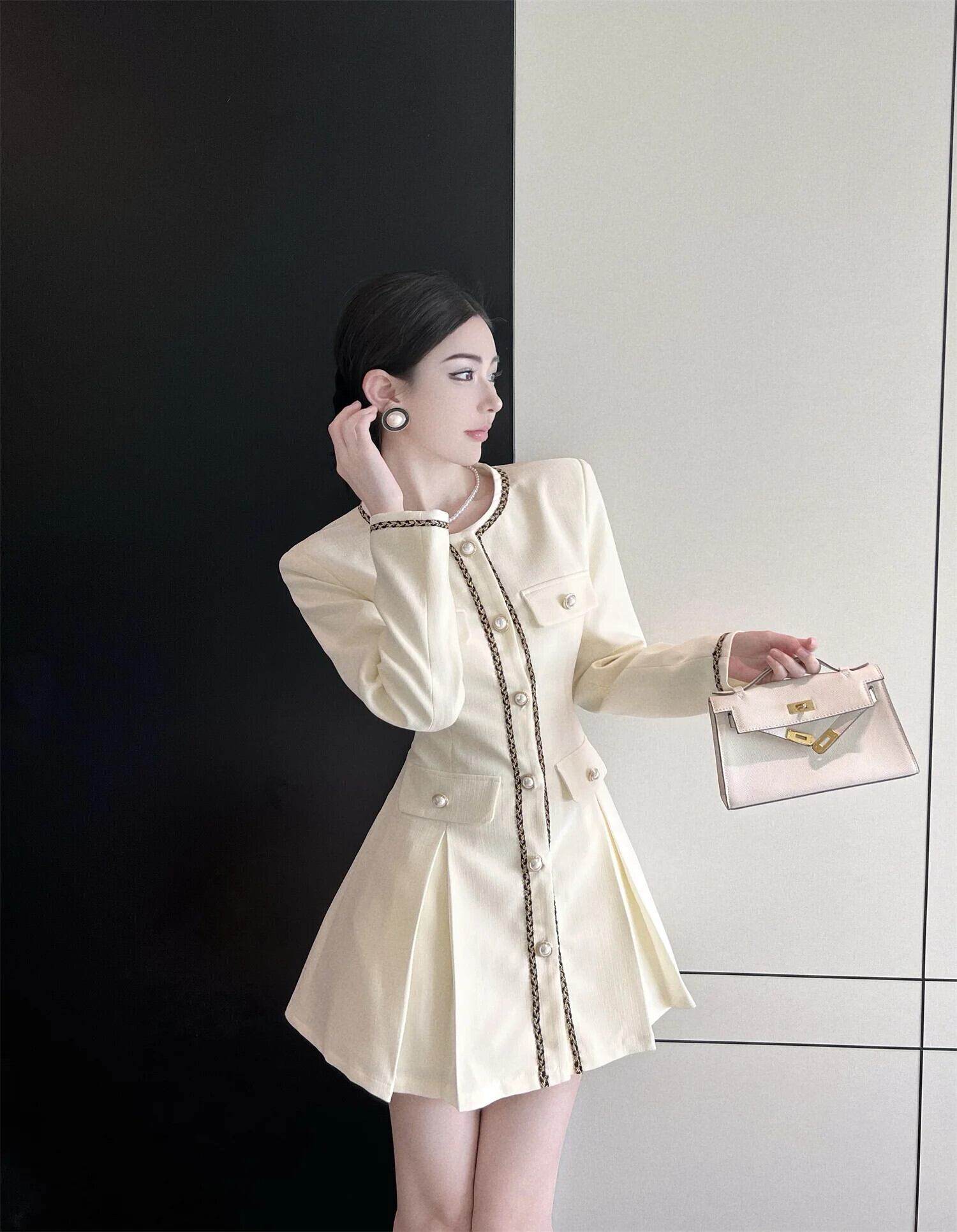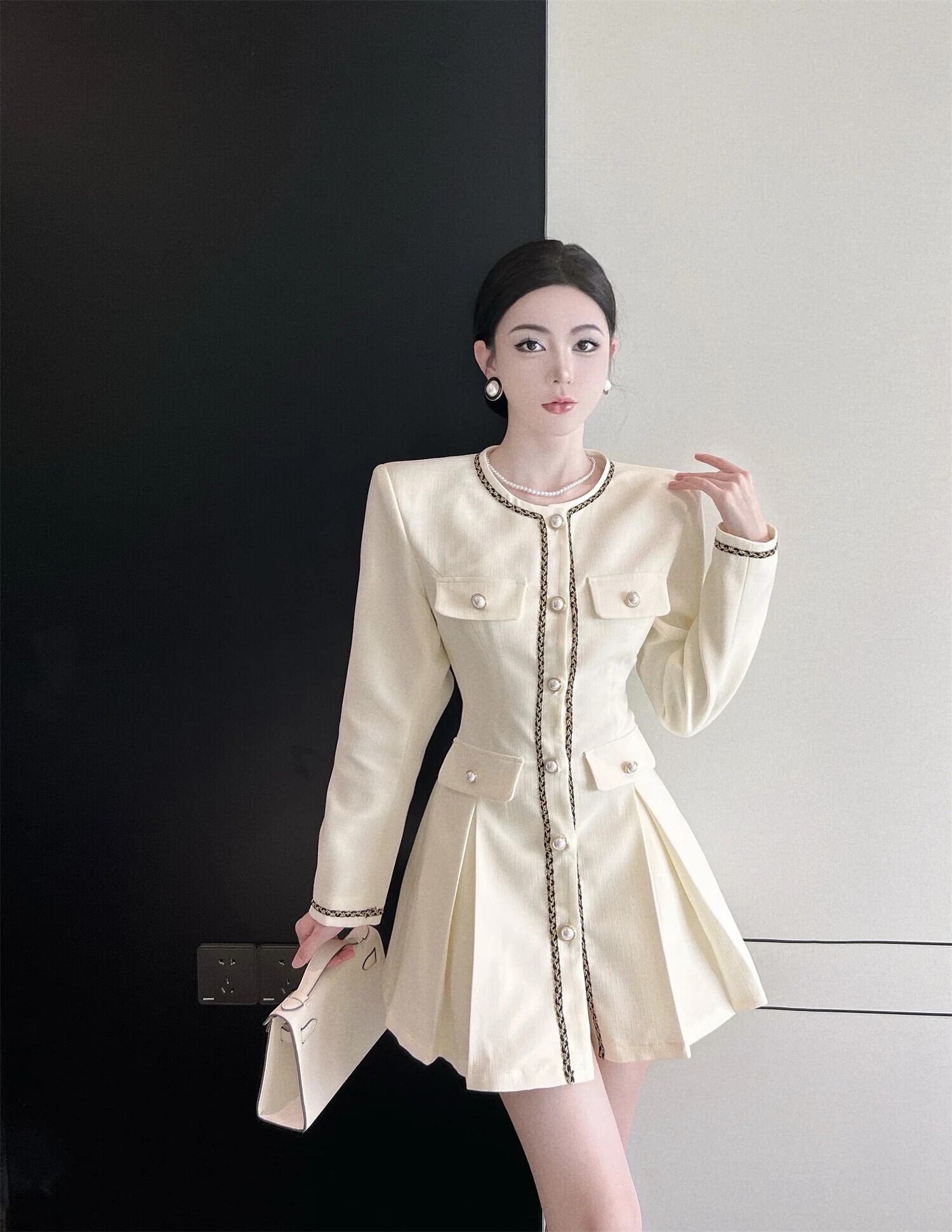 秋長袖スタイルスタイルスーツプリーツシングルブレストウエストドレス ロング オータム 秋物