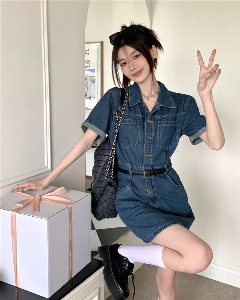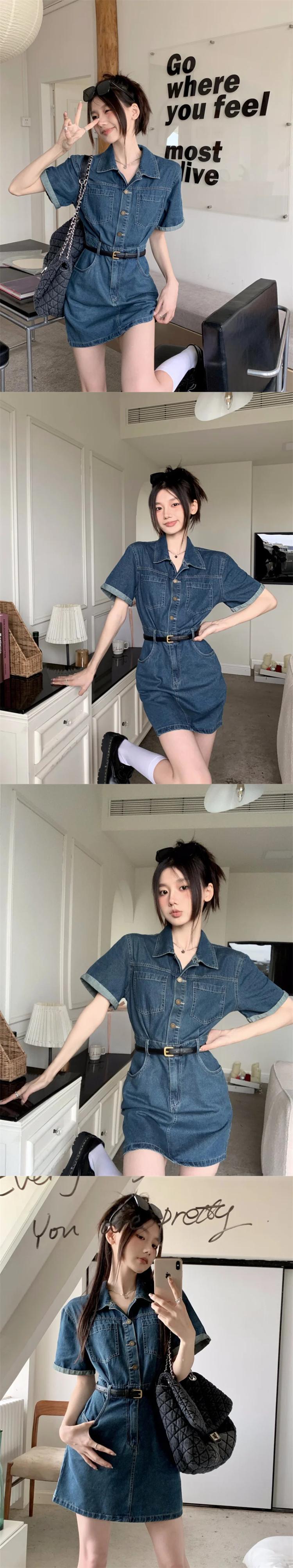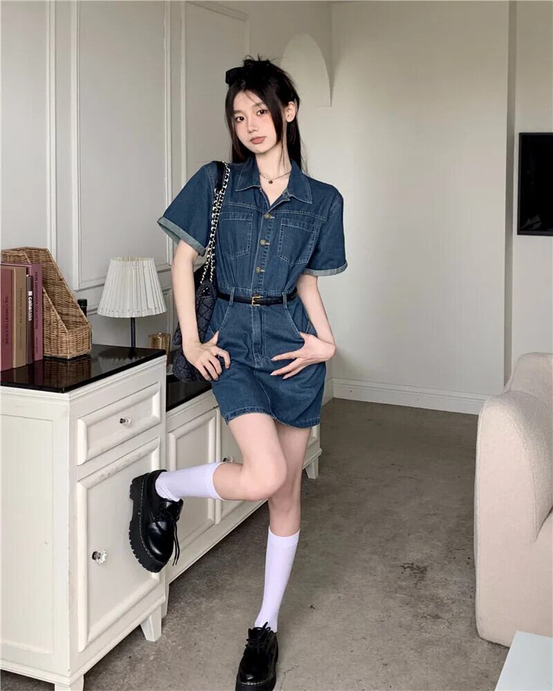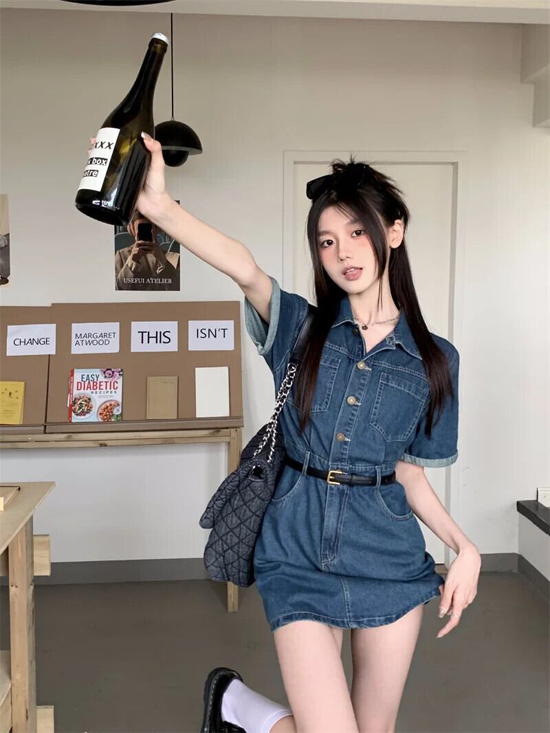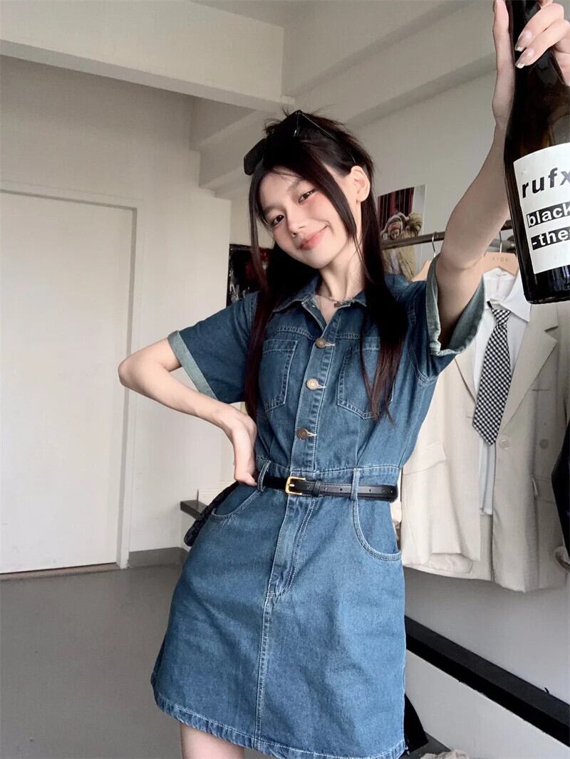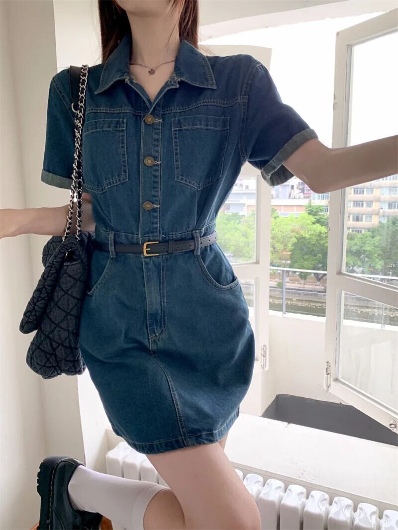 サマースタイル半袖レトロデニムドレストレンドオフィスレディブルーローブ ショート ハーフスリーブ 夏物 会社 学校 通勤や通学にも