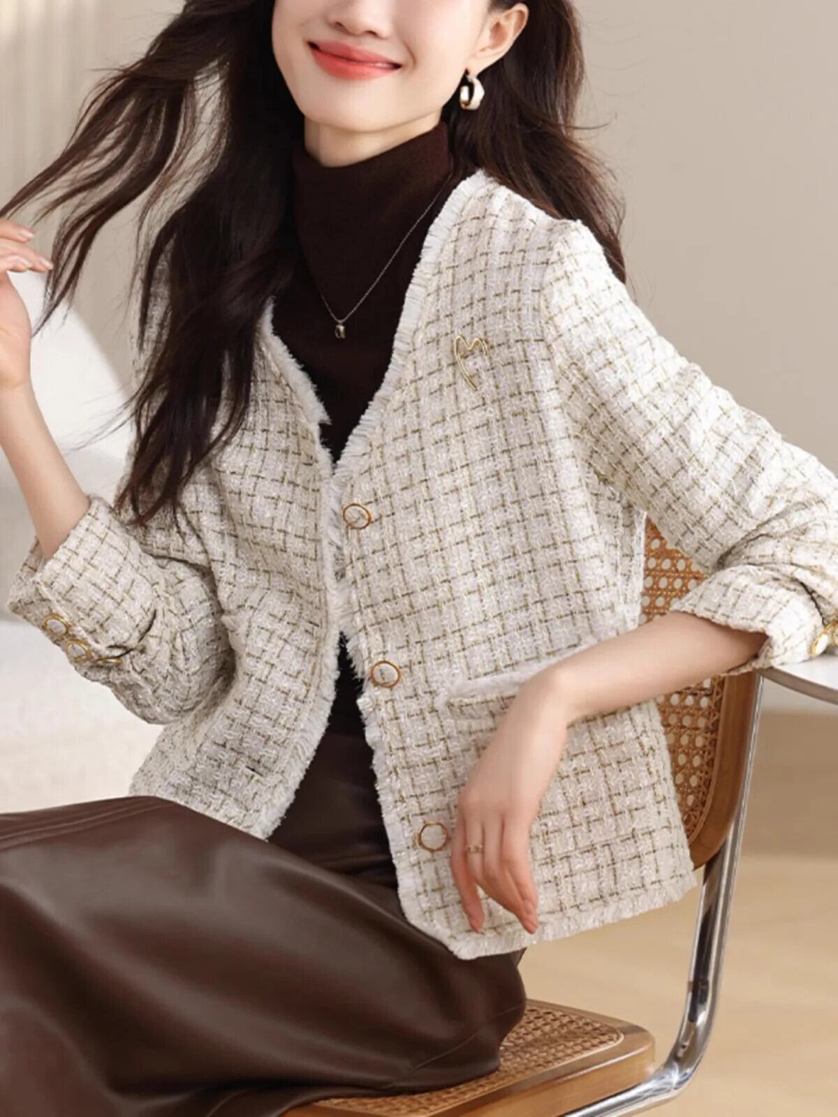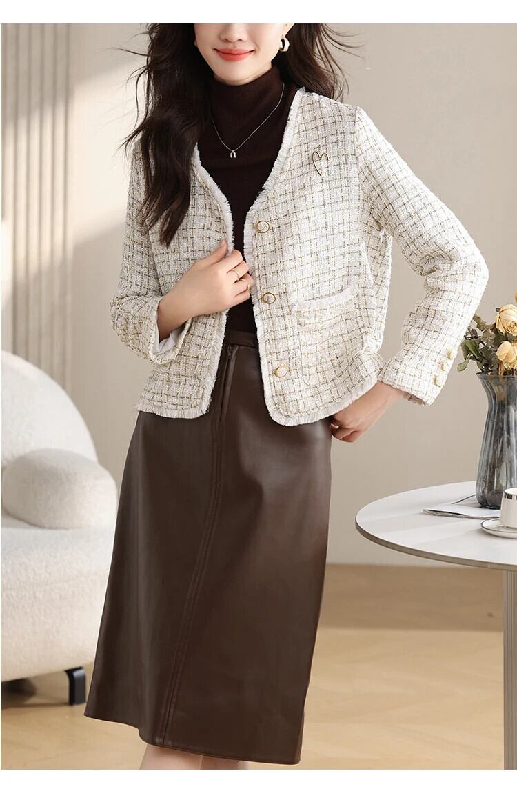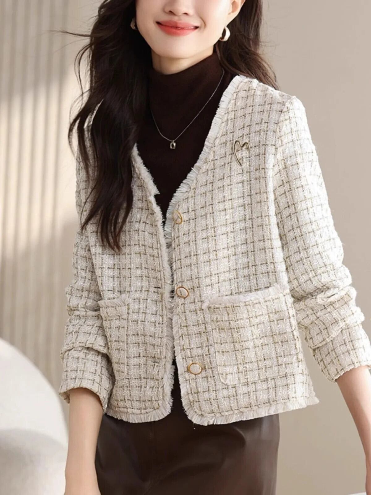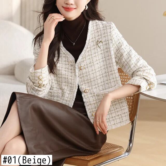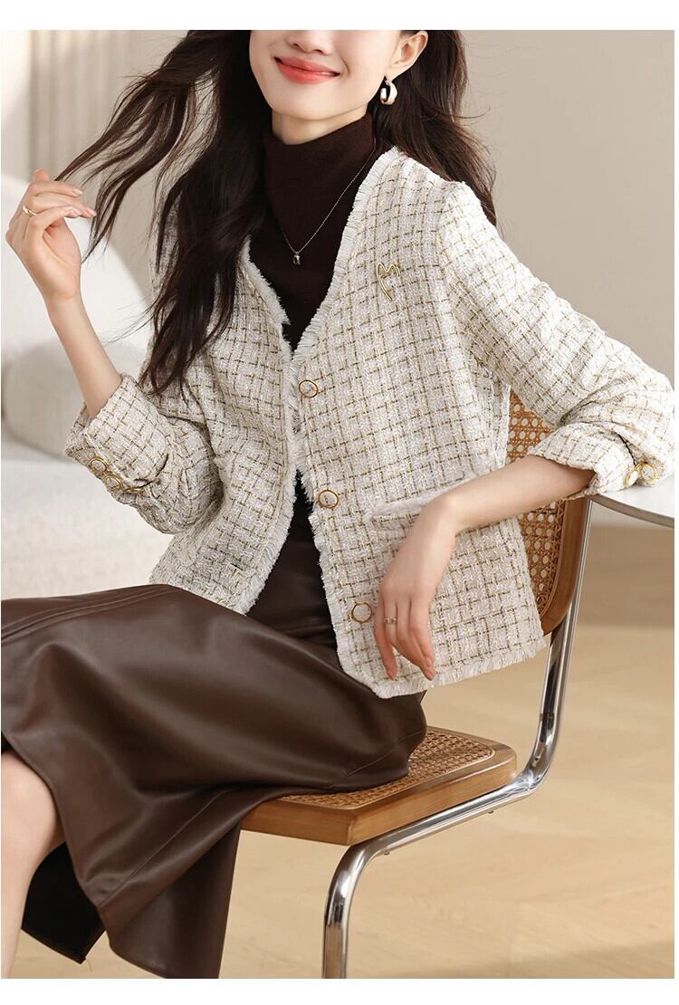 V ネック Tel 粗いウール光沢あるフレグランス ジャケット春秋ツイード コート スプリング 春物 オータム 秋物 Vネック シルク