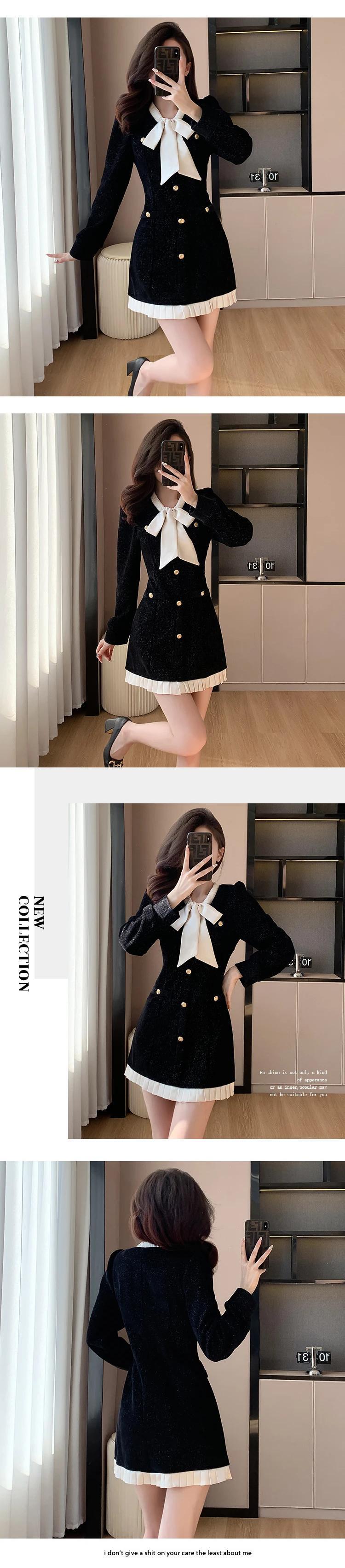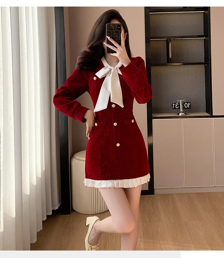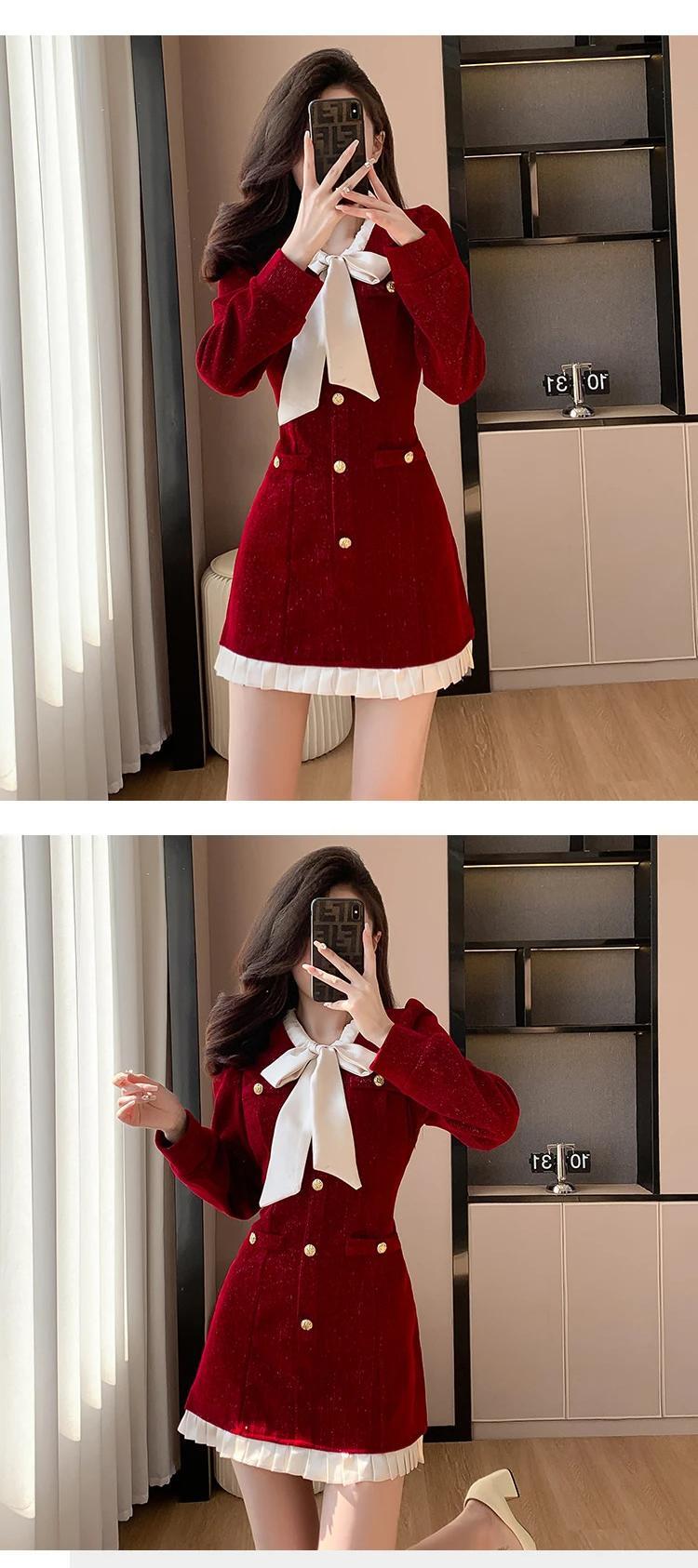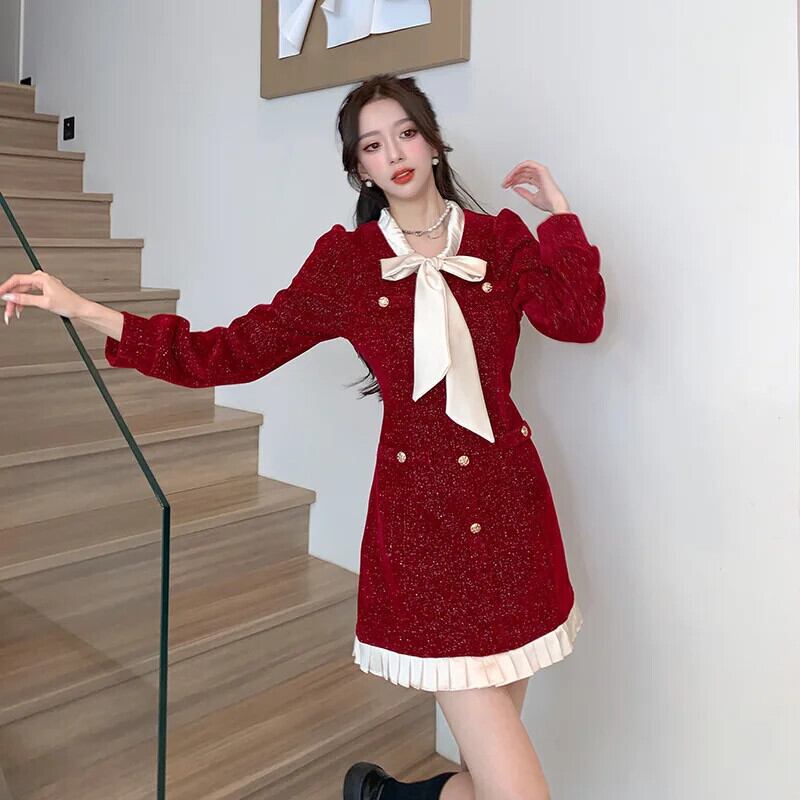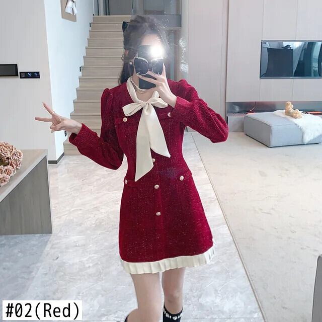 レディース秋冬 2024 レッドブラックベルベットストラップコントラスト A ラインドレス オータム 秋物 ウィンター 冬物 Aライン