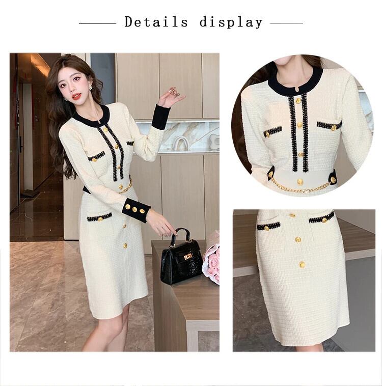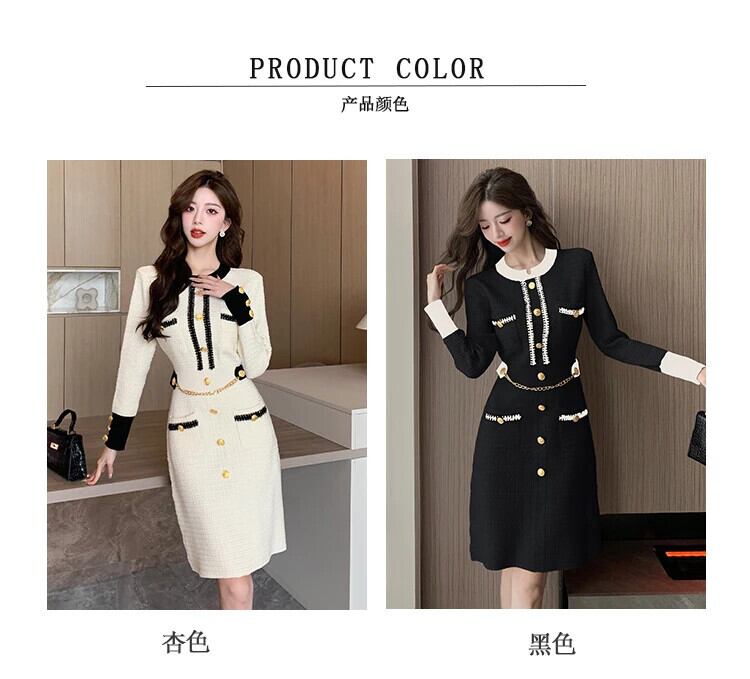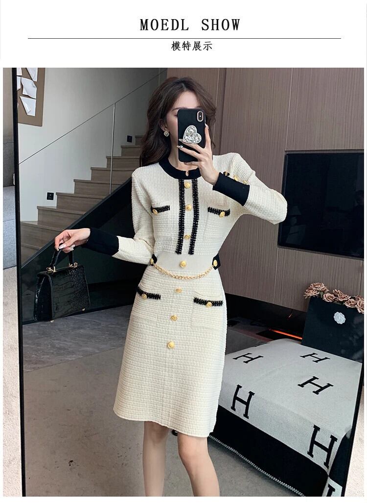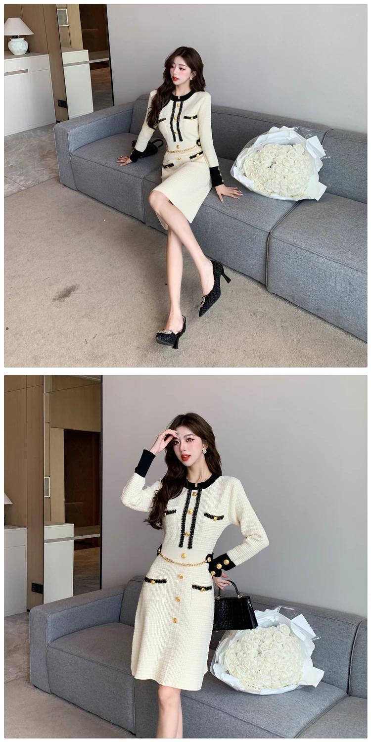 秋冬気質ラウンドネックウエストプルボタン長袖フレグランスニットドレス ロング オータム 秋物 ウィンター 冬物 Oネック