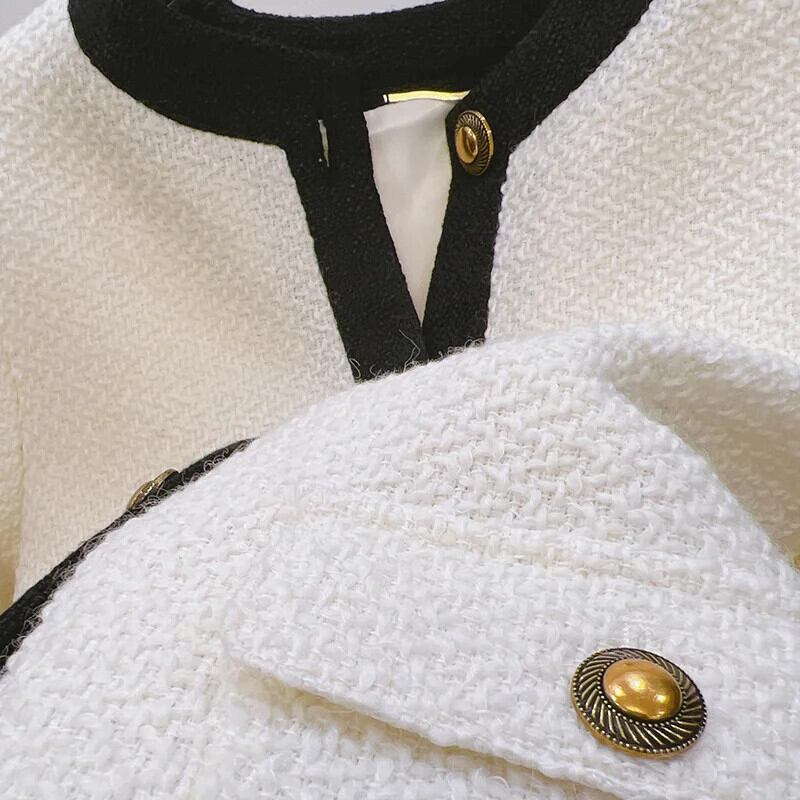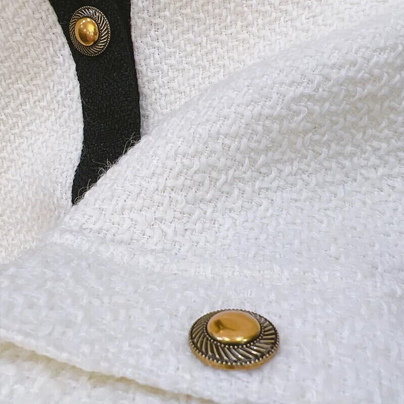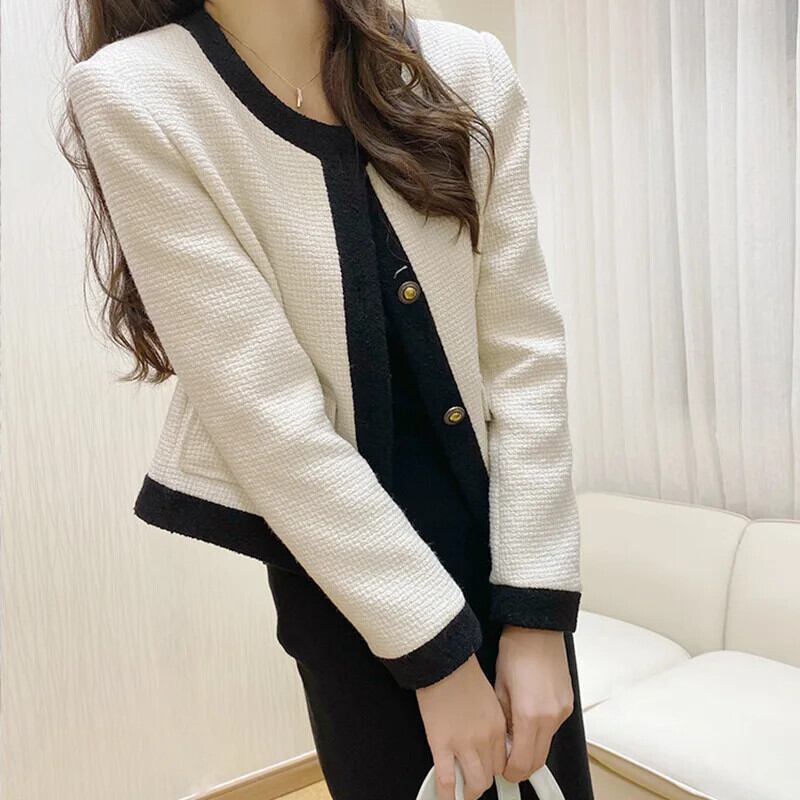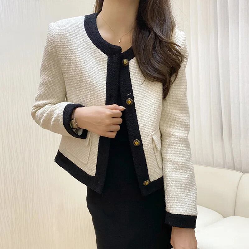 フレグランスストライプラウンドネックウールショートスーツコート秋春シングルブレストツイードブレザー スプリング 春物 オータム 秋物 Oネック