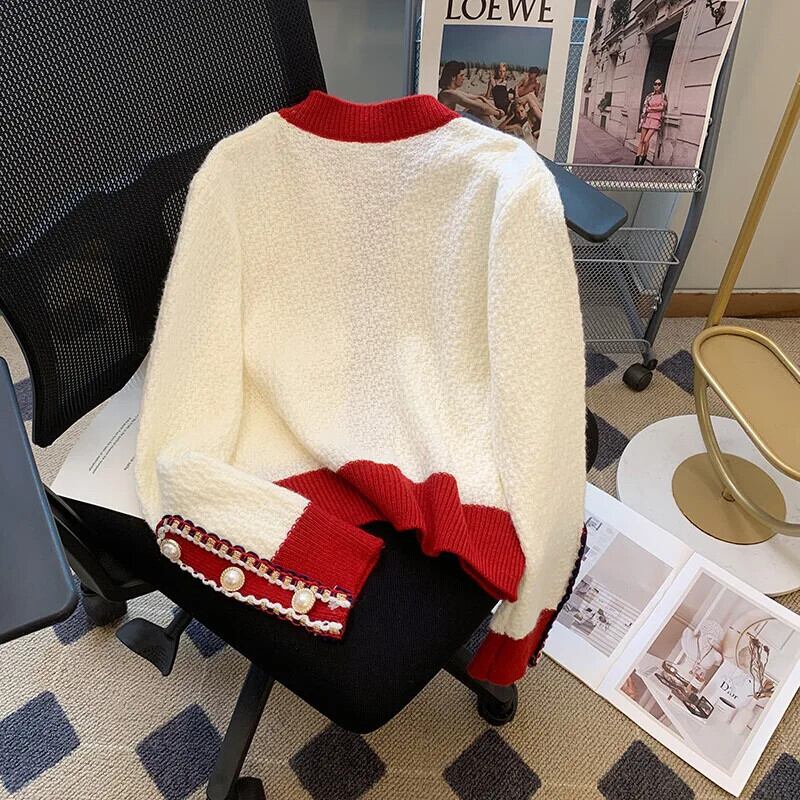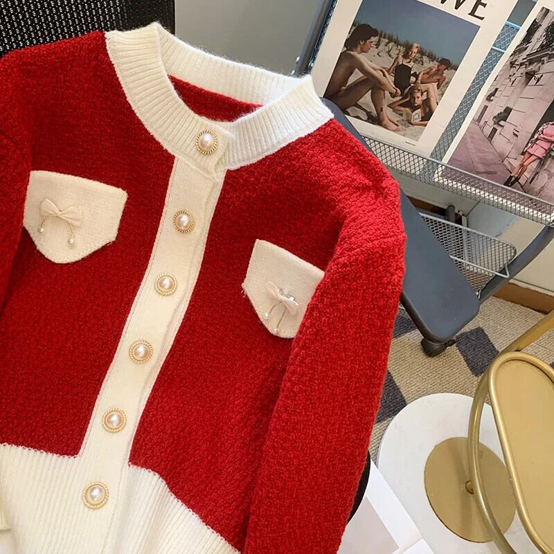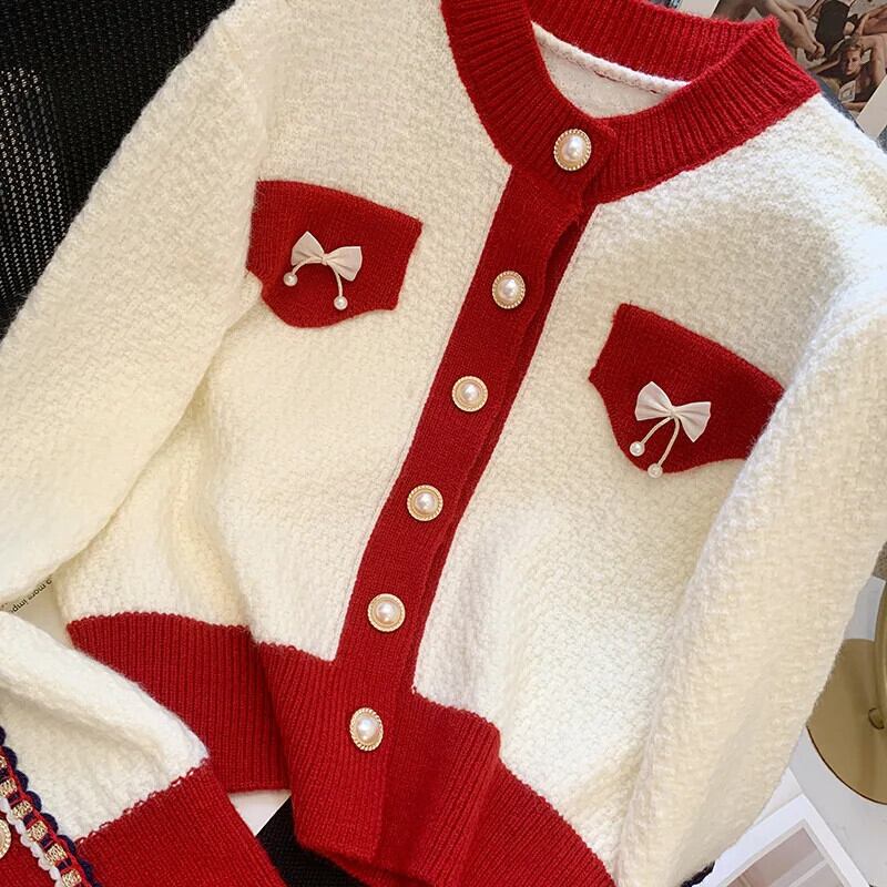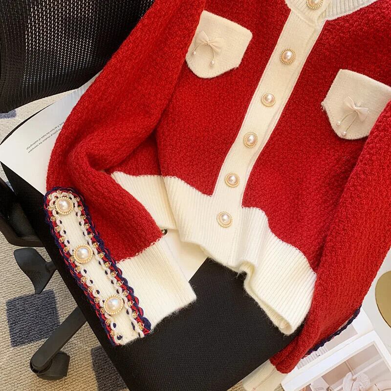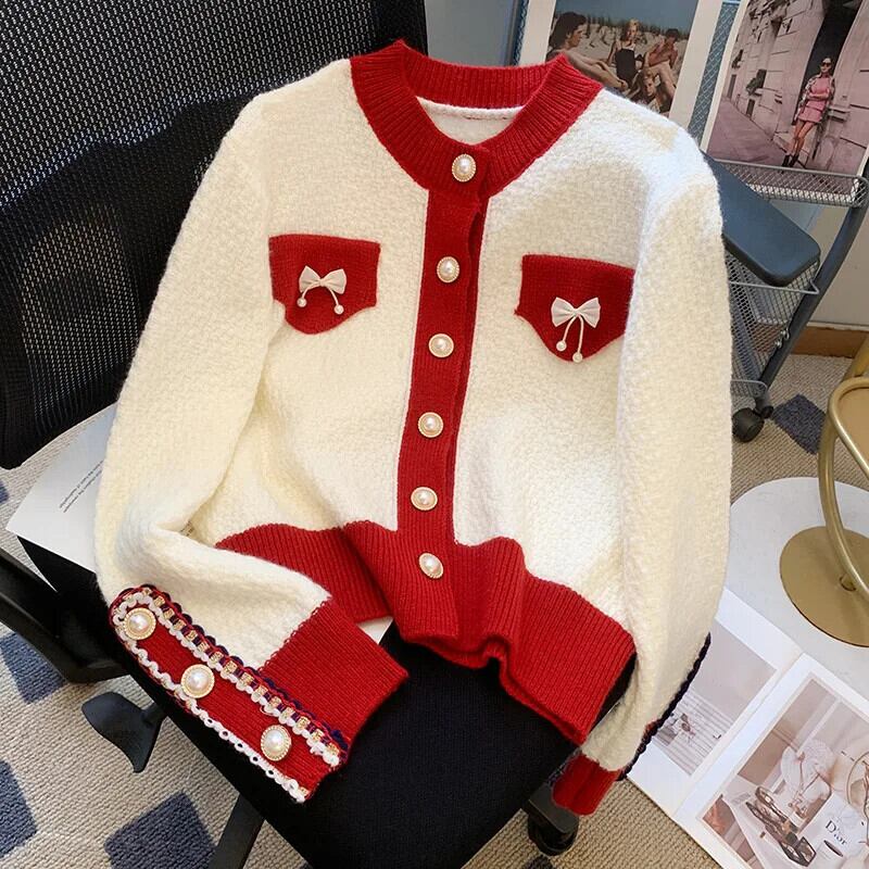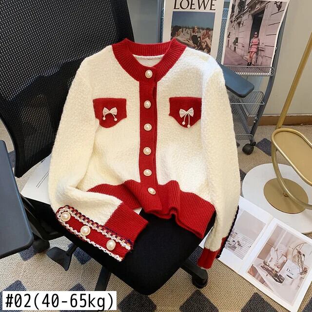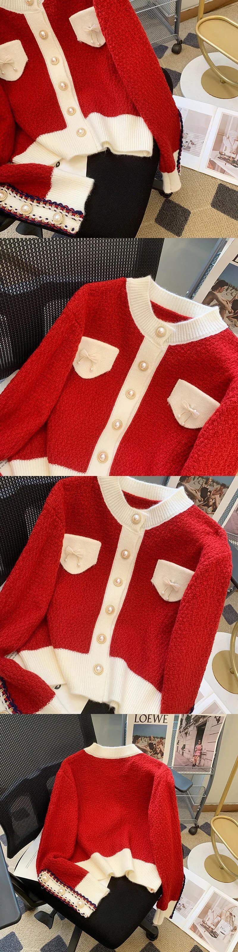 レディース秋ニットカーディガンボウセータールーズコートパールバックル リボン オータム 秋物 真珠