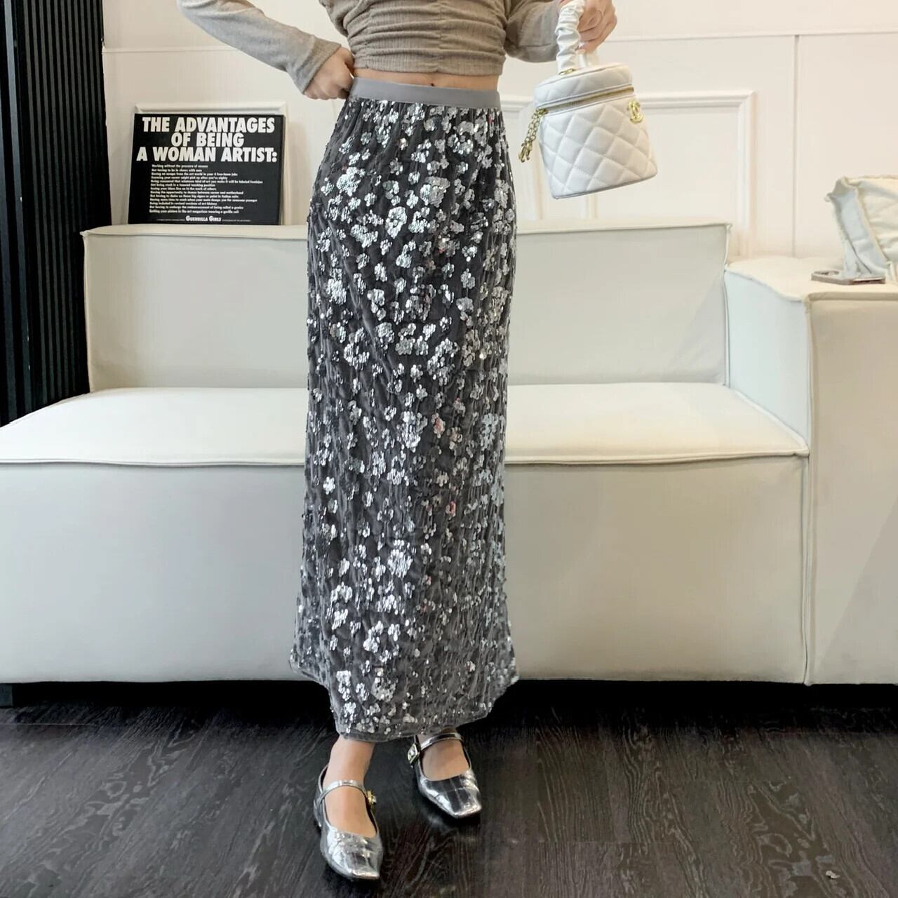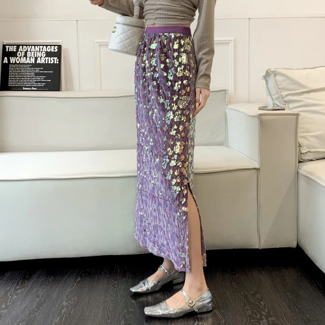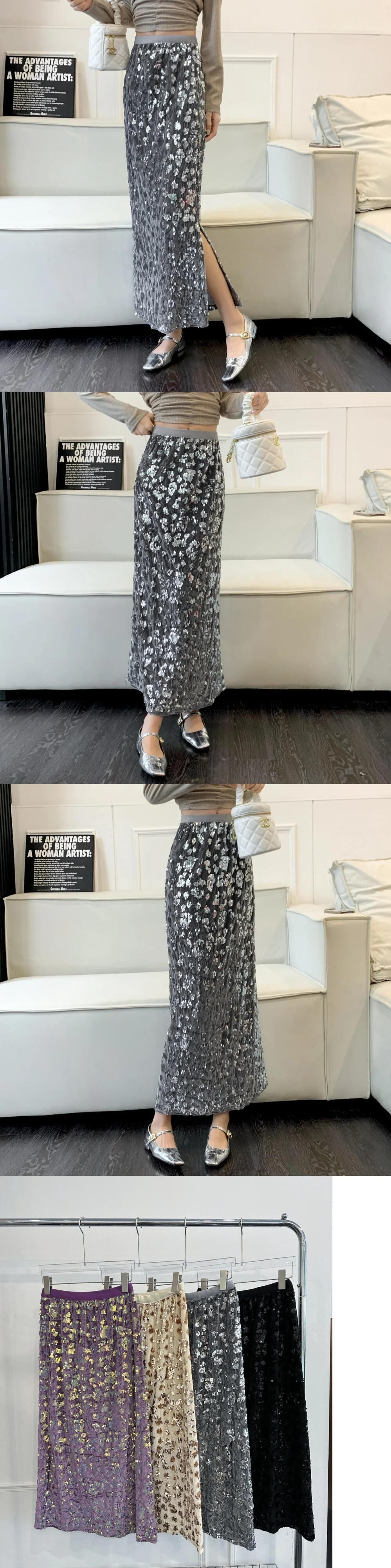 アプリコットパープルスパンコール秋冬レディースミドル丈スカート オータム 秋物 ウィンター 冬物