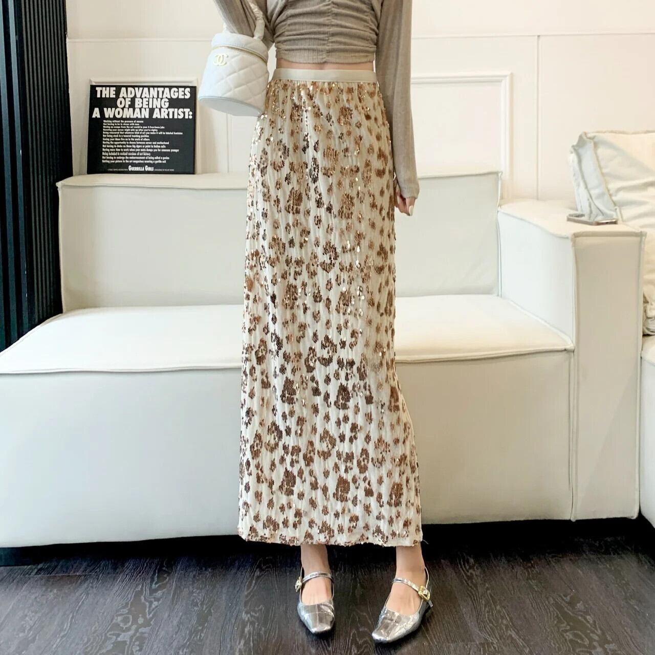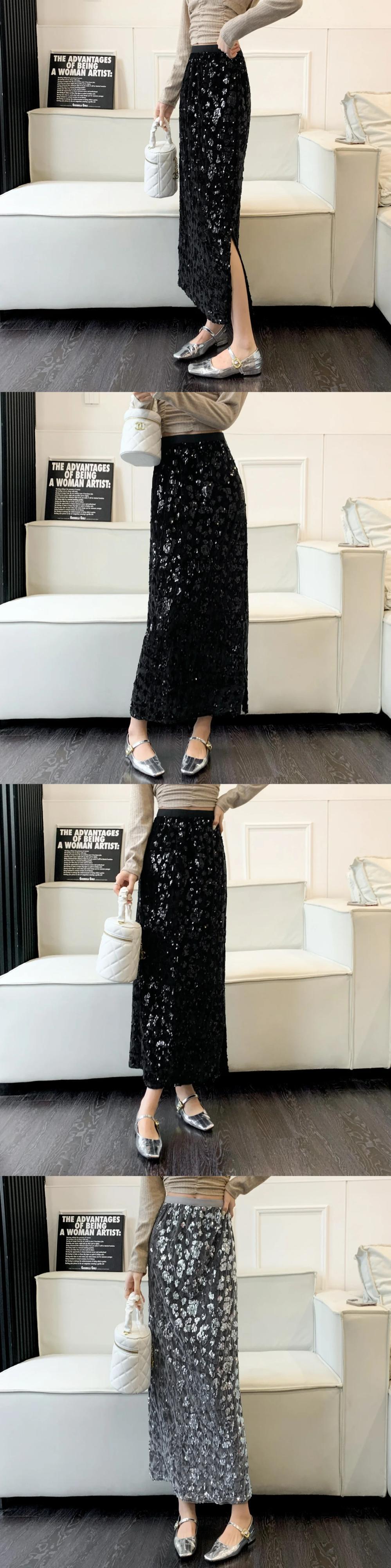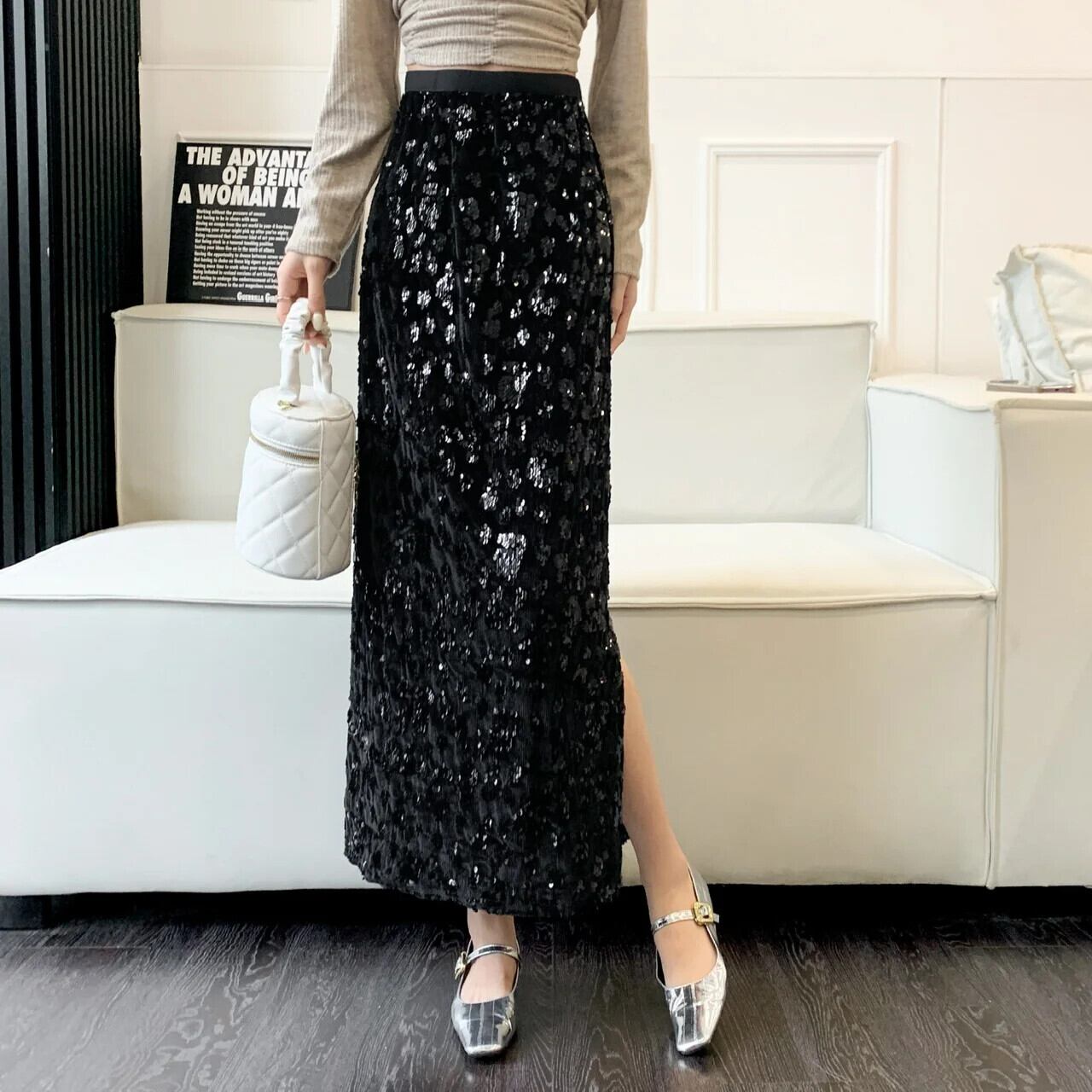 アプリコットパープルスパンコール秋冬レディースミドル丈スカート オータム 秋物 ウィンター 冬物