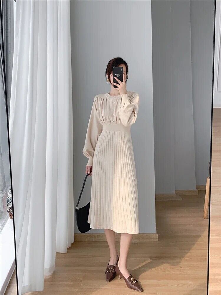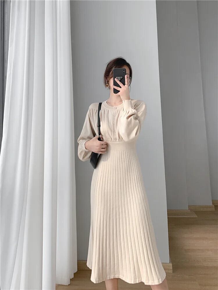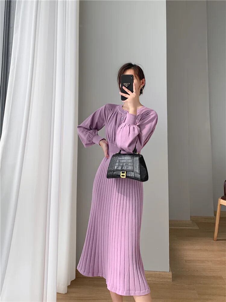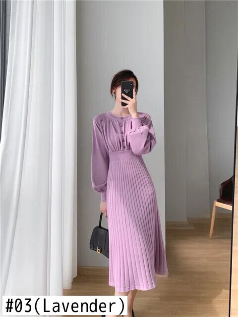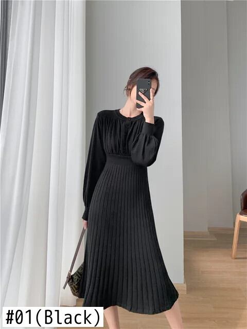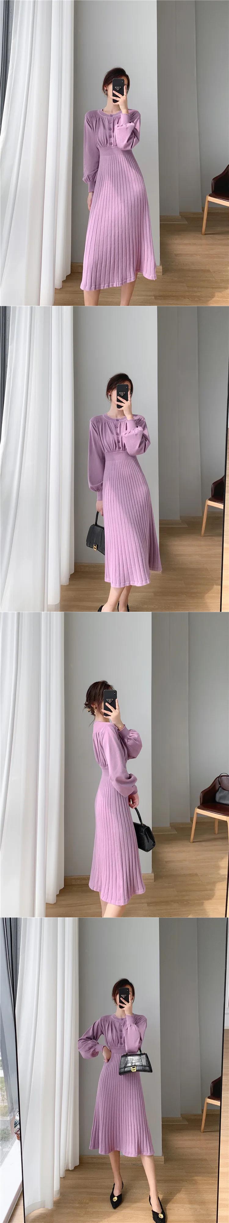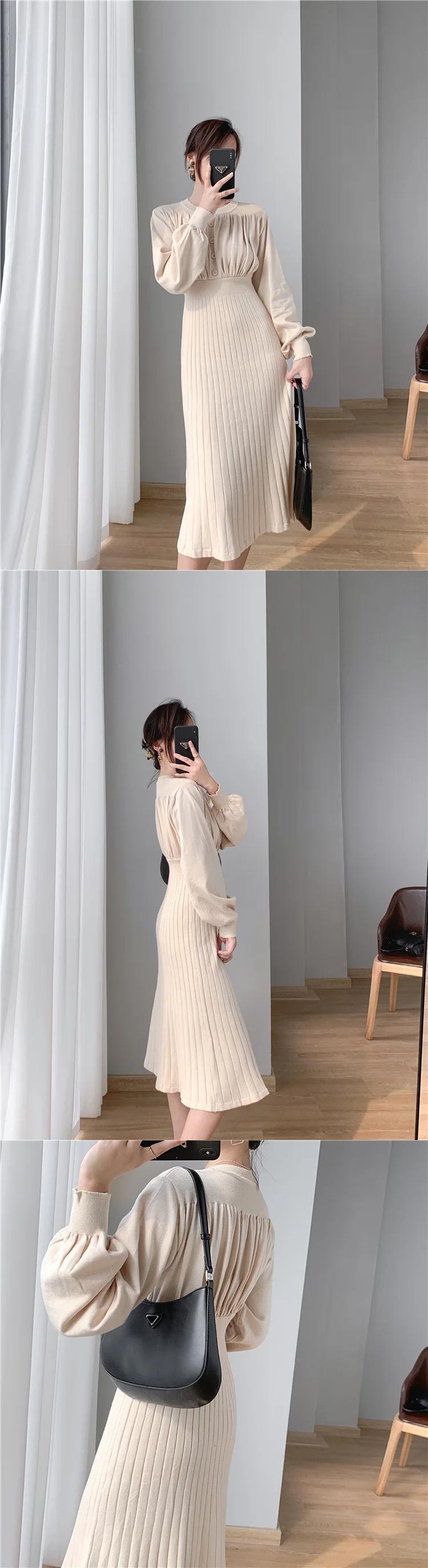 秋/冬可能ロング膝セーターランタン袖ウエストラップニットドレス ランタンスリーブ オータム 秋物 ウィンター 冬物