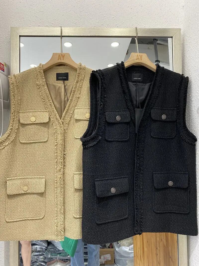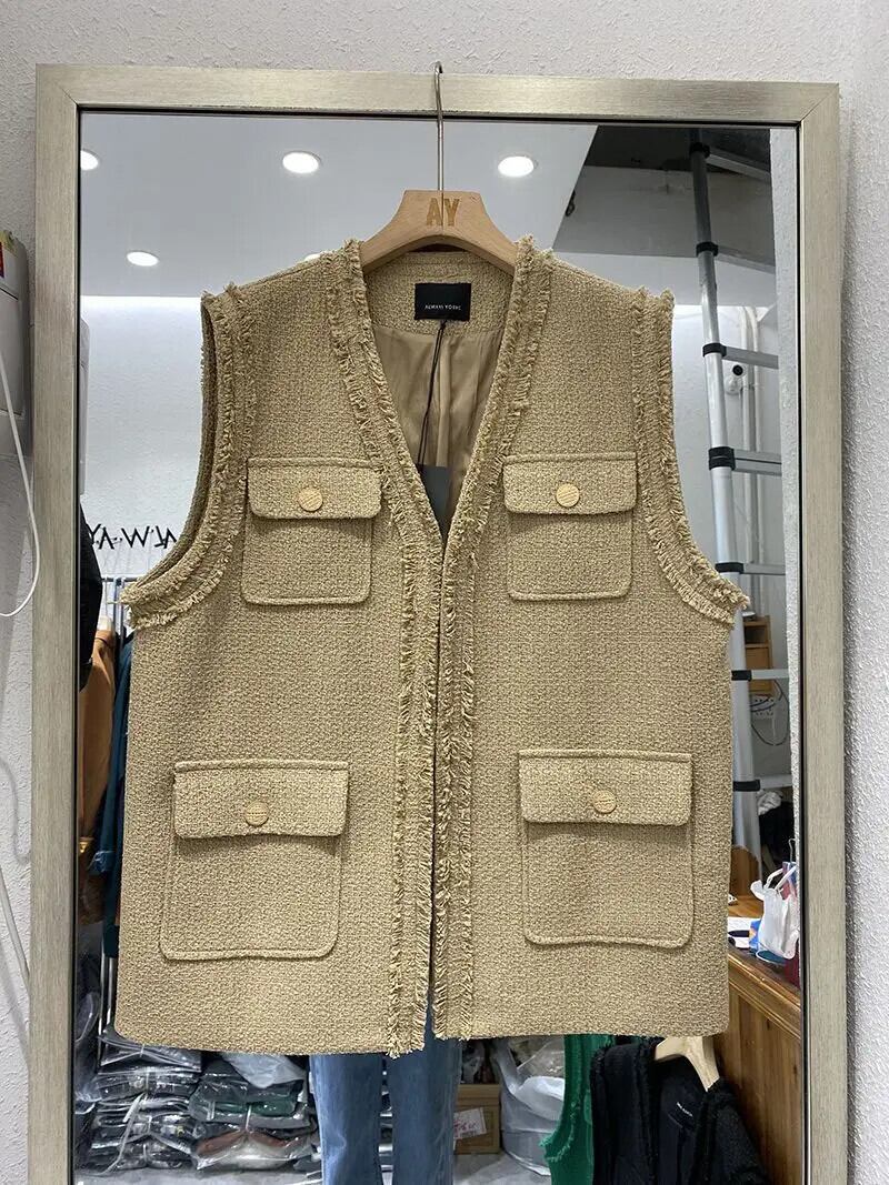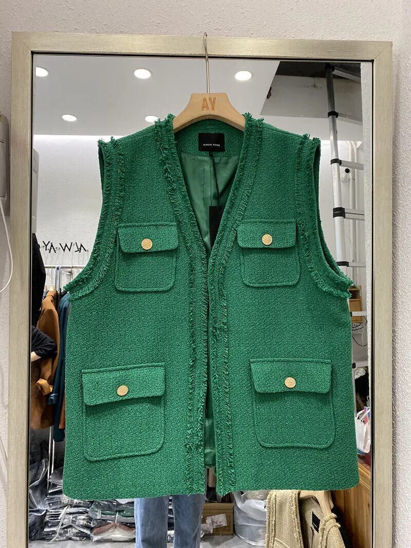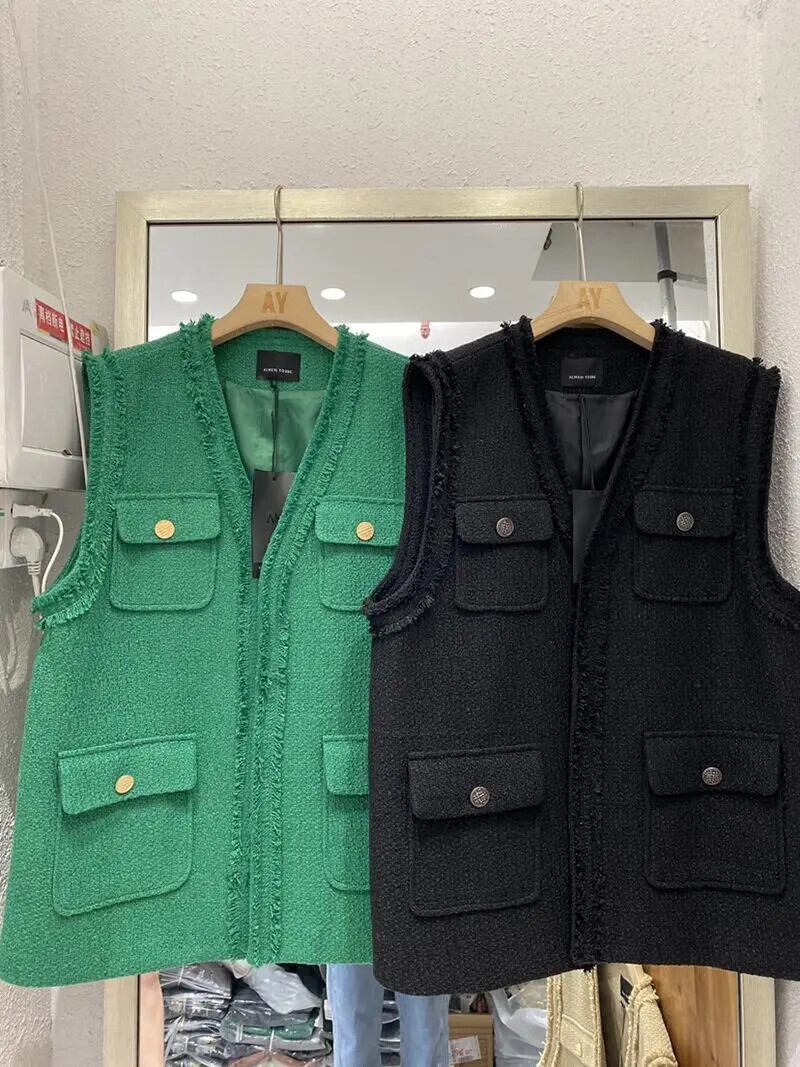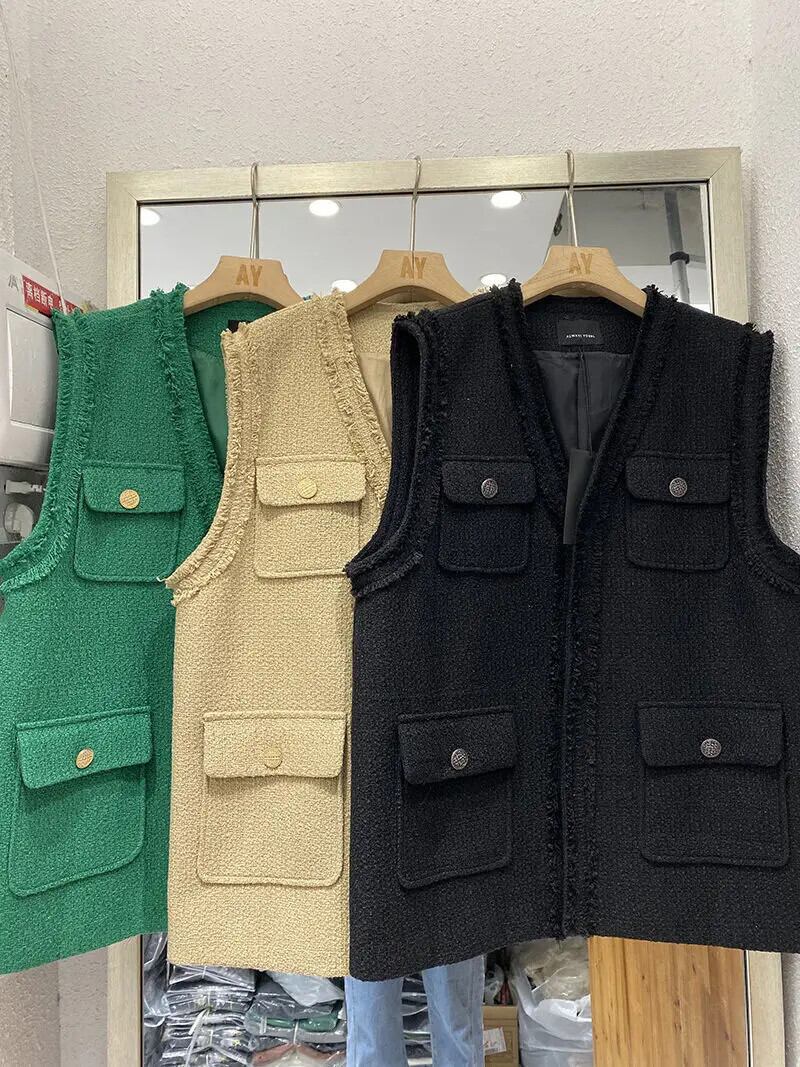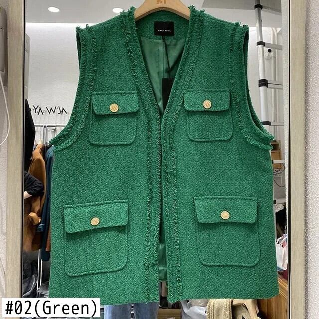 香り良いツイードベストコート秋 V ネックグリーンブラックカーキチョッキ オータム 秋物 Vネック