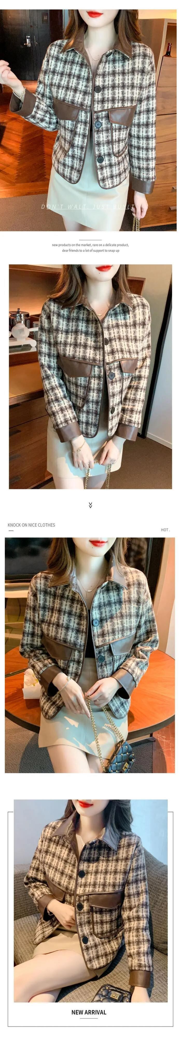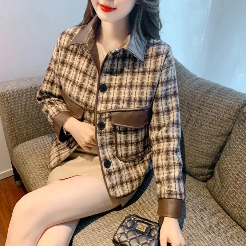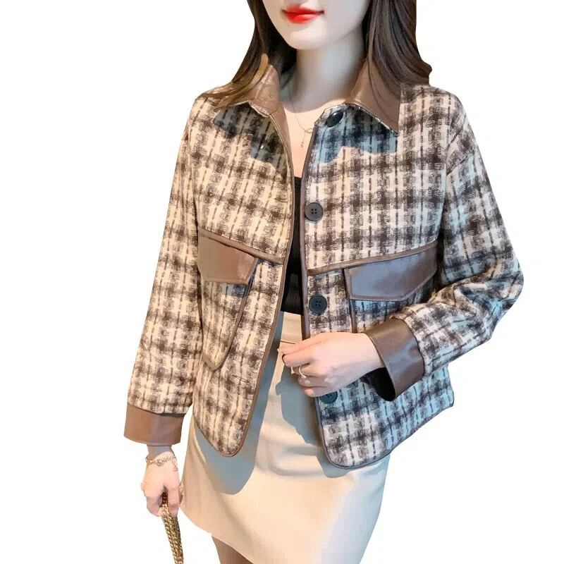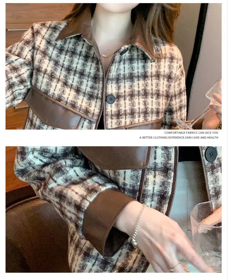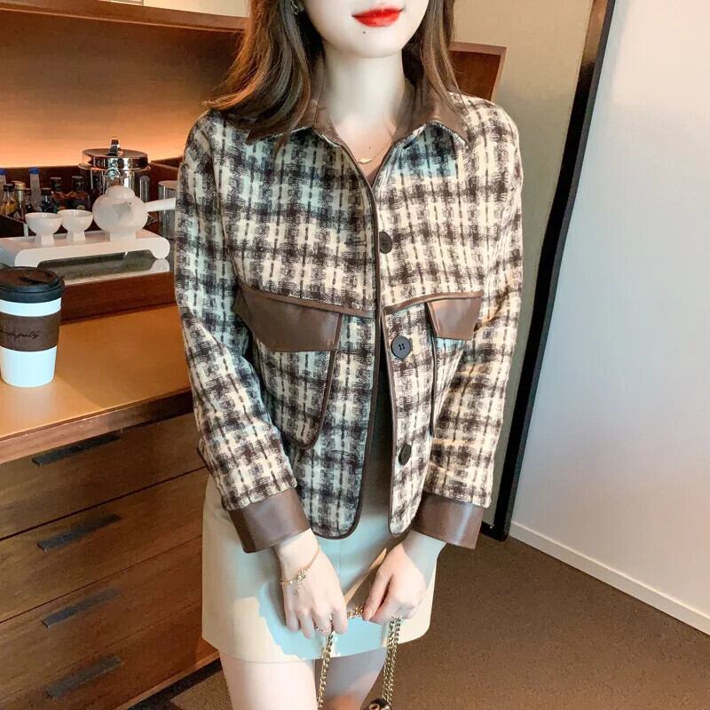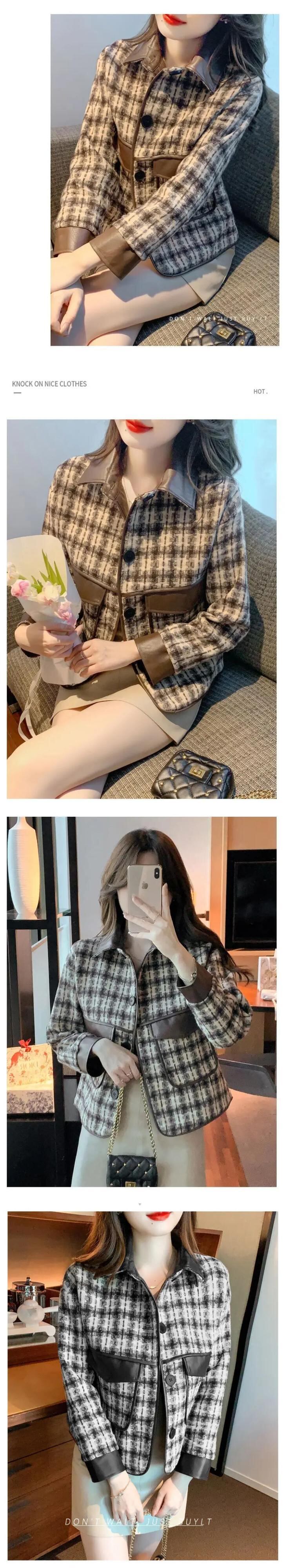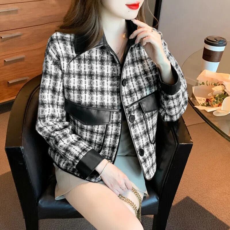ラペルシングルブレストルーズ長袖オートバイレザージャケットシックチェック柄ショートコートストリート原宿 ロング かわいい