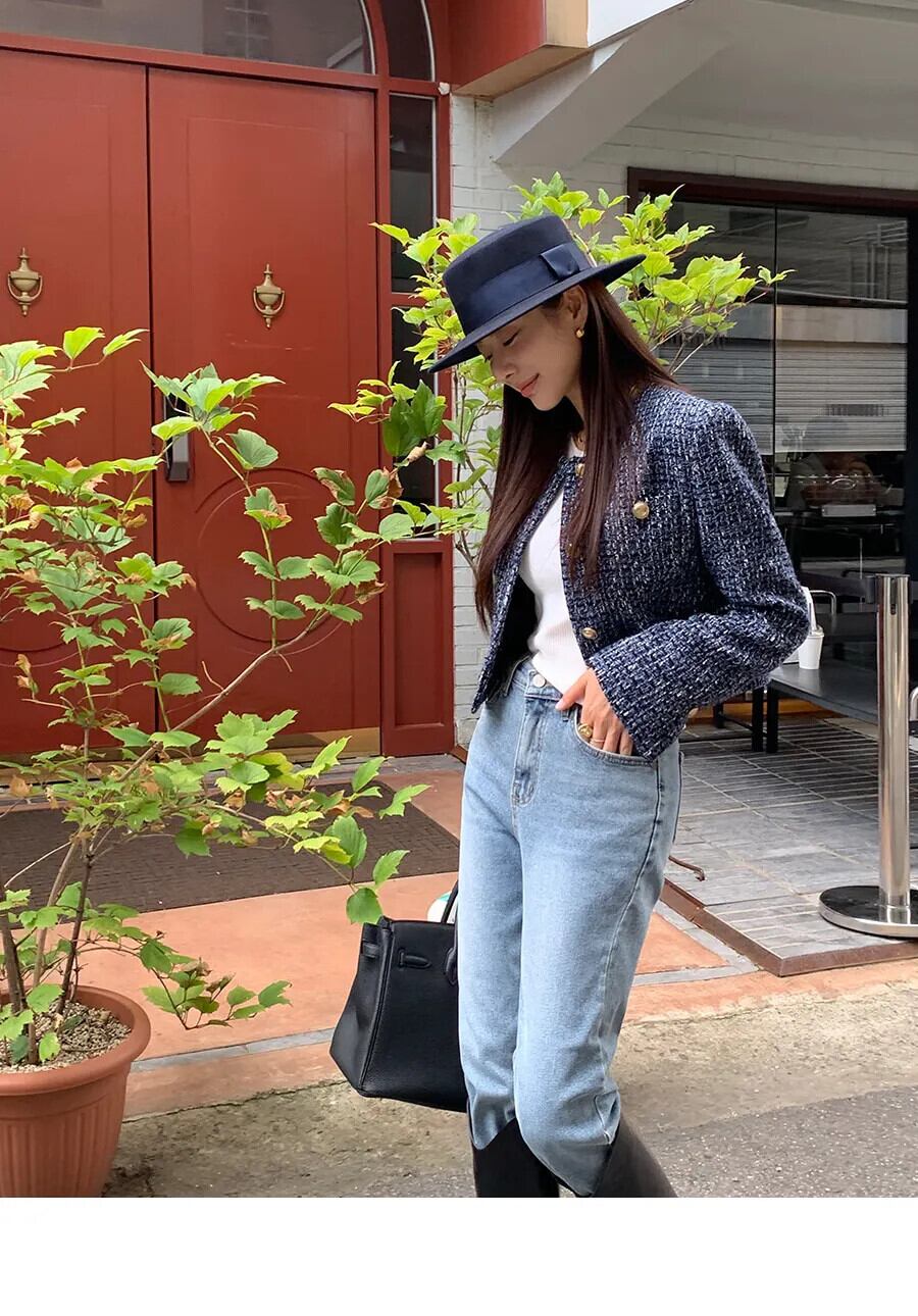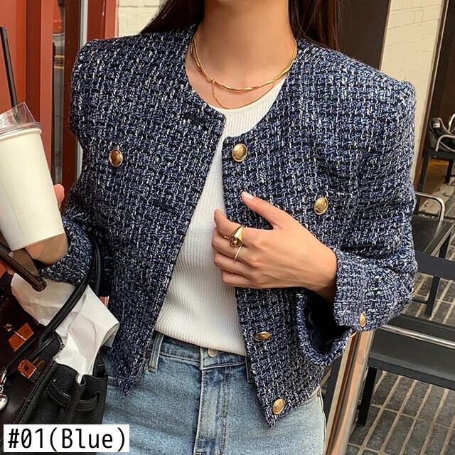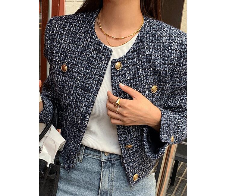 シック秋香りラウンドネックメタルボタンルーズリラックス長袖ツイードコートジャケット ロング オータム 秋物 Oネック