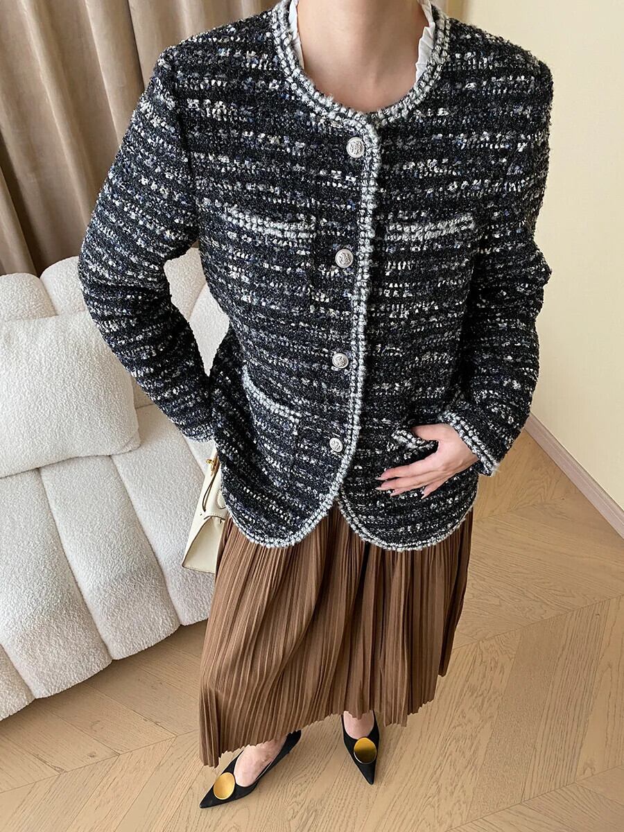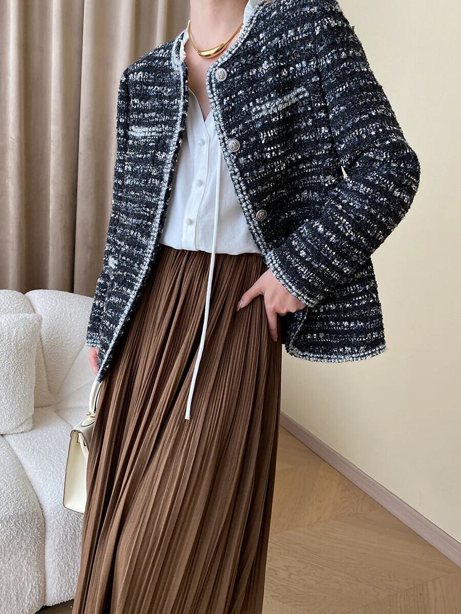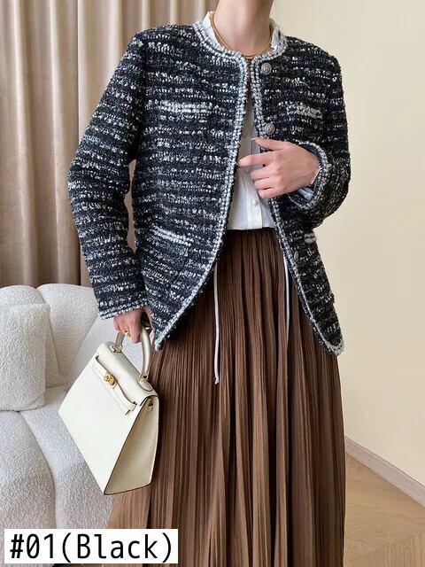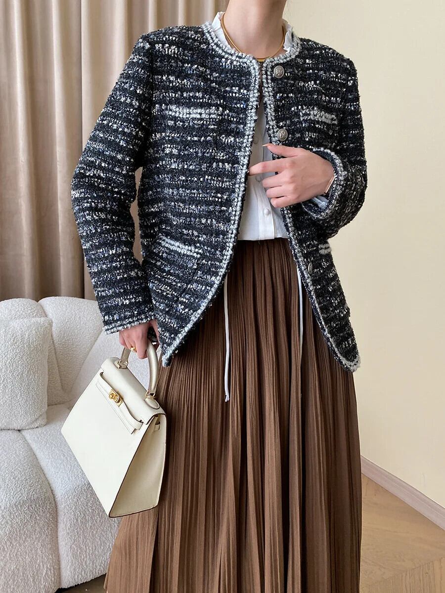 秋冬レディース Clic ラウンドネックモダンコントラストフレグランスウールコートツイードジャケット オータム 秋物 ウィンター 冬物 Oネック