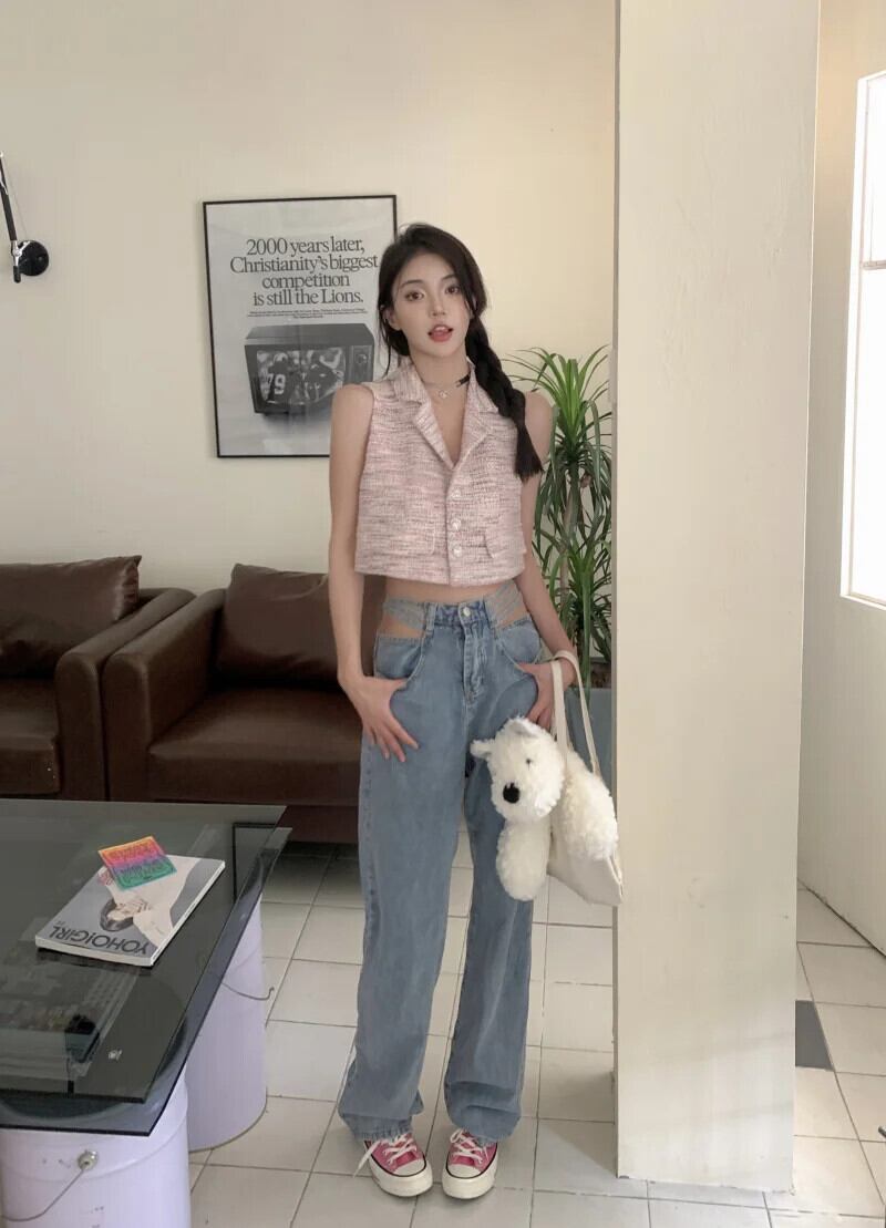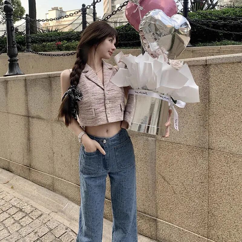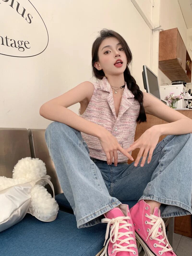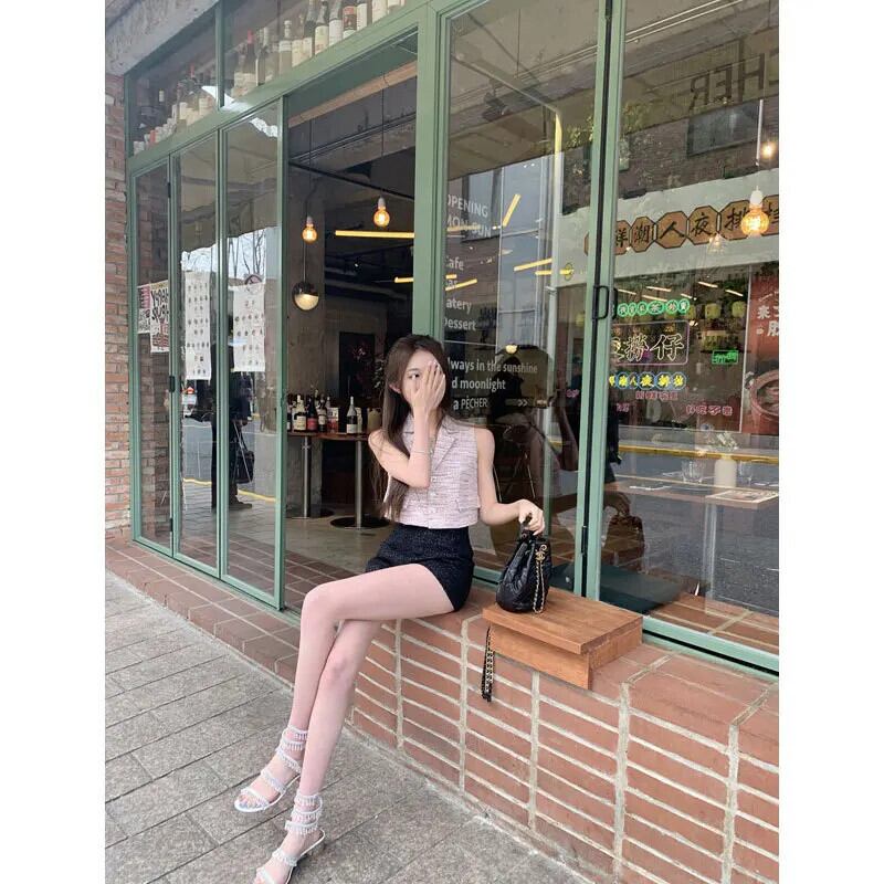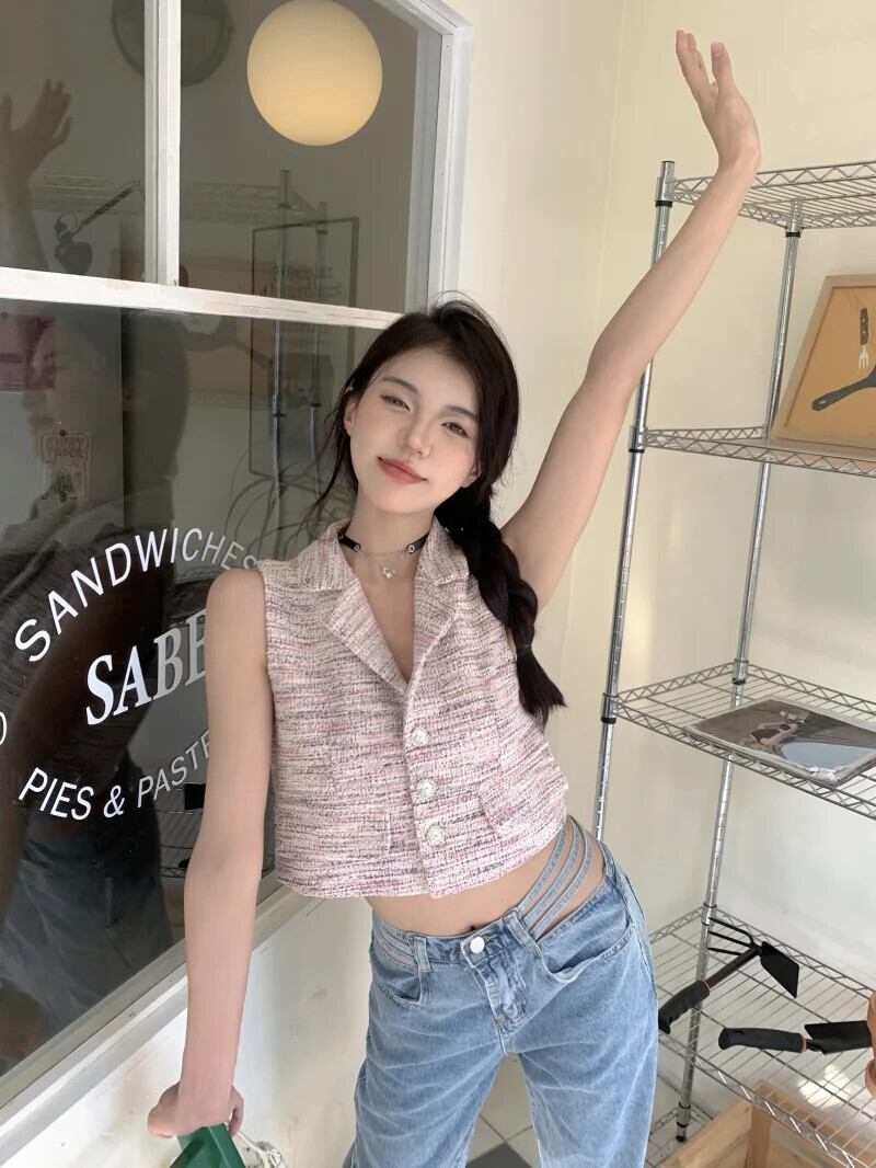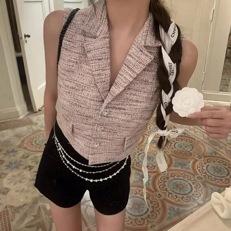 フレグランス ツイード チョッキ レディース 夏 セレブ スーツ 襟 ニット ベスト ショート ノースリーブ 半袖 ハーフスリーブ サマー 夏物