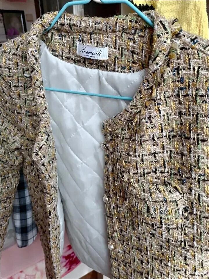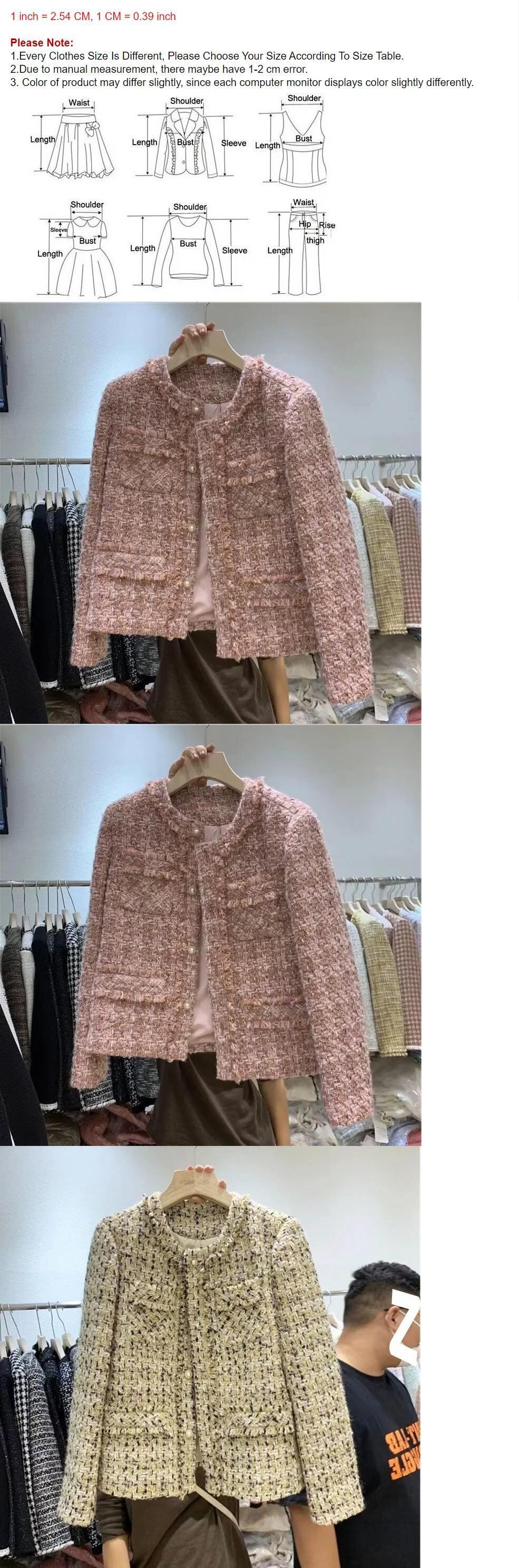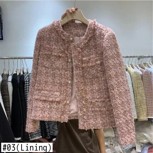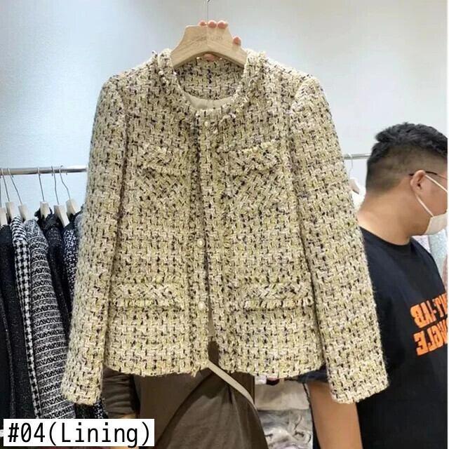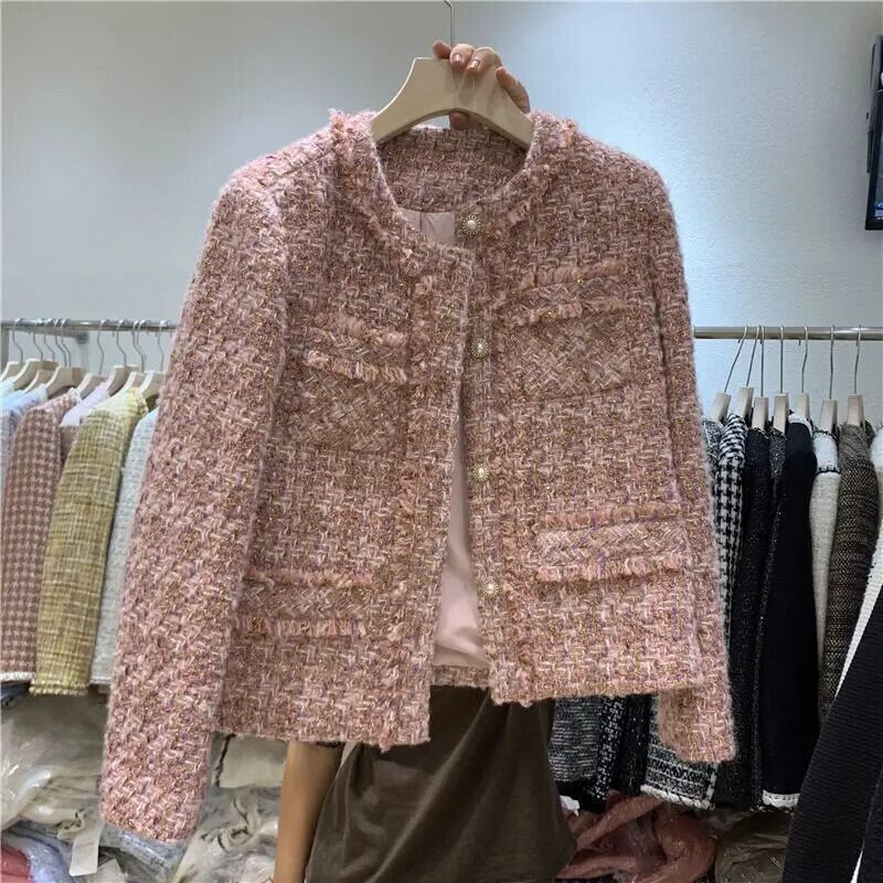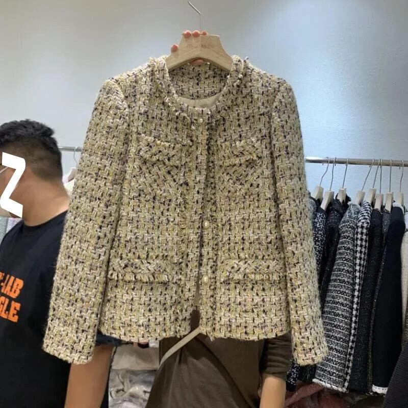 シックツイードチェック柄スーツジャケット O ネック長袖シングルブレスト綿パッド入りコート ロング コットン Oネック