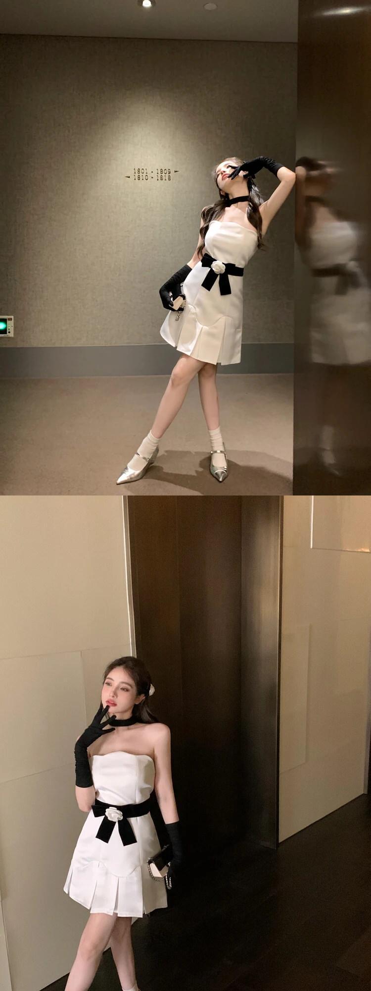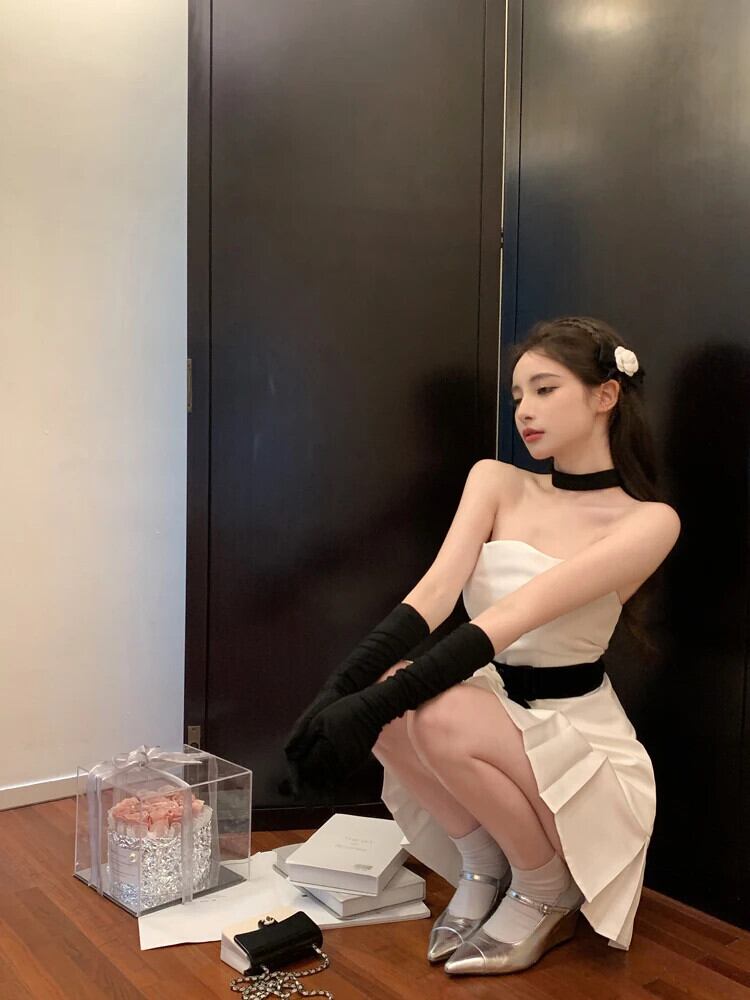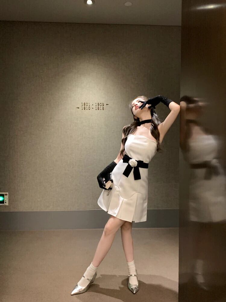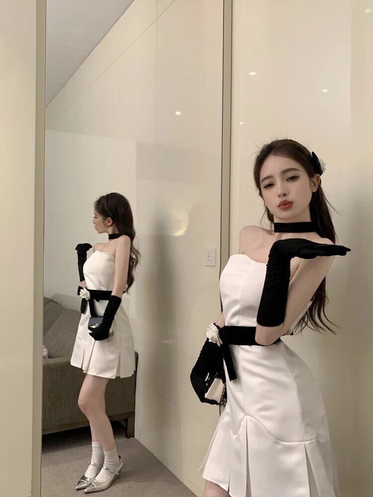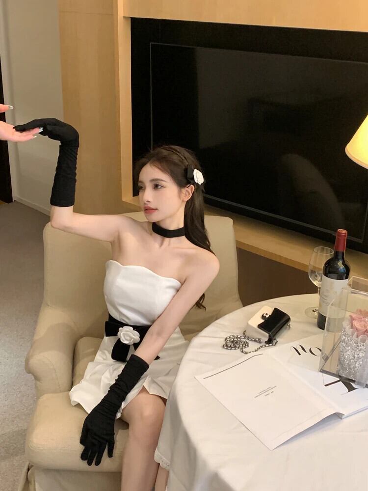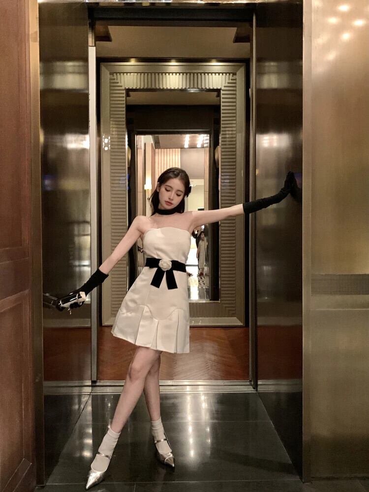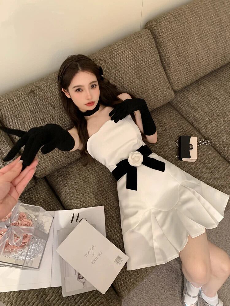 黒ちょう結び白椿サマーブラジャーパーティードレス Hotsweet スリム ホワイト ブラック リボン 大人ガーリー スウィート キュート カジュアル 夏物