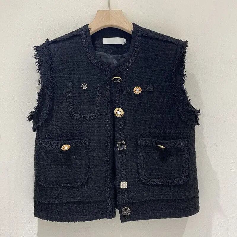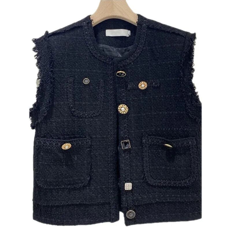 秋気質多彩ショートスタイル香り良いウールベストジャケット黒チョッキ ブラック オータム 秋物