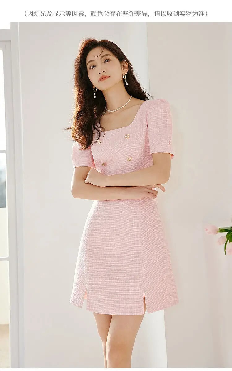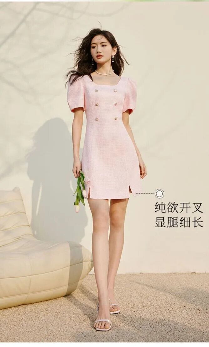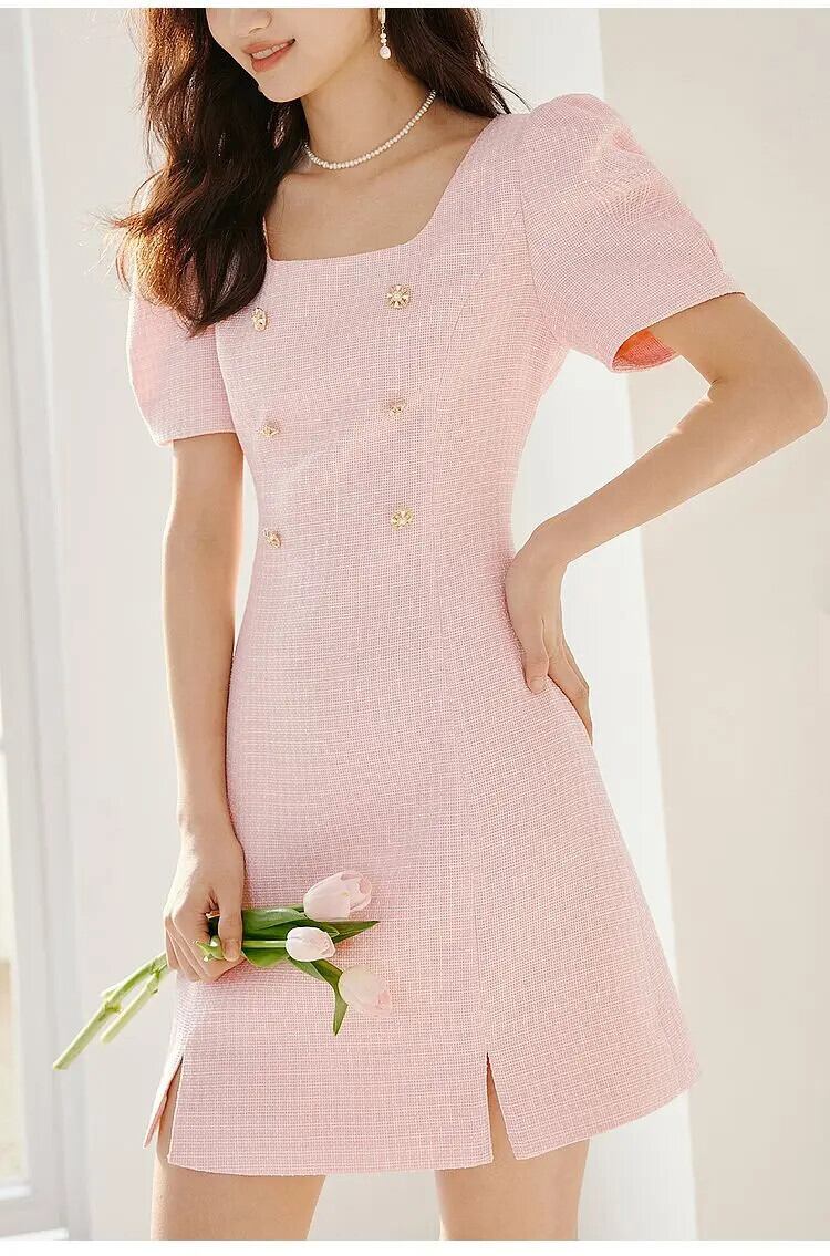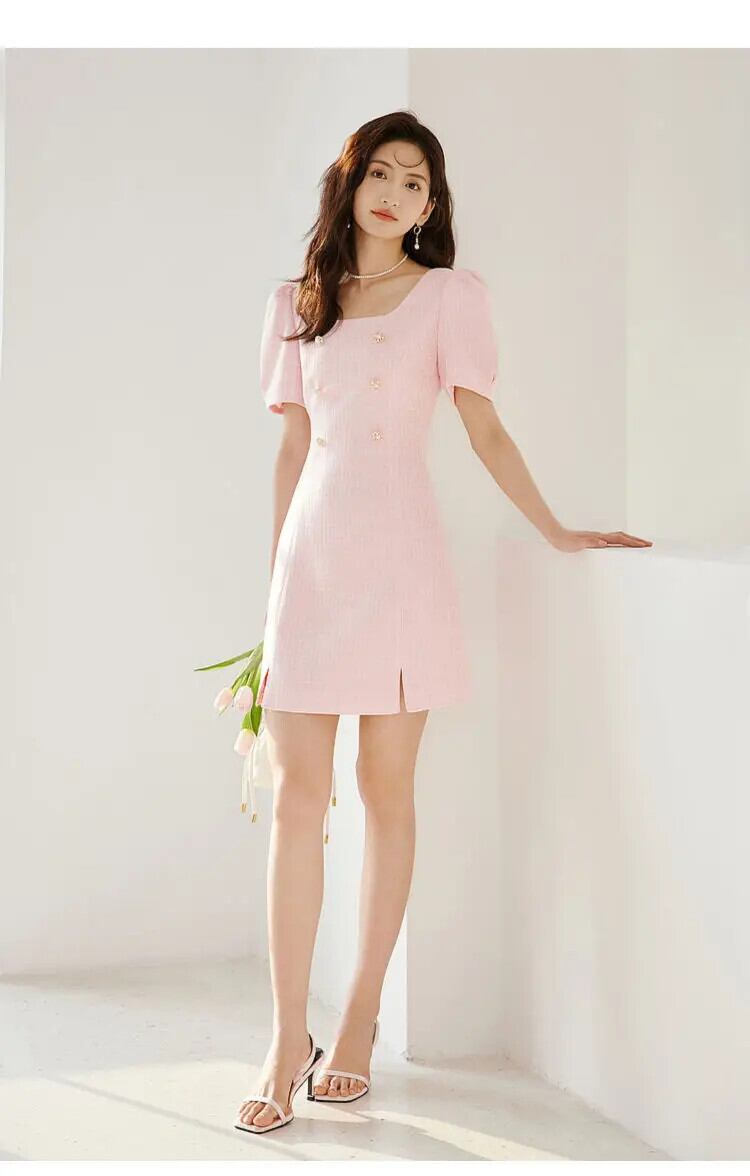トレンディ人気夏スクエアネック甘い高貴ピンクバブルスリーブ粗いウールドレス 大人ガーリー スウィート キュート カジュアル サマー 夏物 スクウェア