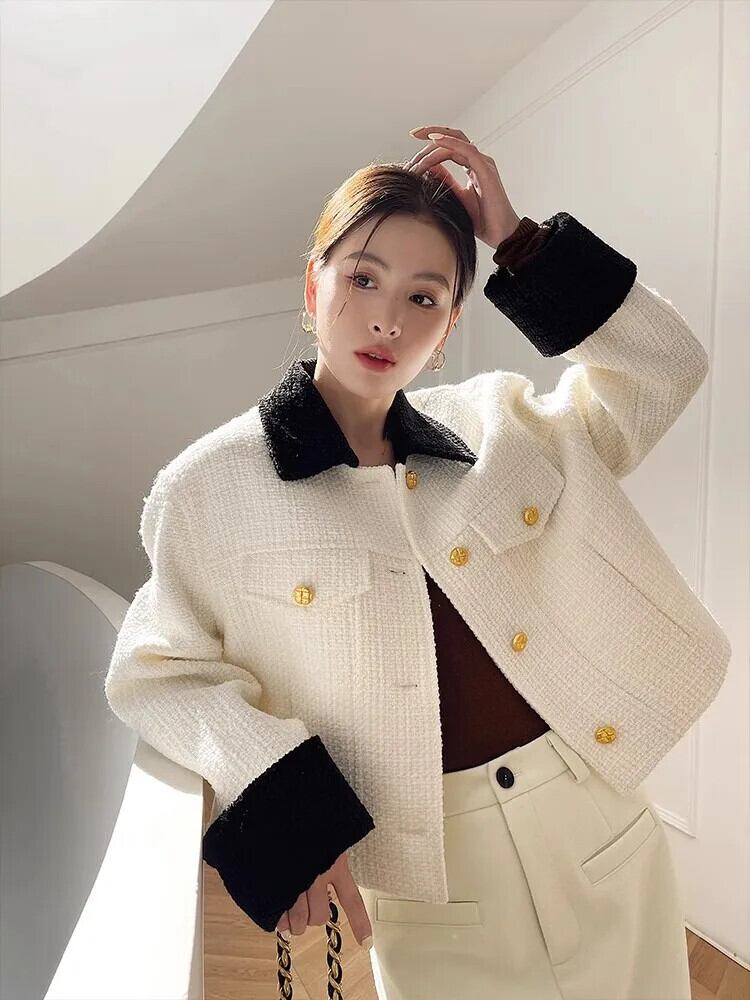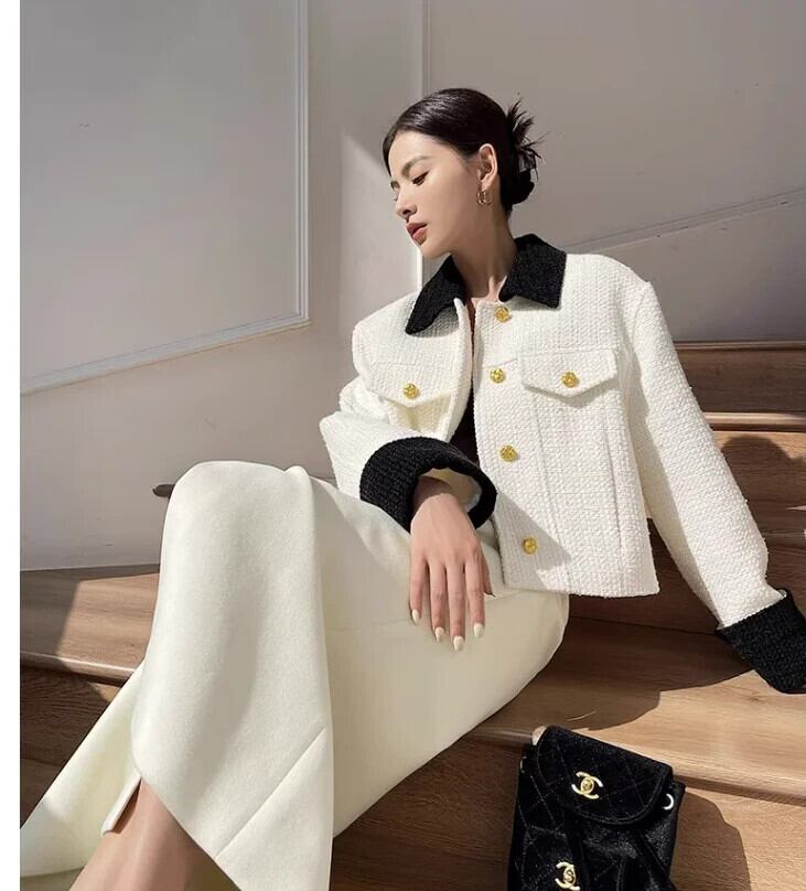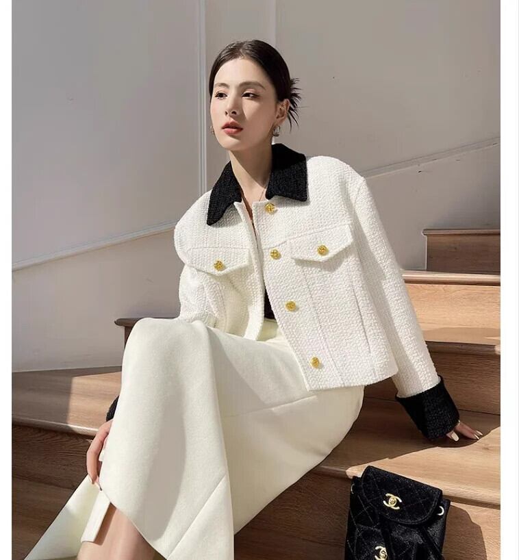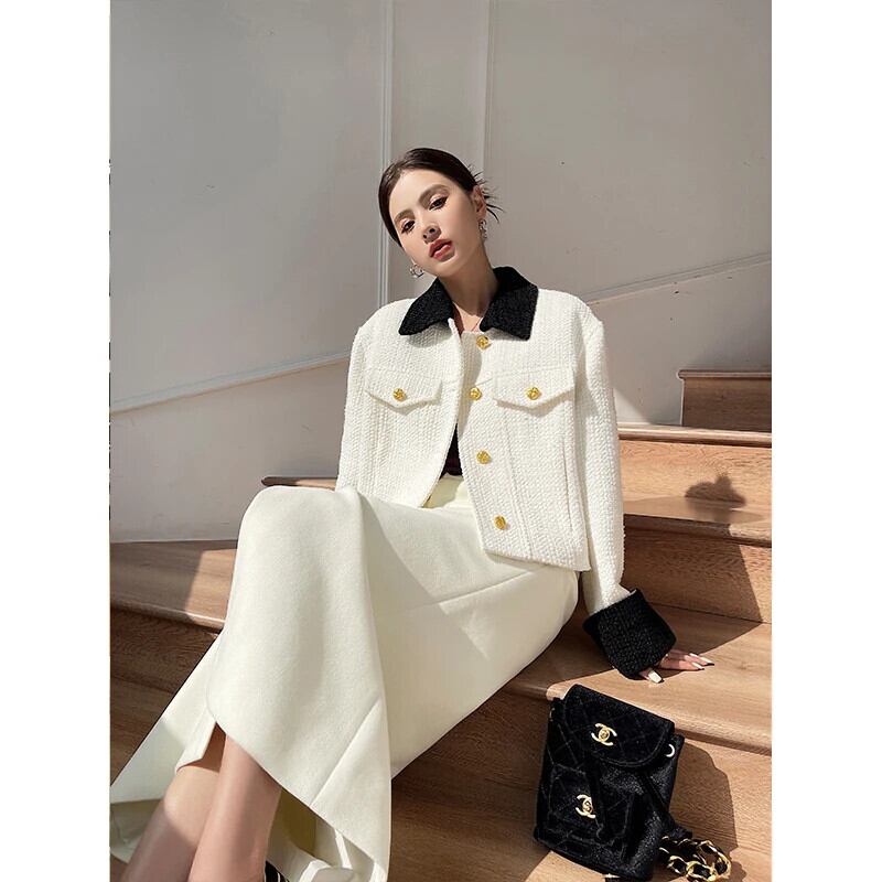 秋スタイル長袖ターンネックショートツイードスーツコートレディースホワイトブレザー ロング オータム 秋物