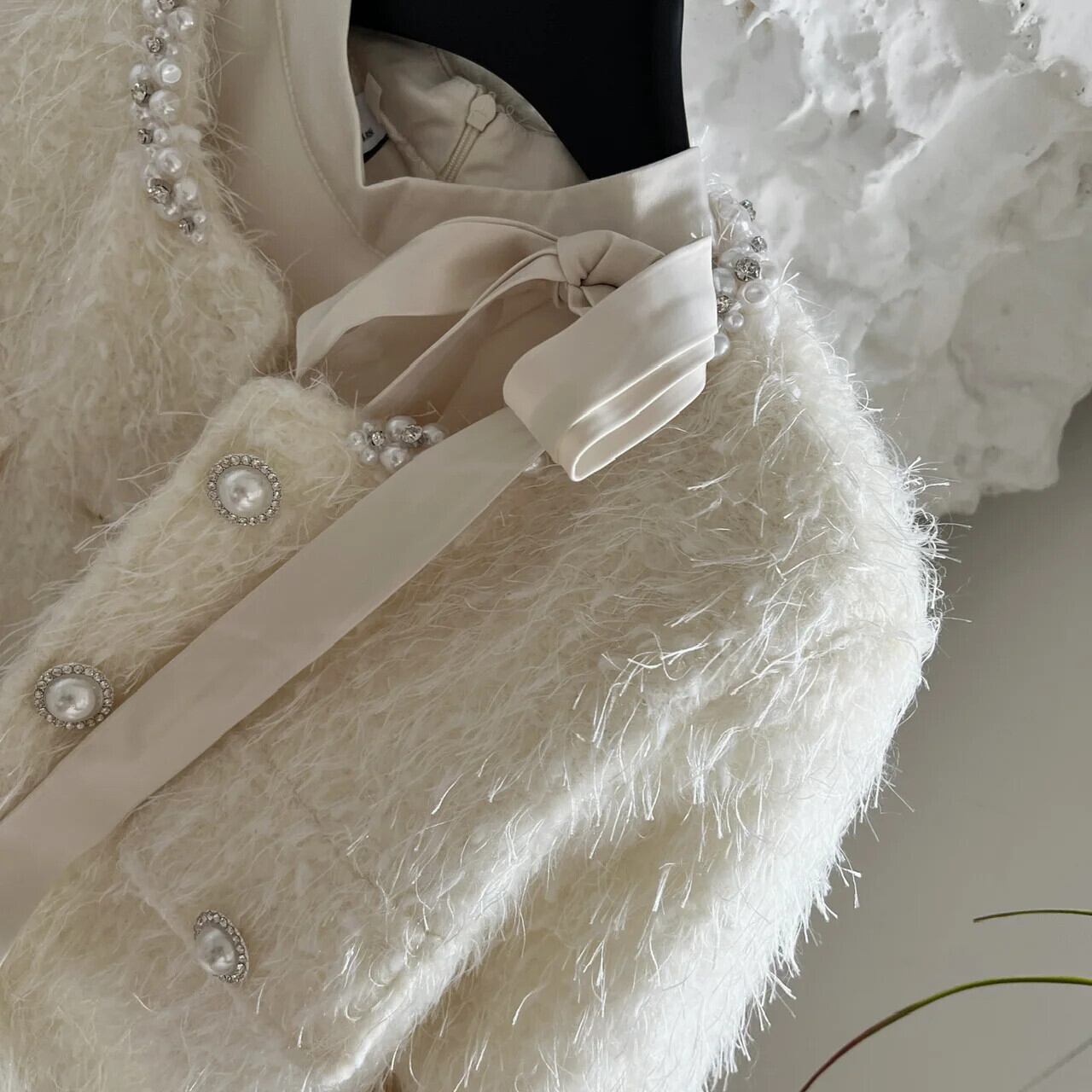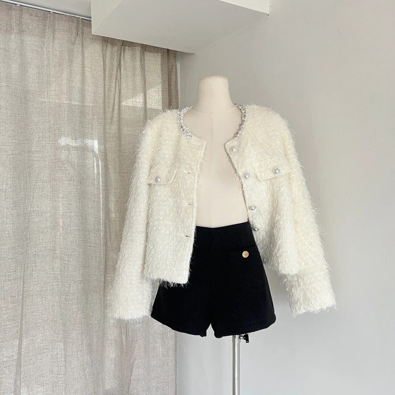 ウィンター スイート パール ネック ホワイト ウール フレグランス コート レディース ショート ジャケット 大人ガーリー スウィート キュート カジュアル 冬物 真珠