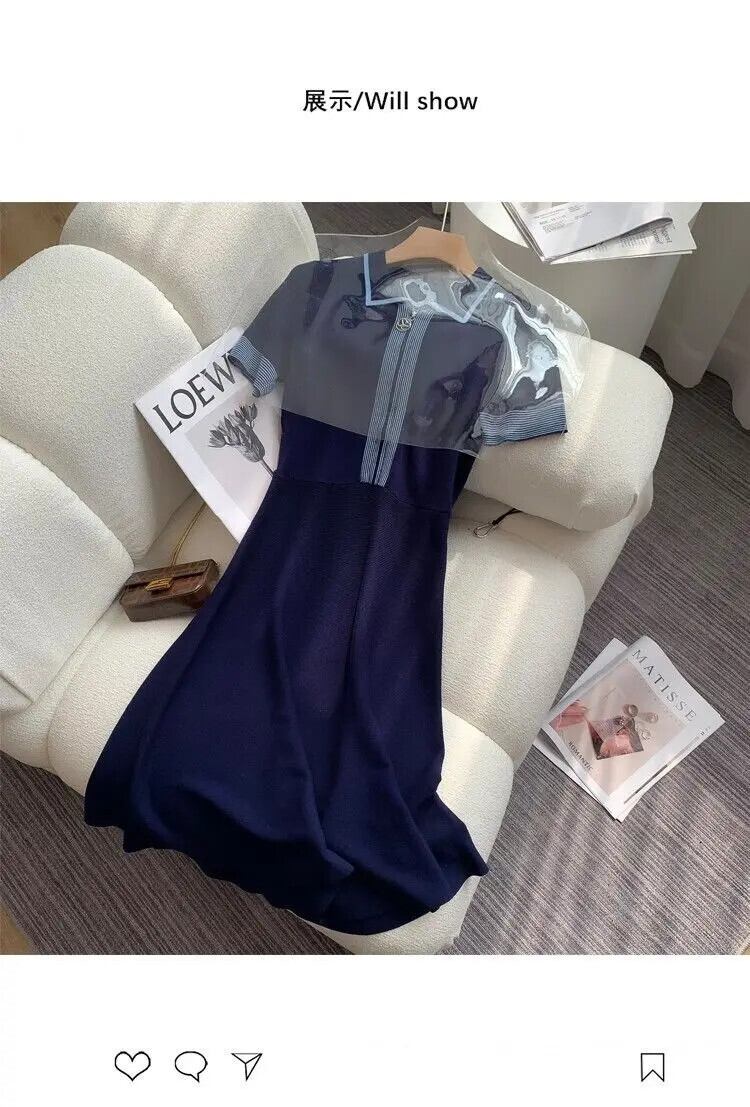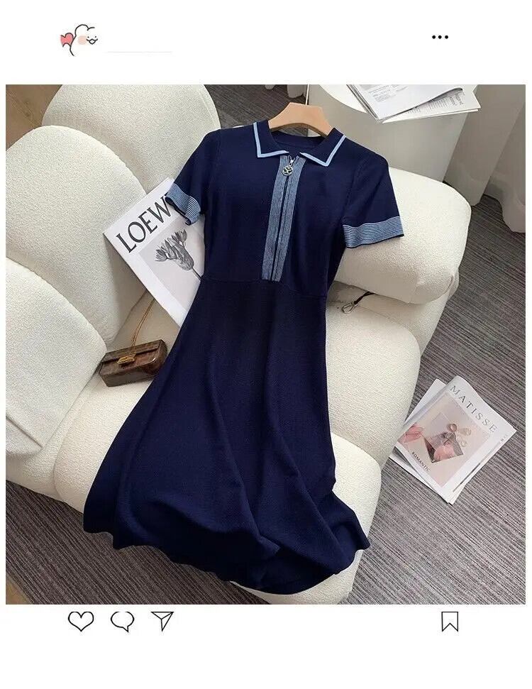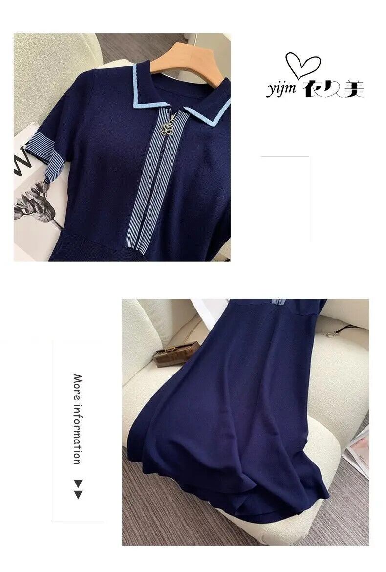 レトロブルー A ライン夏薄いジッパー半袖アイススタイルニットドレス ショート ハーフスリーブ サマー 夏物 Aライン シルク