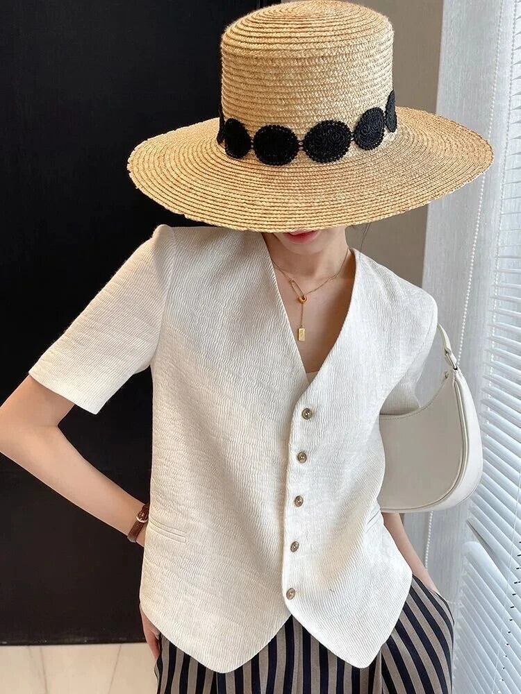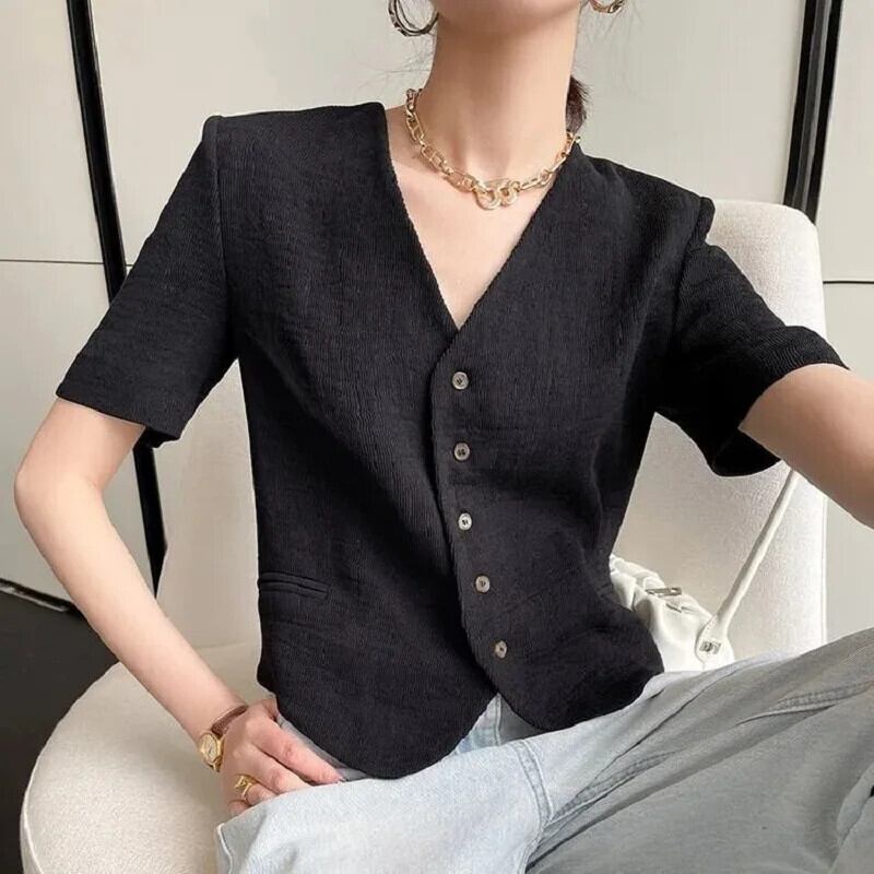 Y2K 気質シンプル V ネックスーツショートコート夏薄いシングルブレストブレザー サマー 夏物 Vネック