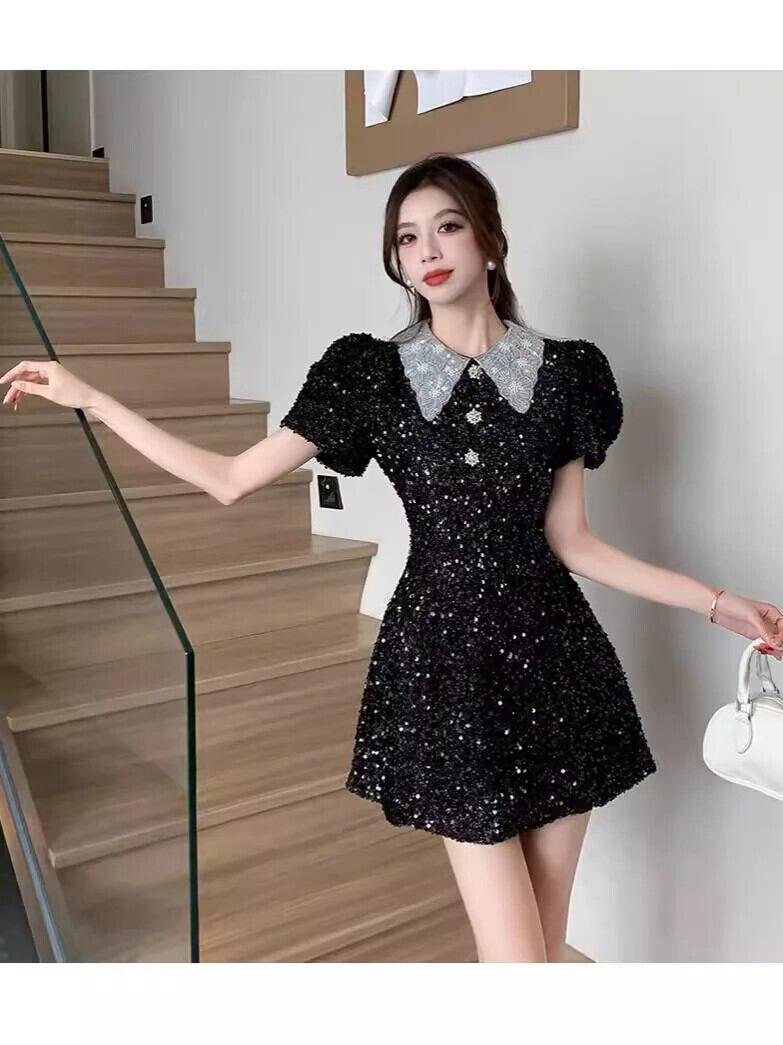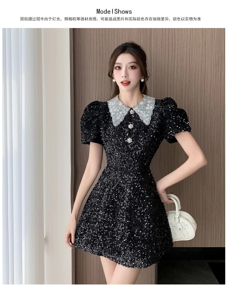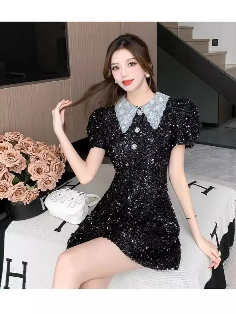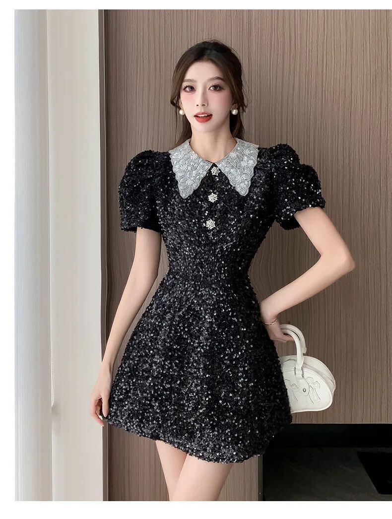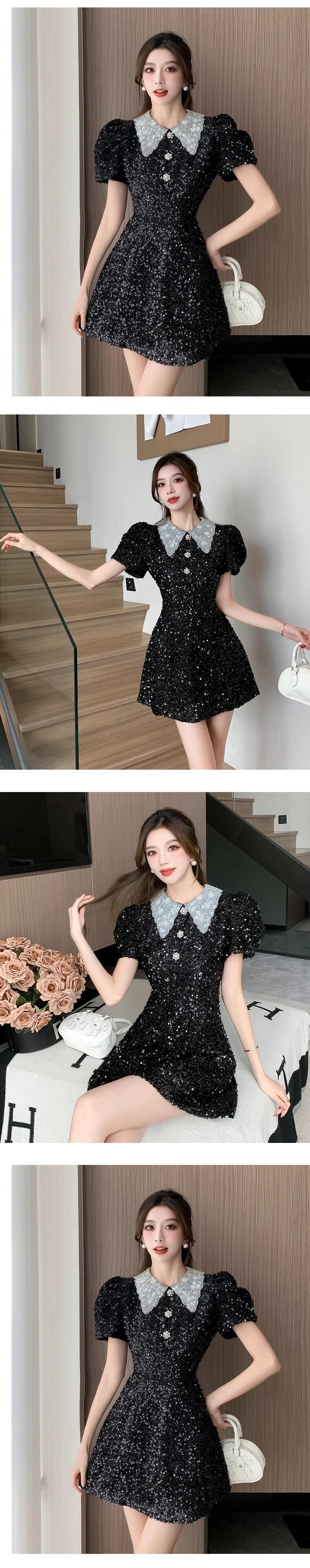 ブラック - サマーレディースパーティーフリップカラーコントラストスパンコールドレス 夏物