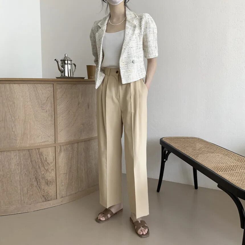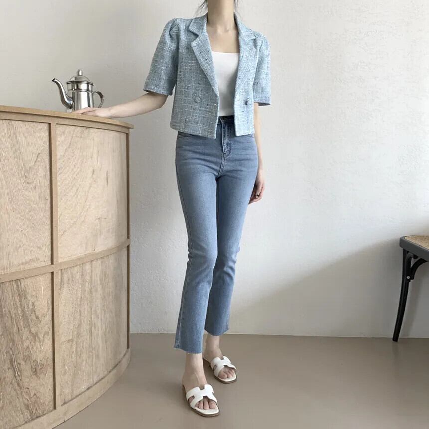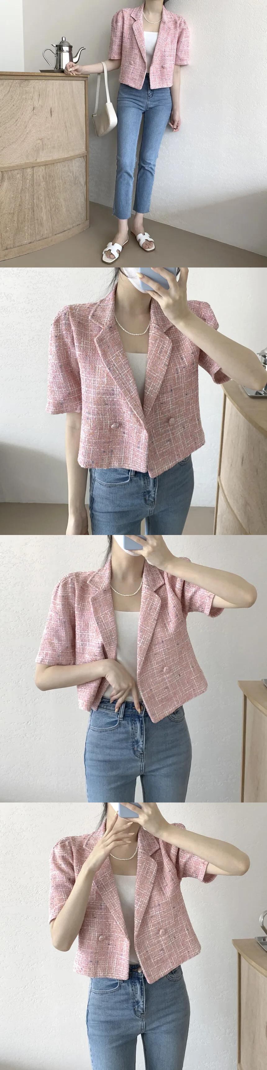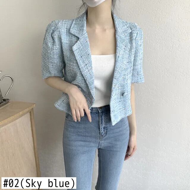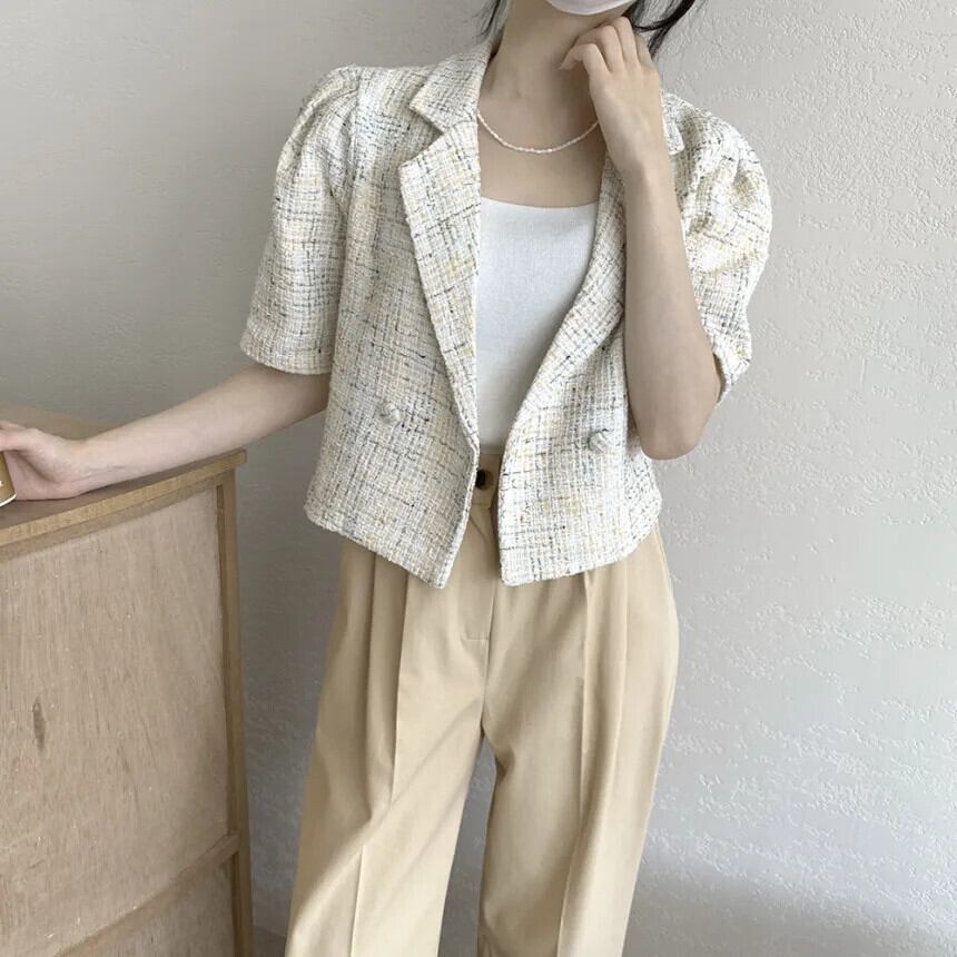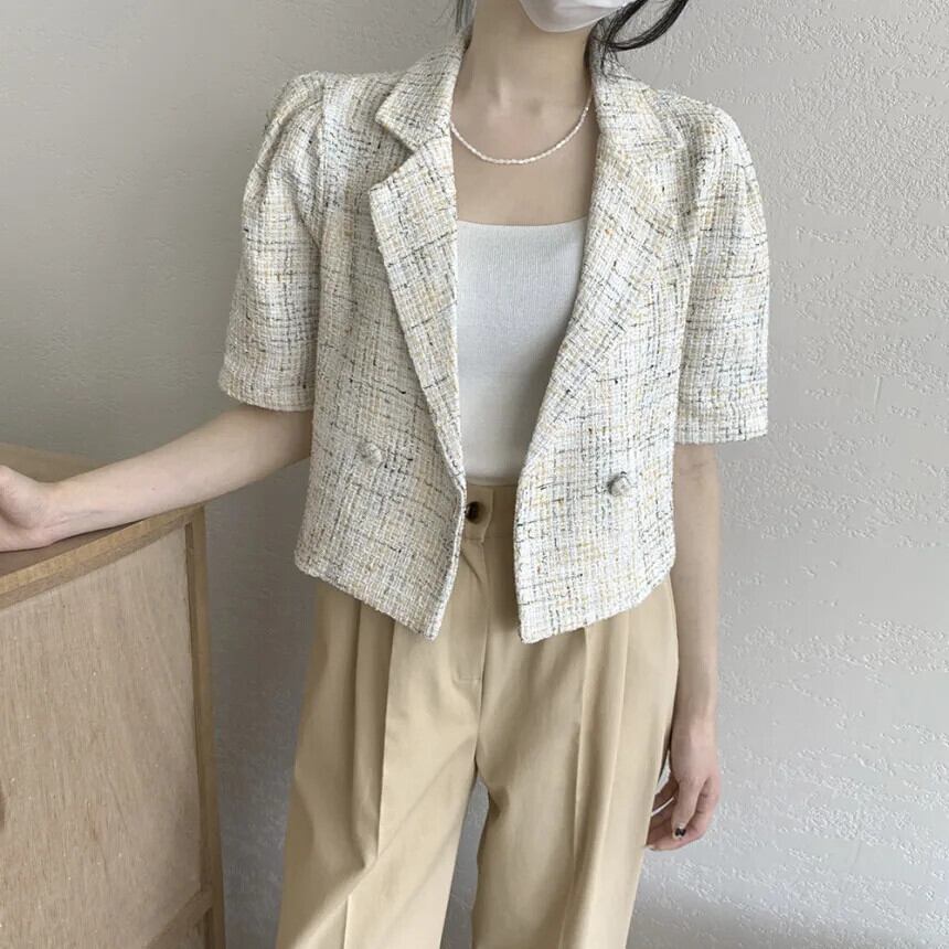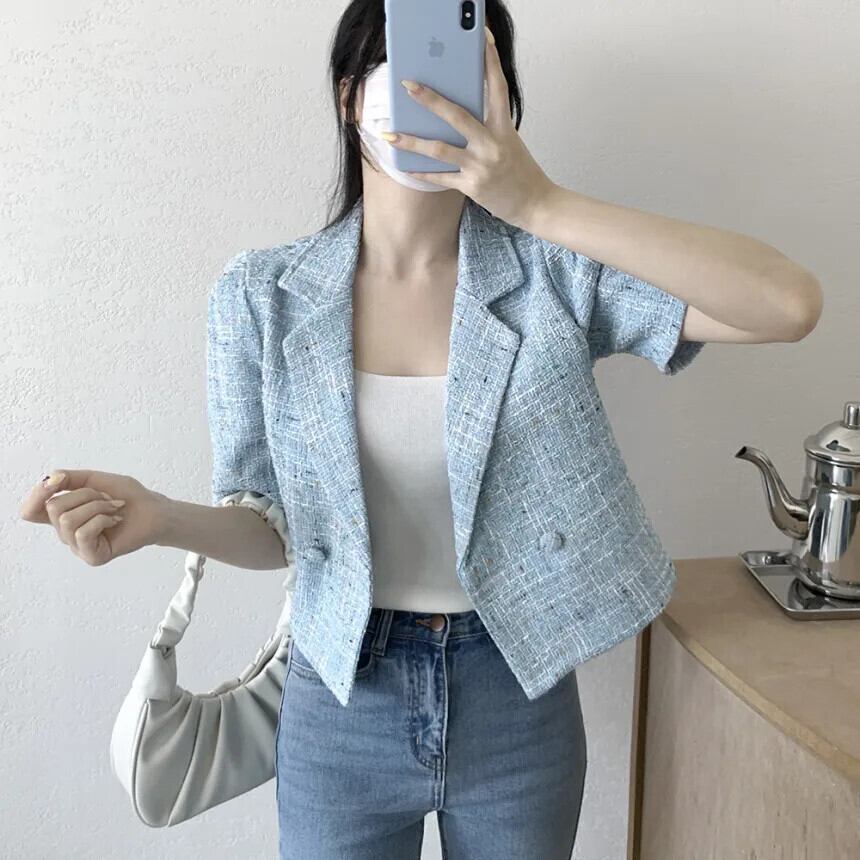 シック夏香りスーツコート二列 2 ボタンルーズ多用途半袖ツイードブレザー ショート ハーフスリーブ サマー 夏物
