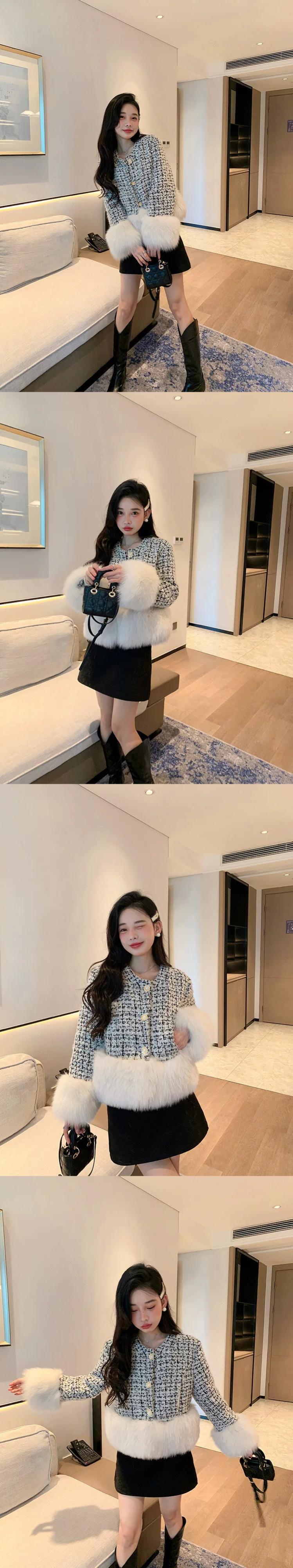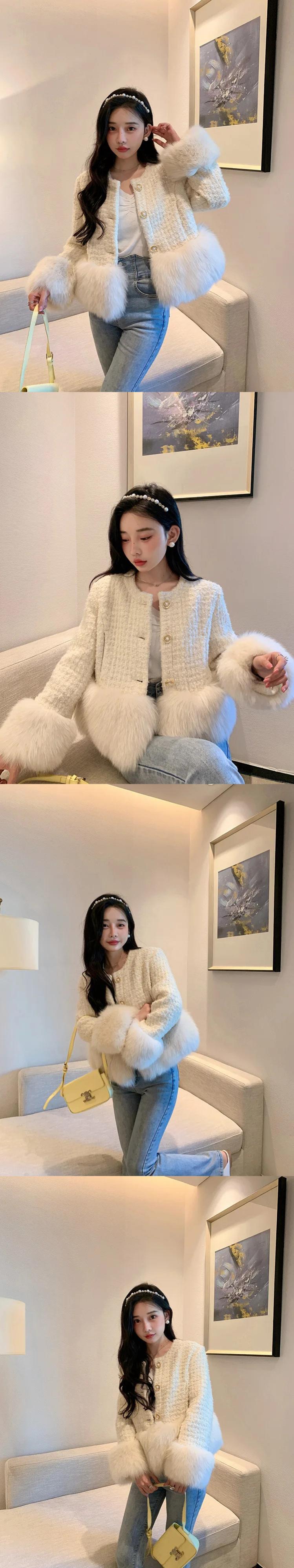 秋冬レディース ホワイト イミテーション フォックス ファー シングルブレスト ショート ジャケット - コットン/非綿ウール コート オータム 秋物 ウィンター 冬物