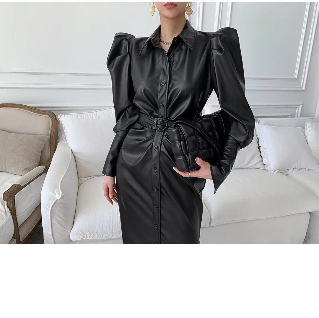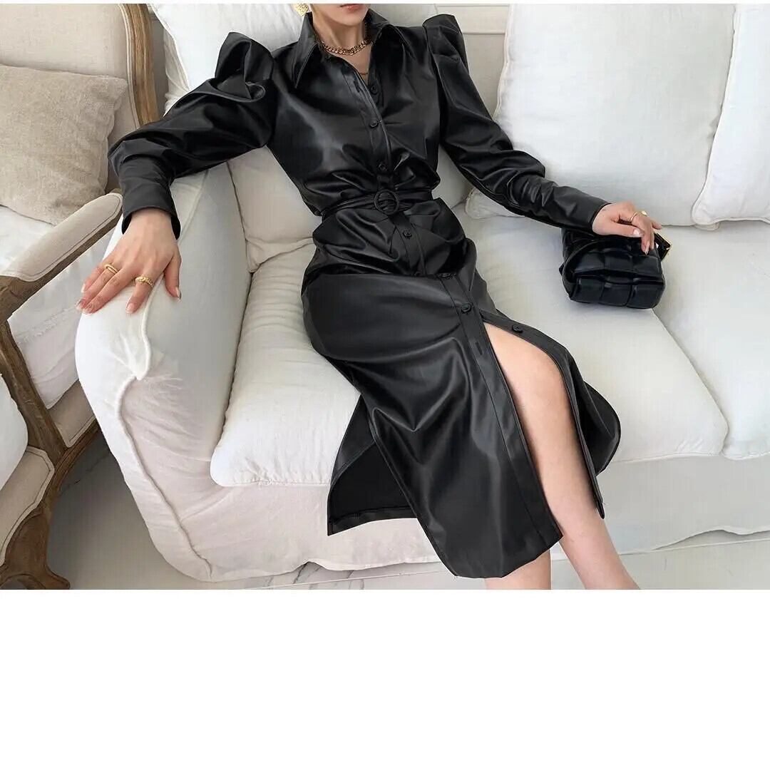 シック秋ラペルシングルブレストベルトウエストロングスプリットフォームスリーブPUレザーオートバイドレス オータム 秋物 ハーネス