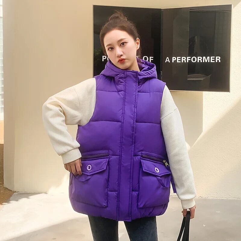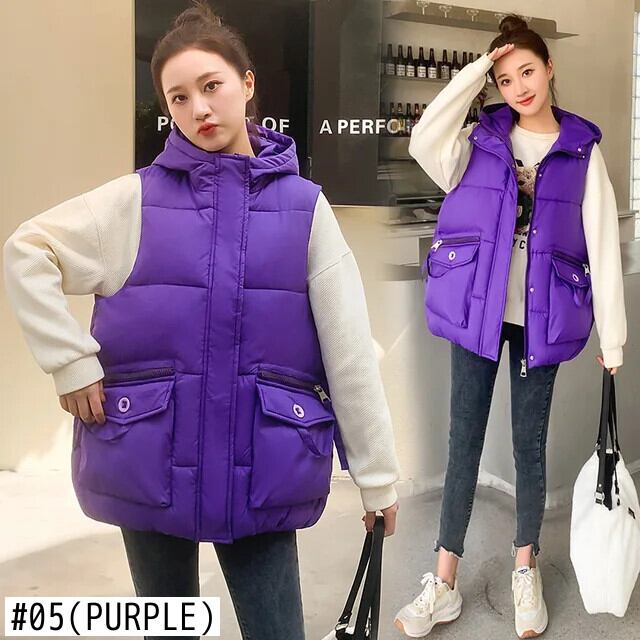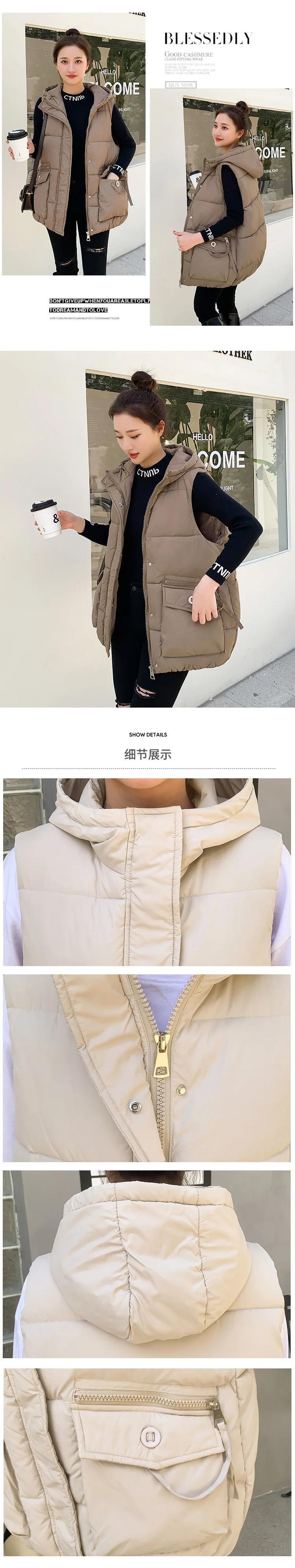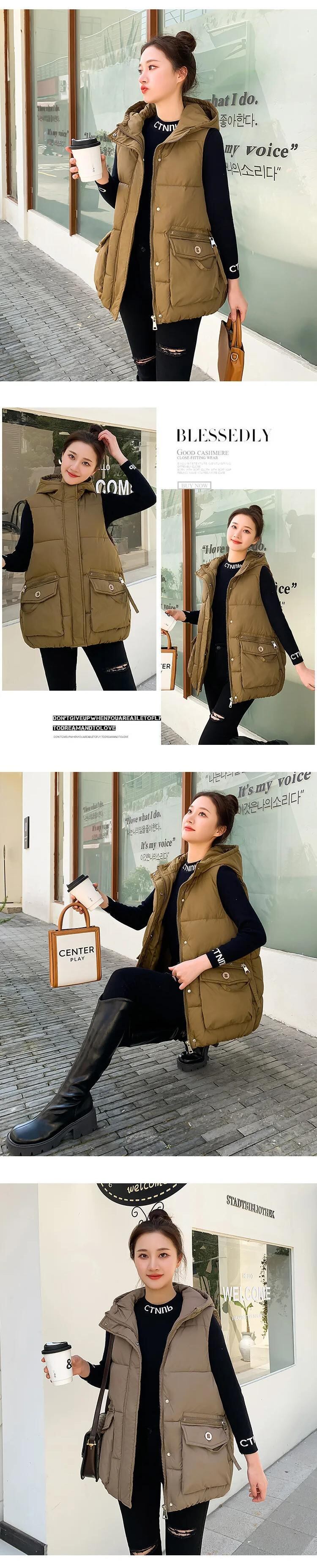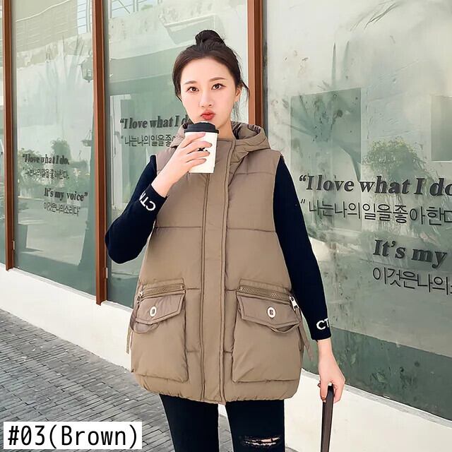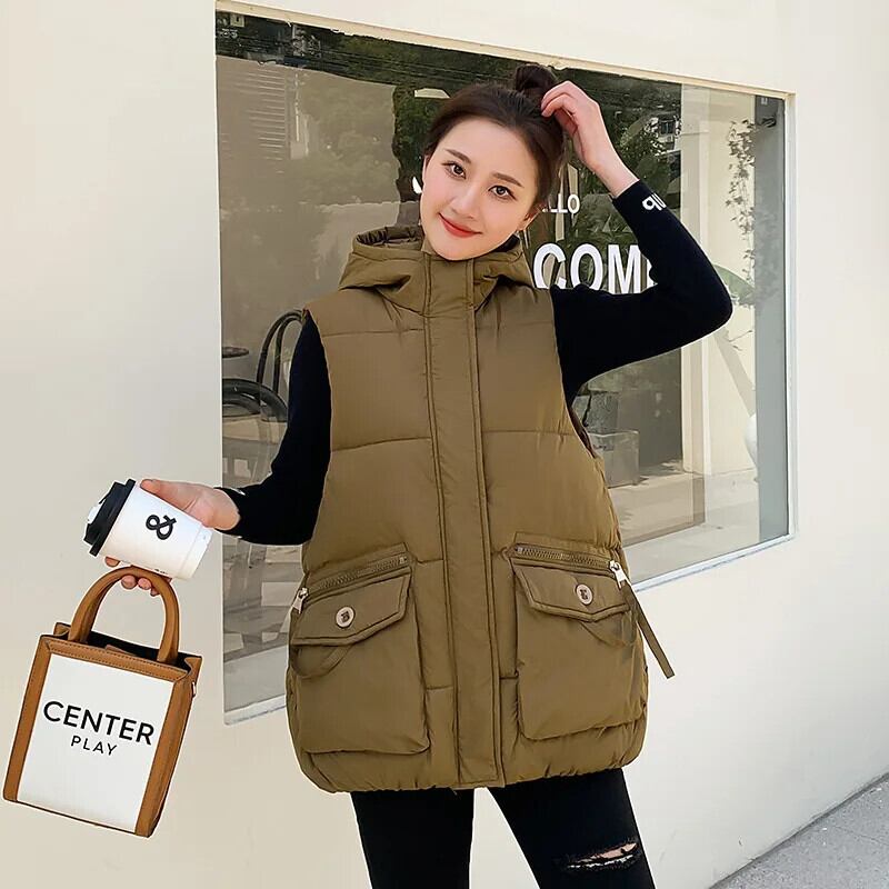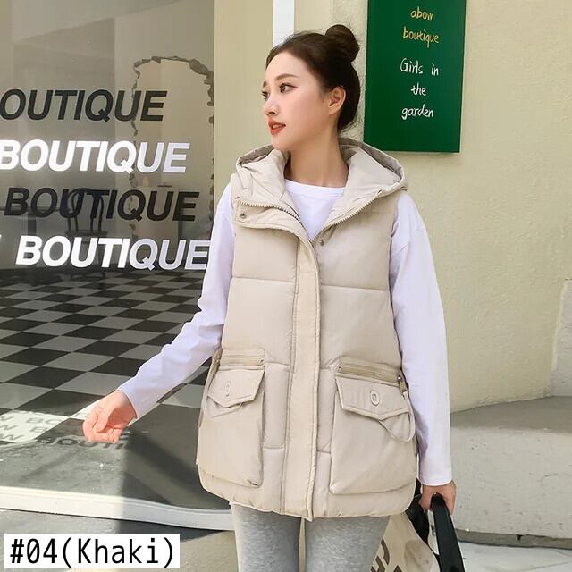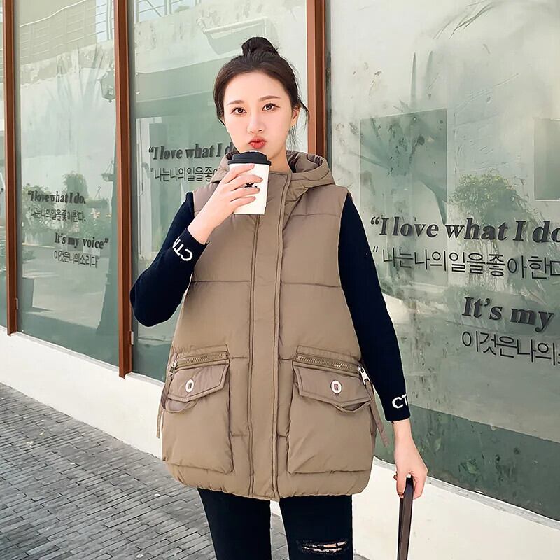 秋/冬ショートダウンコットンチョッキルーズフード付き暖かいベスト オータム 秋物 ウィンター 冬物