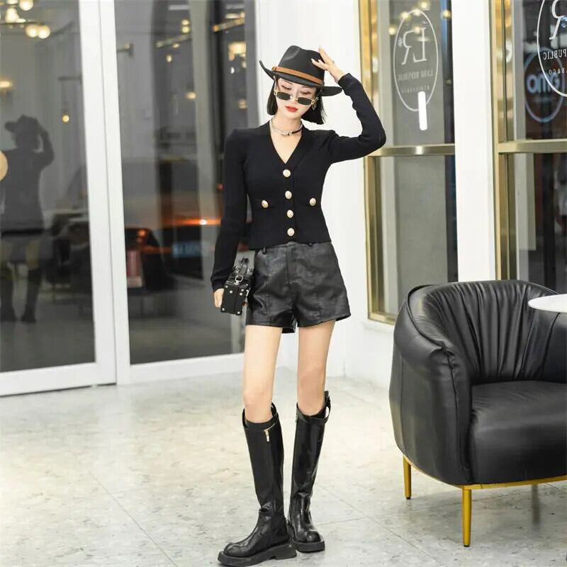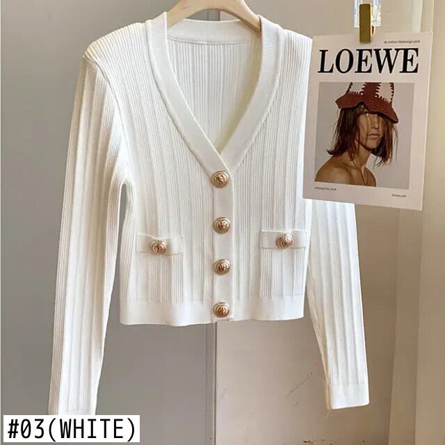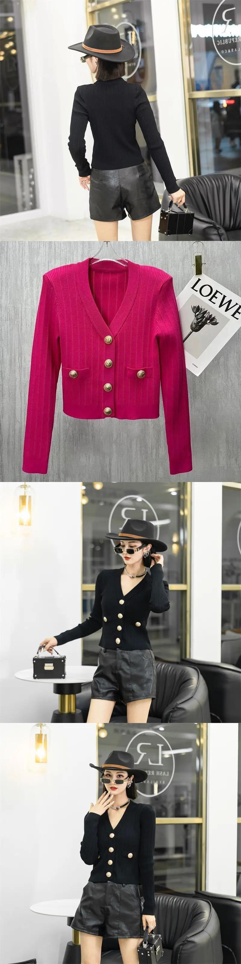 春セレブ V ネック重工業メタルバックルショートニットカーディガンセーターレディース スプリング 春物 Vネック