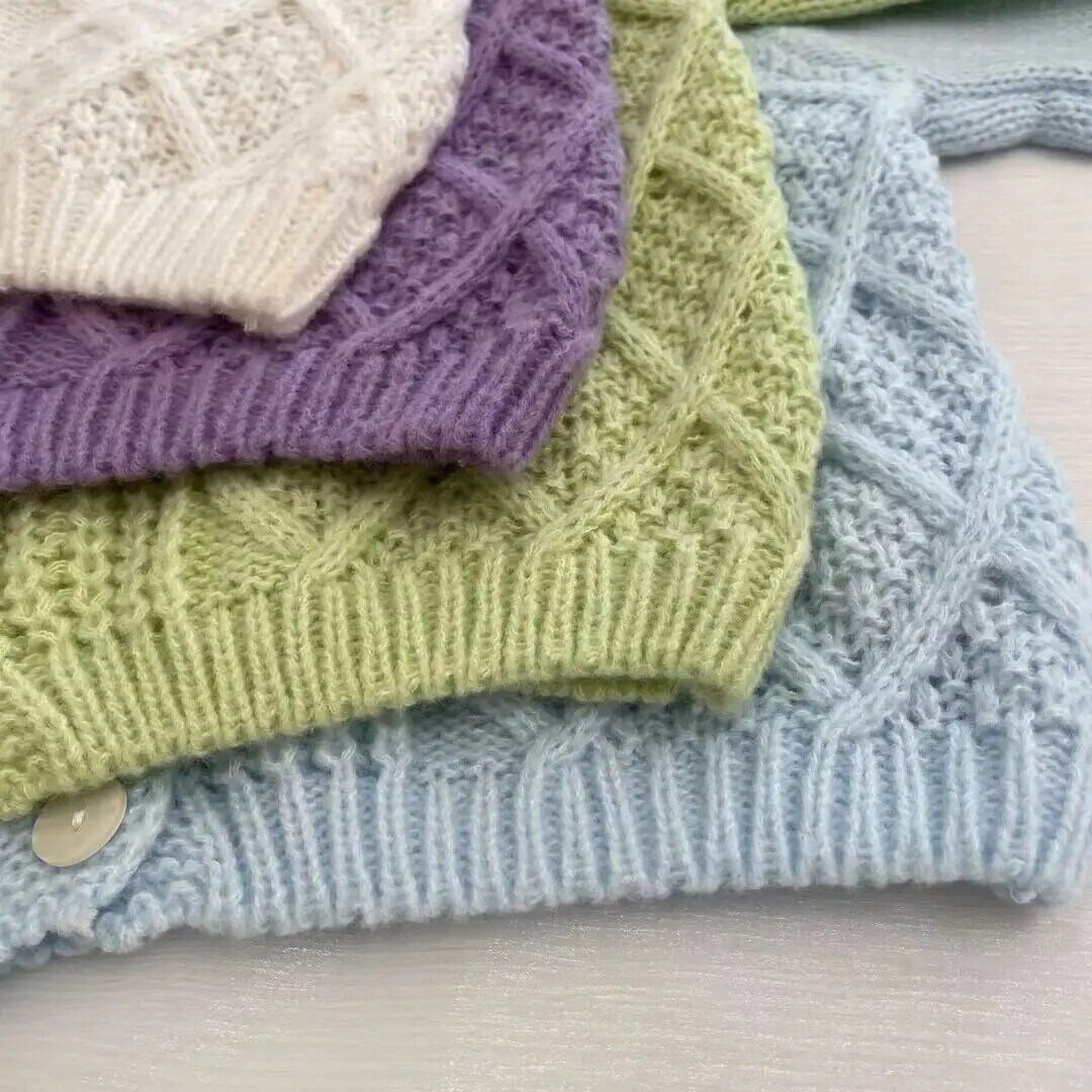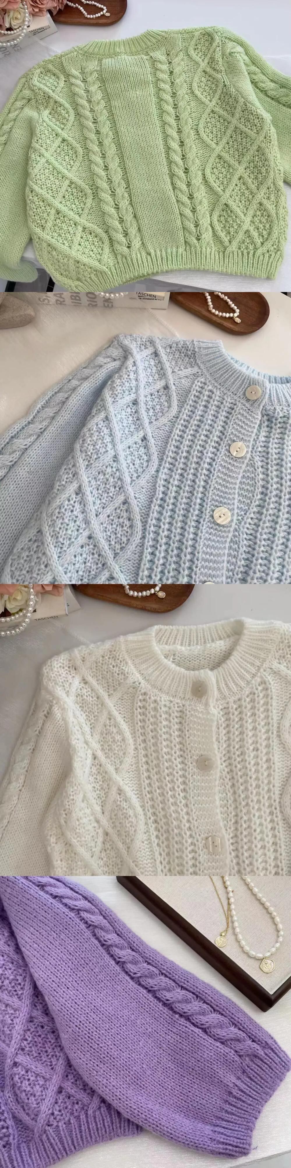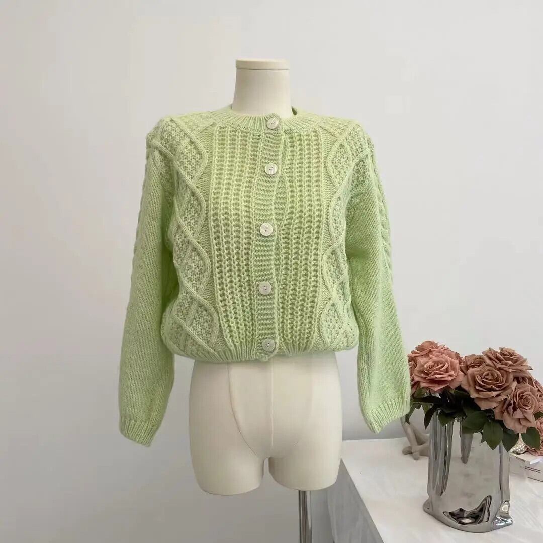 揚げ生地ツイストニットカーディガンモヘアラウンドネックバブルスリーブシングルブレストハンセーター秋 オータム 秋物 Oネック