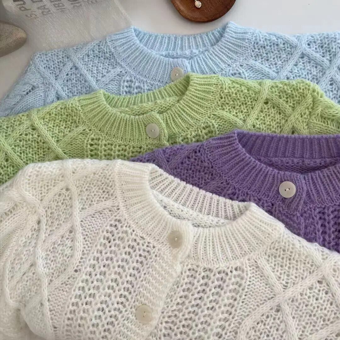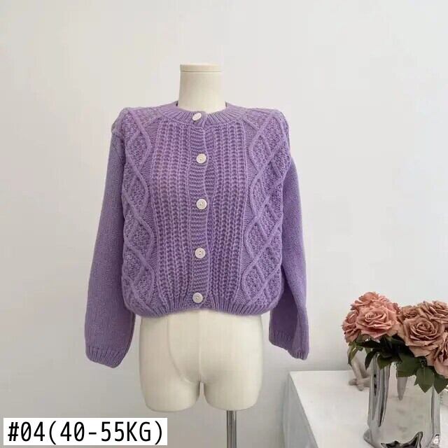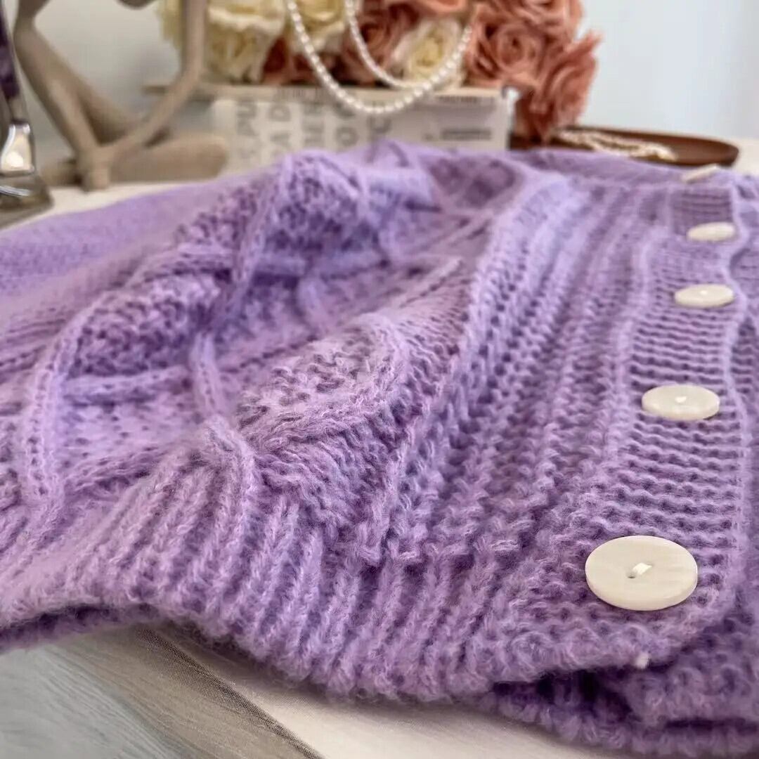 揚げ生地ツイストニットカーディガンモヘアラウンドネックバブルスリーブシングルブレストハンセーター秋 オータム 秋物 Oネック