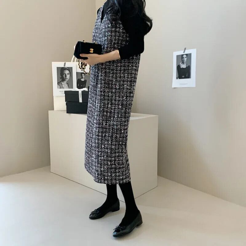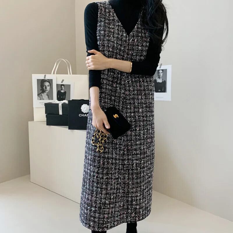 レディース ロング ツイード ノースリーブ タンク トップ ドレス ルーズ フィット 秋冬 ウィンター 冬物