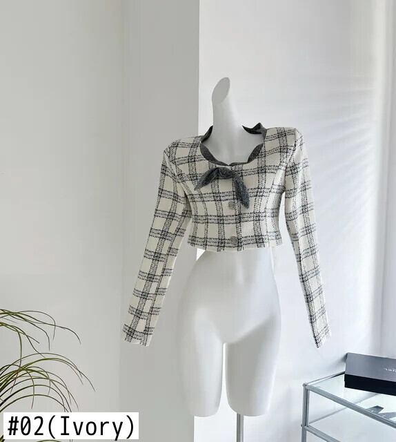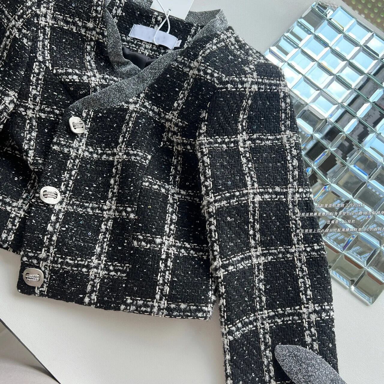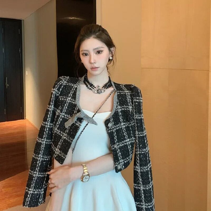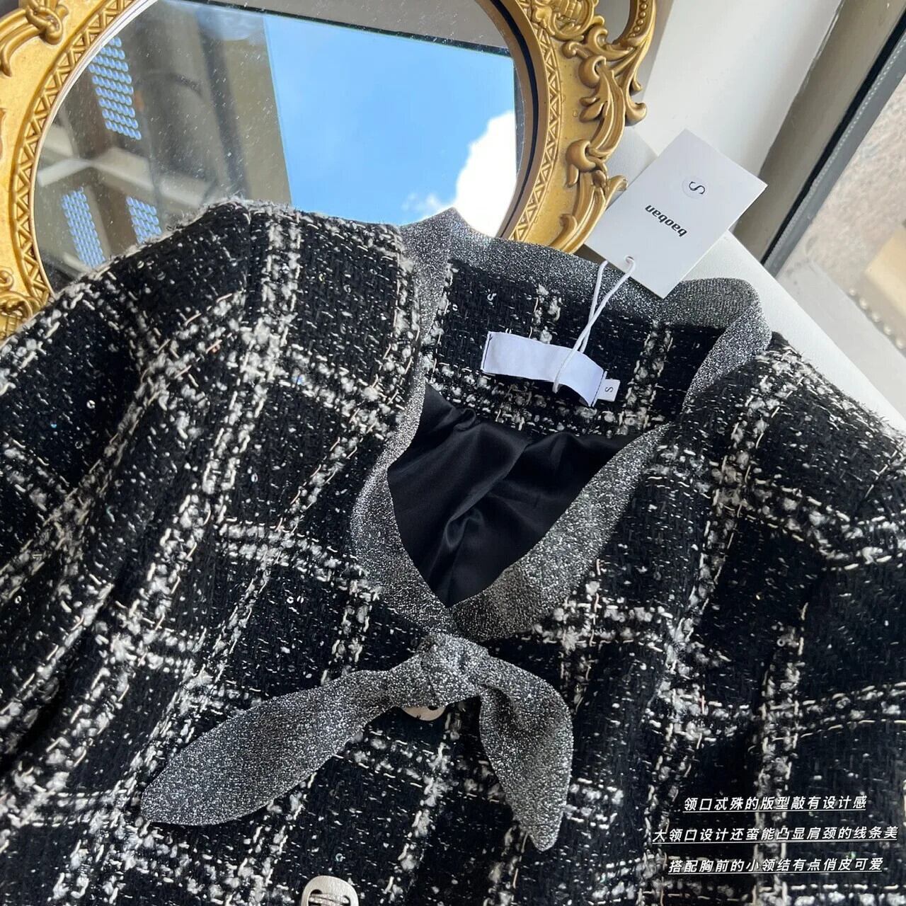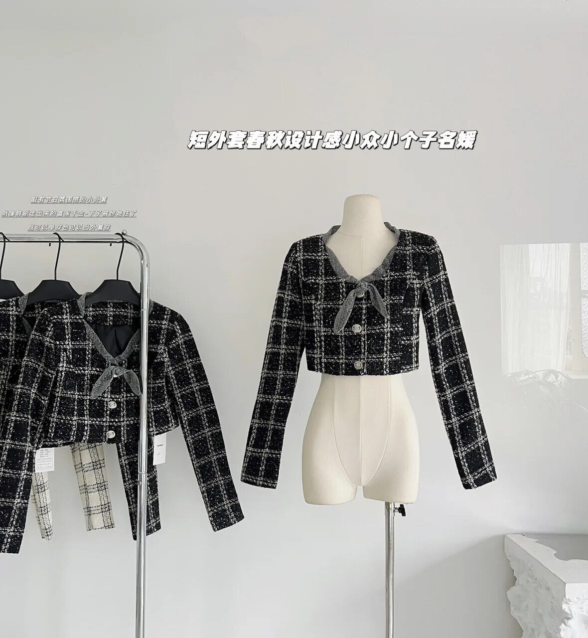 秋冬ウールブレンドツイードリボンショートコートシングルブレストチェック柄トップ甘い Y2K ストリート生き抜くジャケット 大人ガーリー スウィート キュート カジュアル ウィンター 冬物