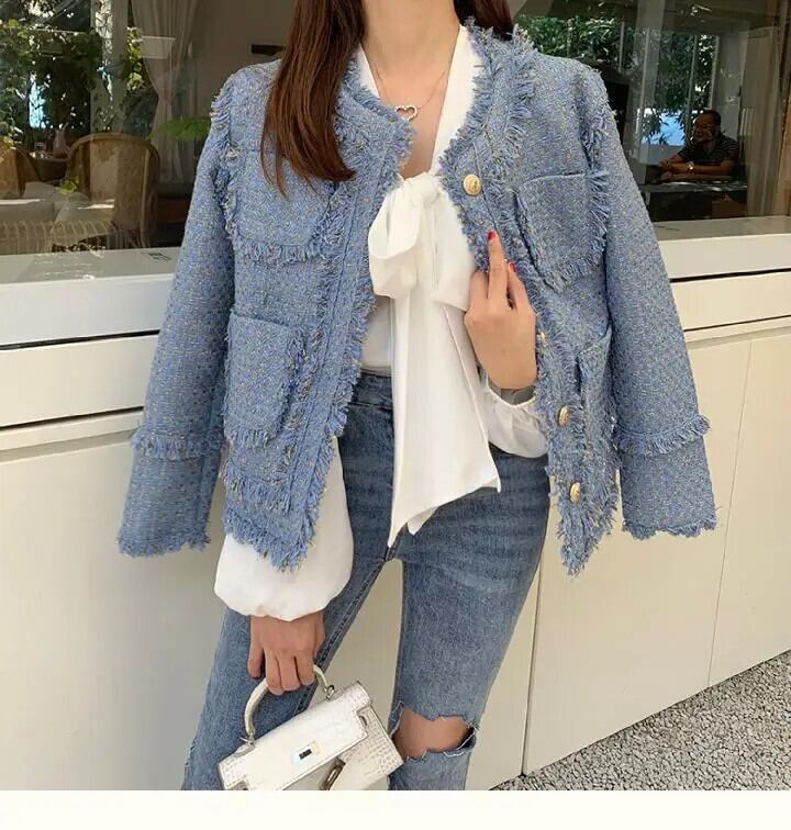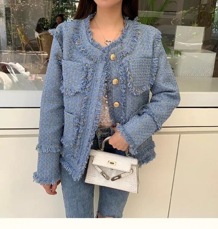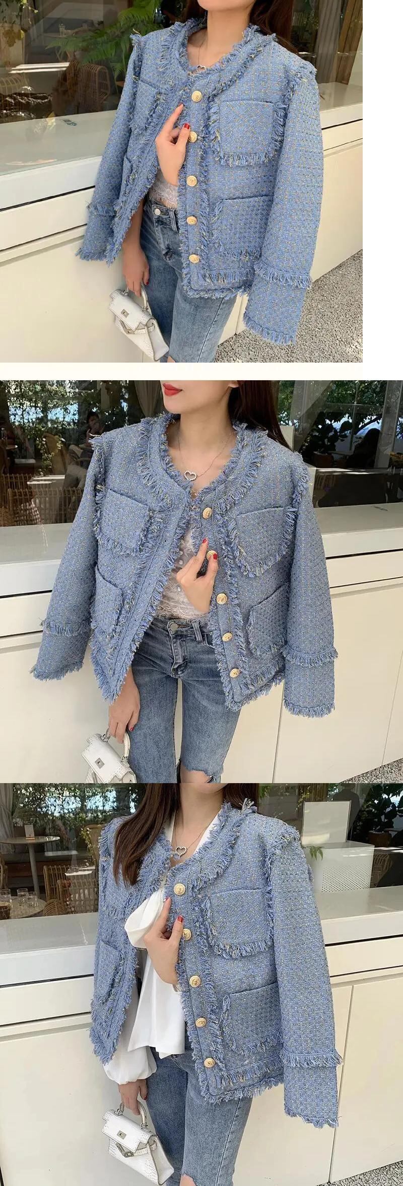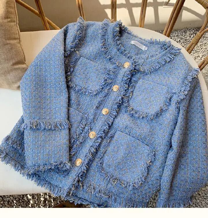 シック冬ツイード フリンジ ビーズ ジャケット ブルー ウール コート ウィンター 冬物