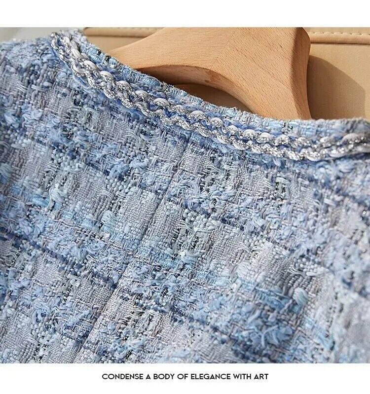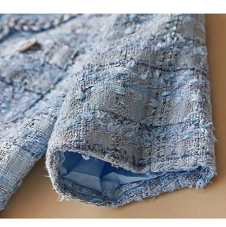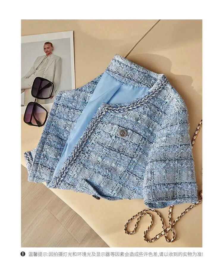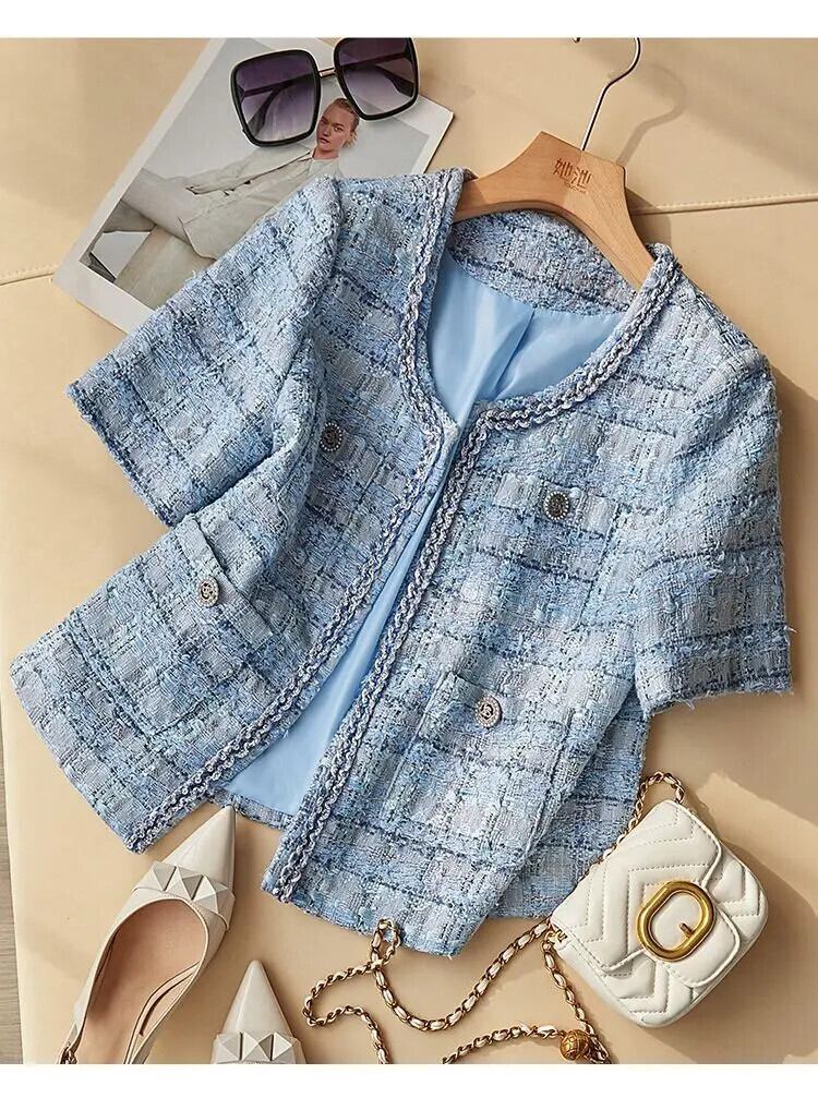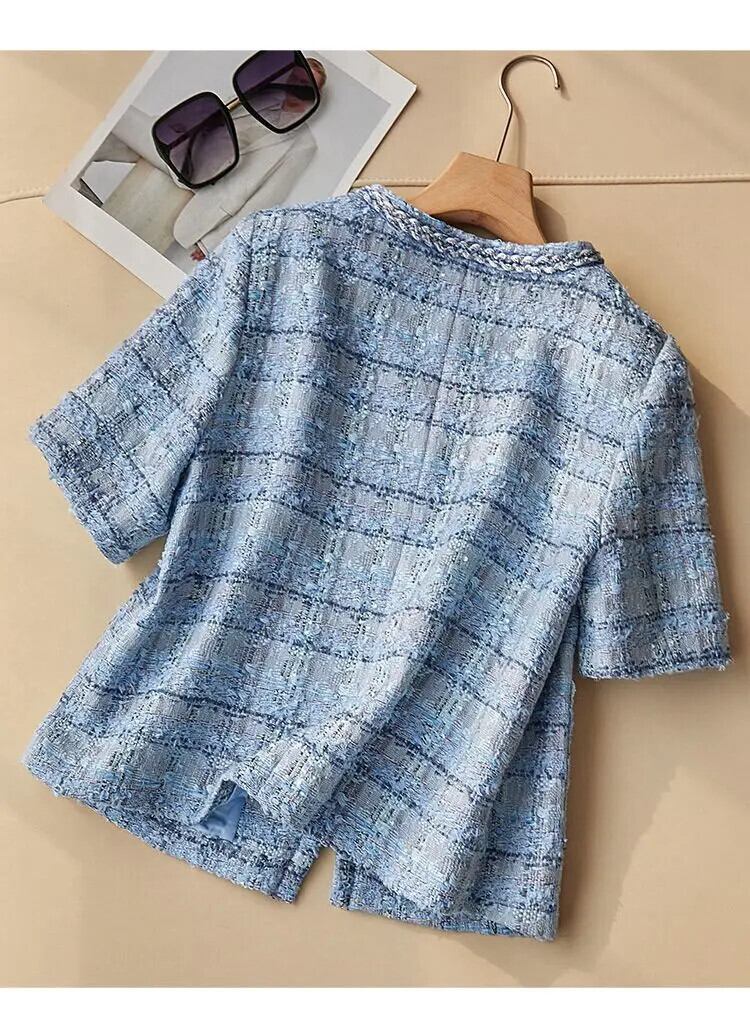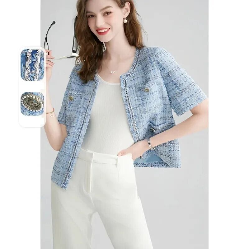 夏ブルーショートラウンドネックコートアウタージャケット サマー 夏物 Oネック