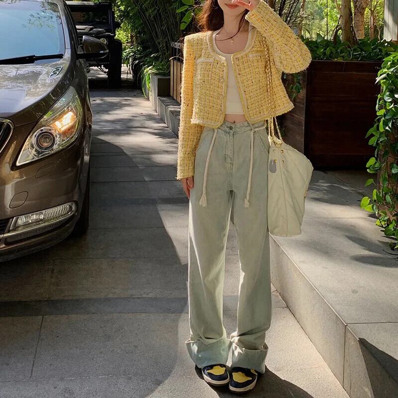 秋冬高級イエローツイードジャケットフレグランスウールショートコート甘い生き抜く Casaco 大人ガーリー スウィート キュート カジュアル オータム 秋物 ウィンター 冬物