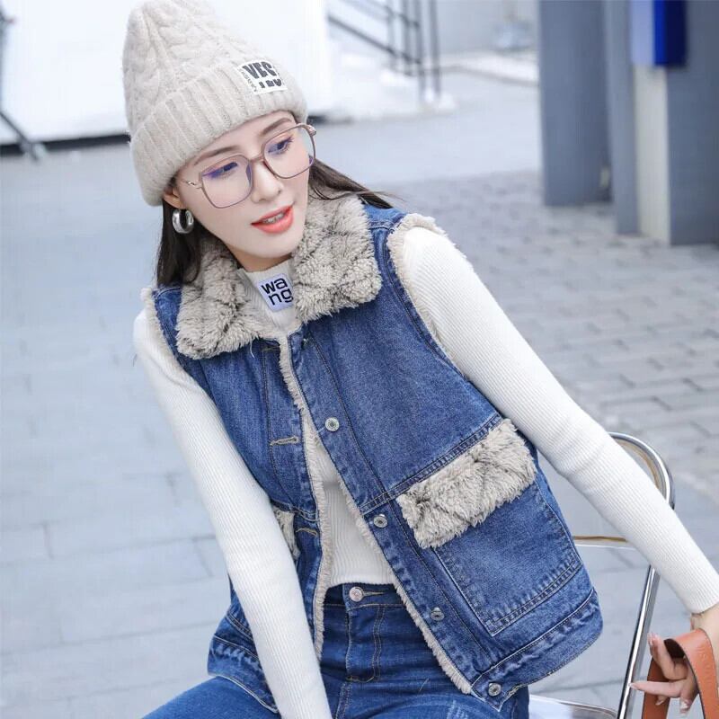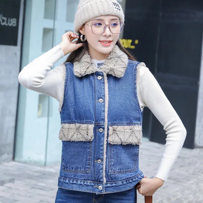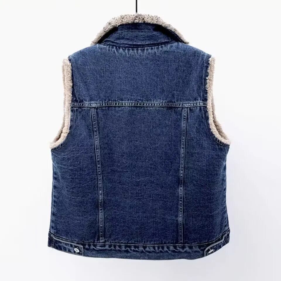 レトロブルーぬいぐるみ肥厚デニムベストノースリーブぬいぐるみカウボーイコート