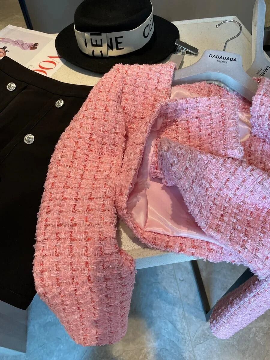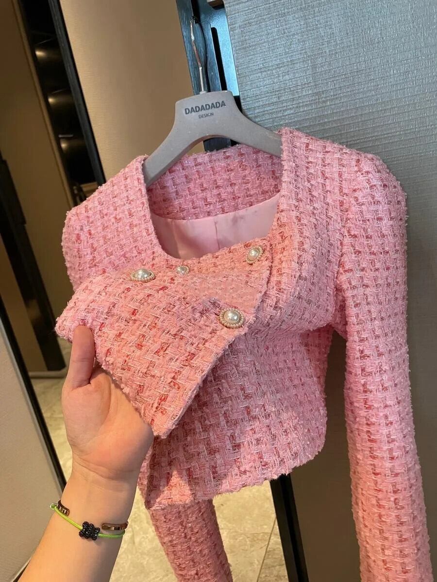 ピンクスクエアネックパールボタン明るいツイード香りコート秋ジャケット オータム 秋物 シルク 真珠 スクウェア