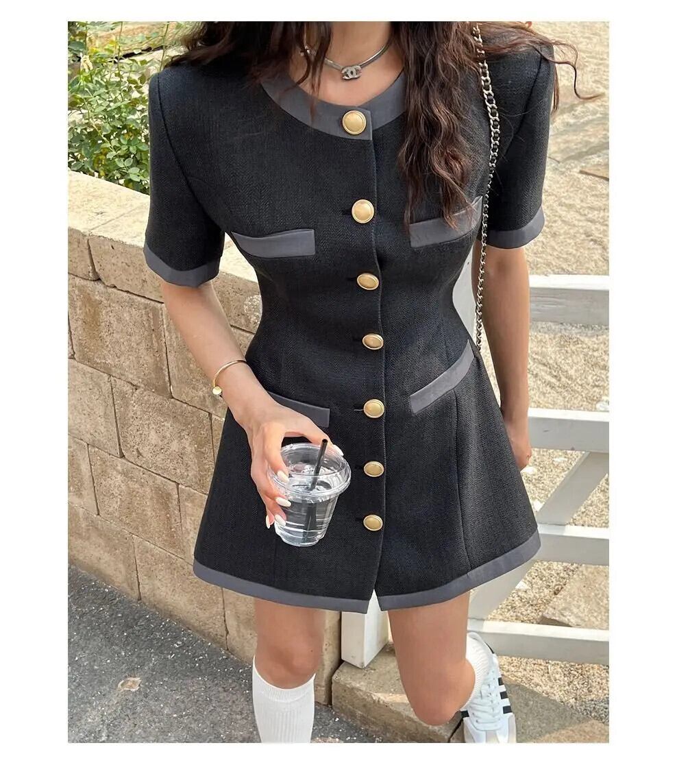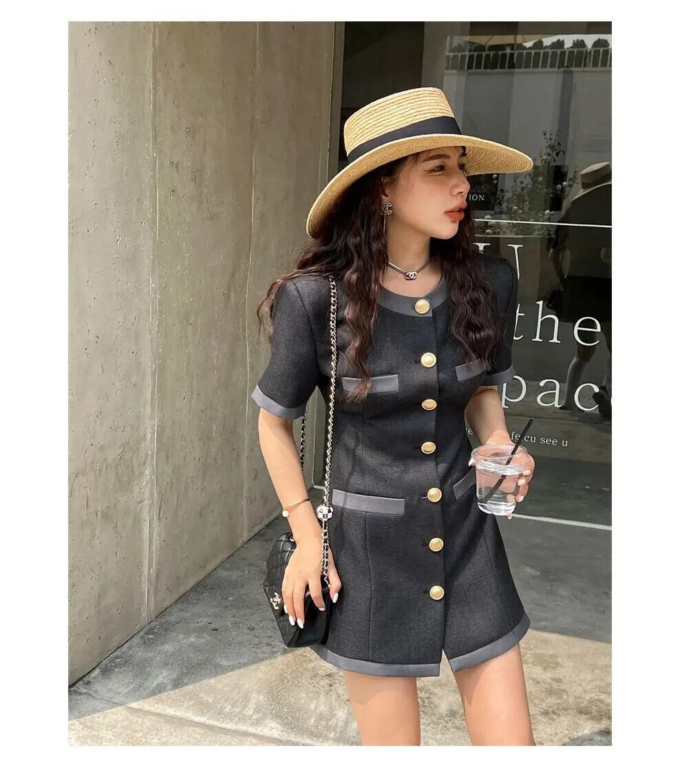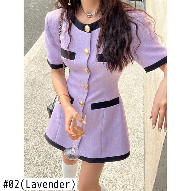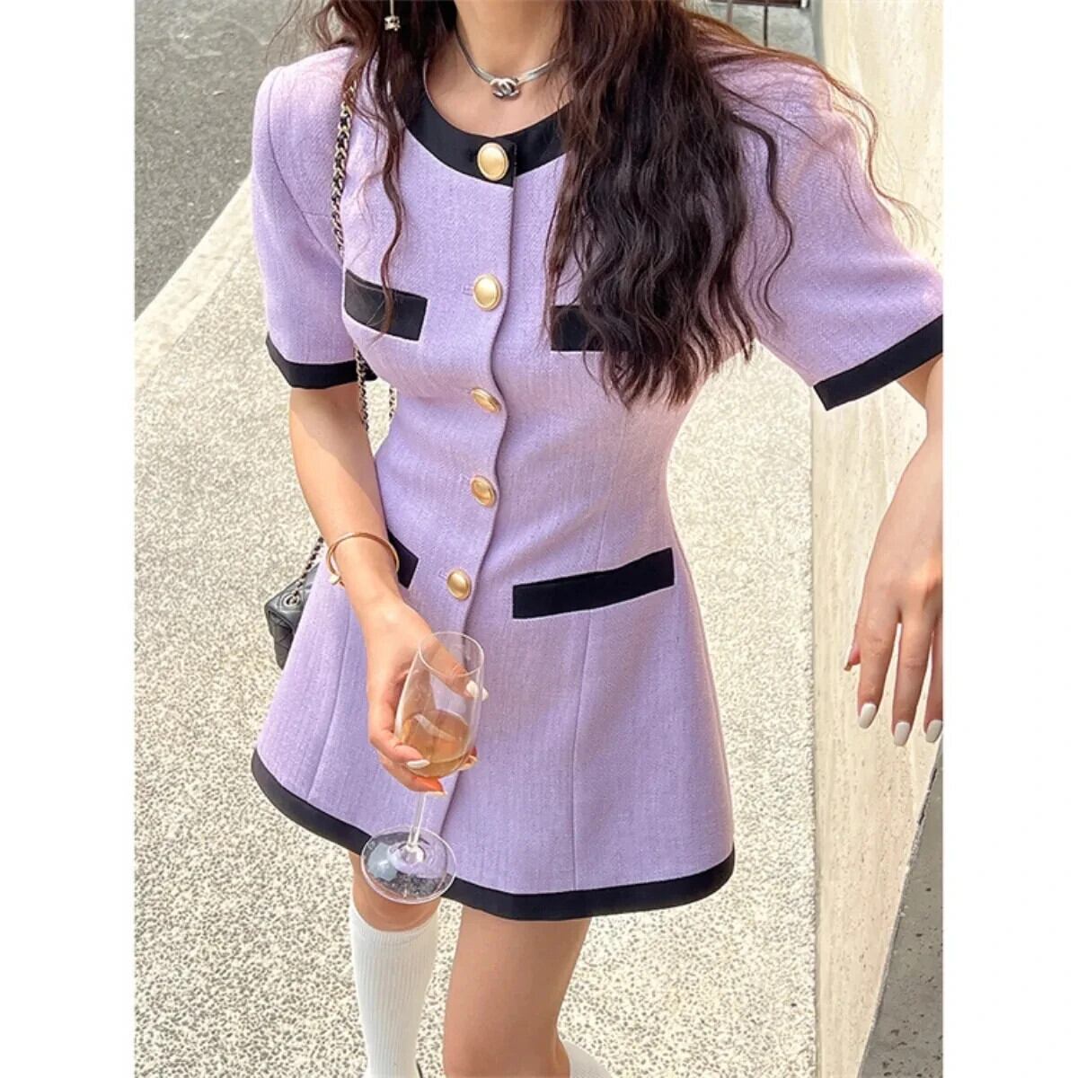 夏紫黒ラウンドネックスーツドレスシングルボタン Vestidos ブラック サマー 夏物 Oネック パープル