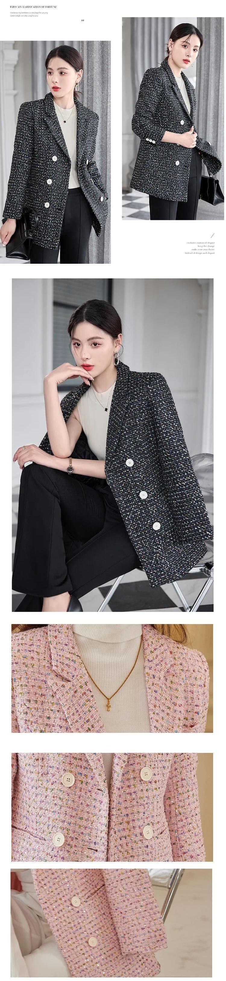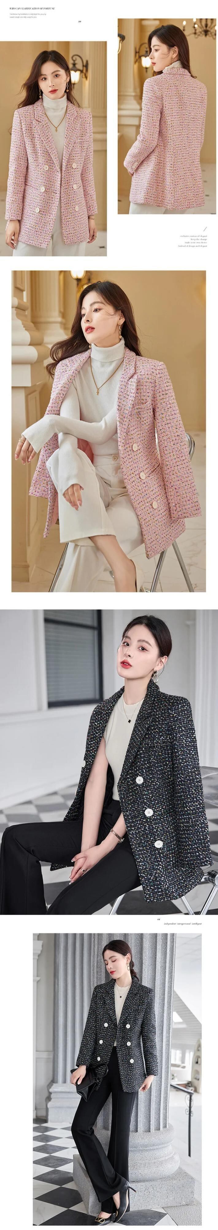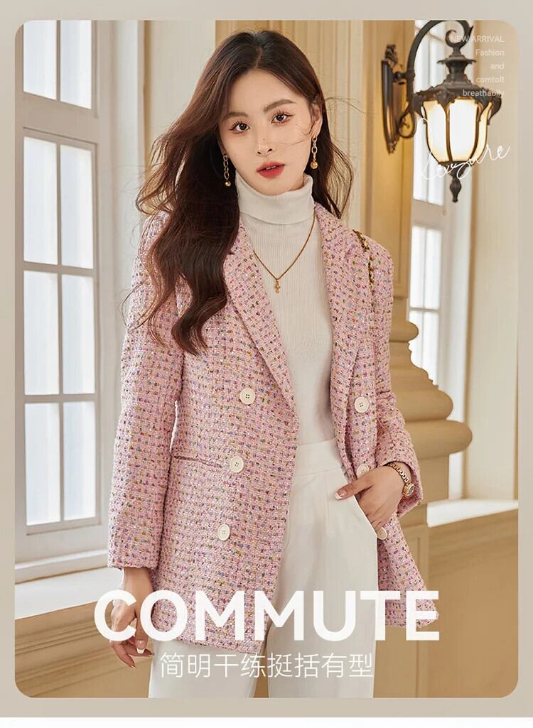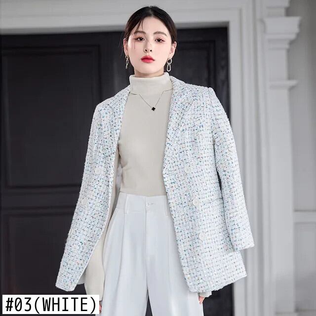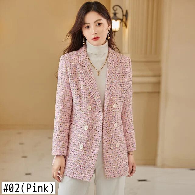 冬/秋追加綿厚みブレザーツイードジャケットダブルブレストオフィスレディピンク黒白スーツコート ホワイト ブラック コットン オータム 秋物 ウィンター 冬物 会社 学校 通勤や通学にも