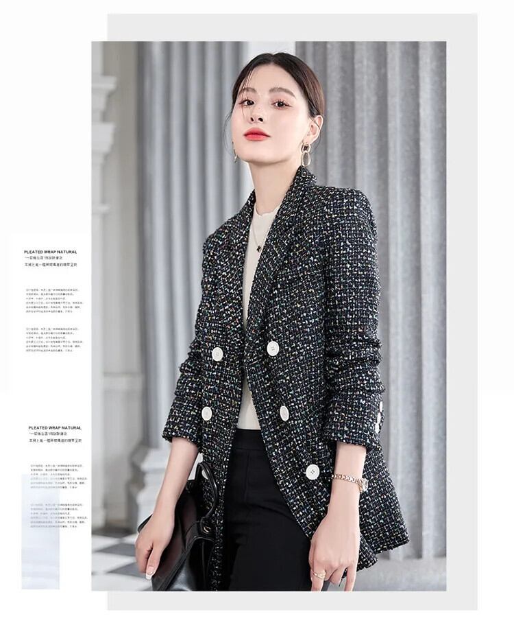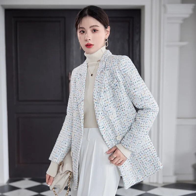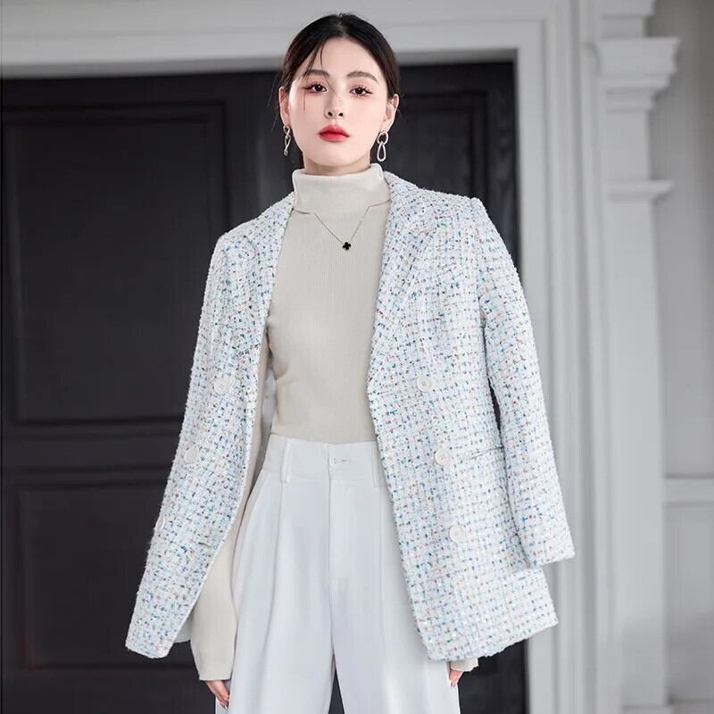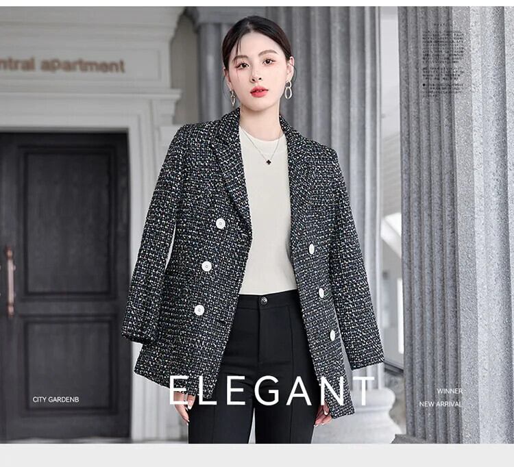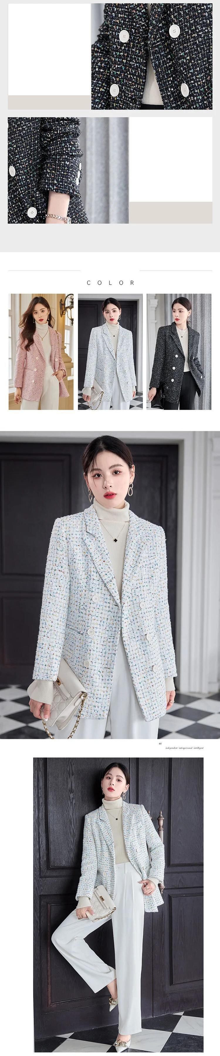 冬/秋追加綿厚みブレザーツイードジャケットダブルブレストオフィスレディピンク黒白スーツコート ホワイト ブラック コットン オータム 秋物 ウィンター 冬物 会社 学校 通勤や通学にも